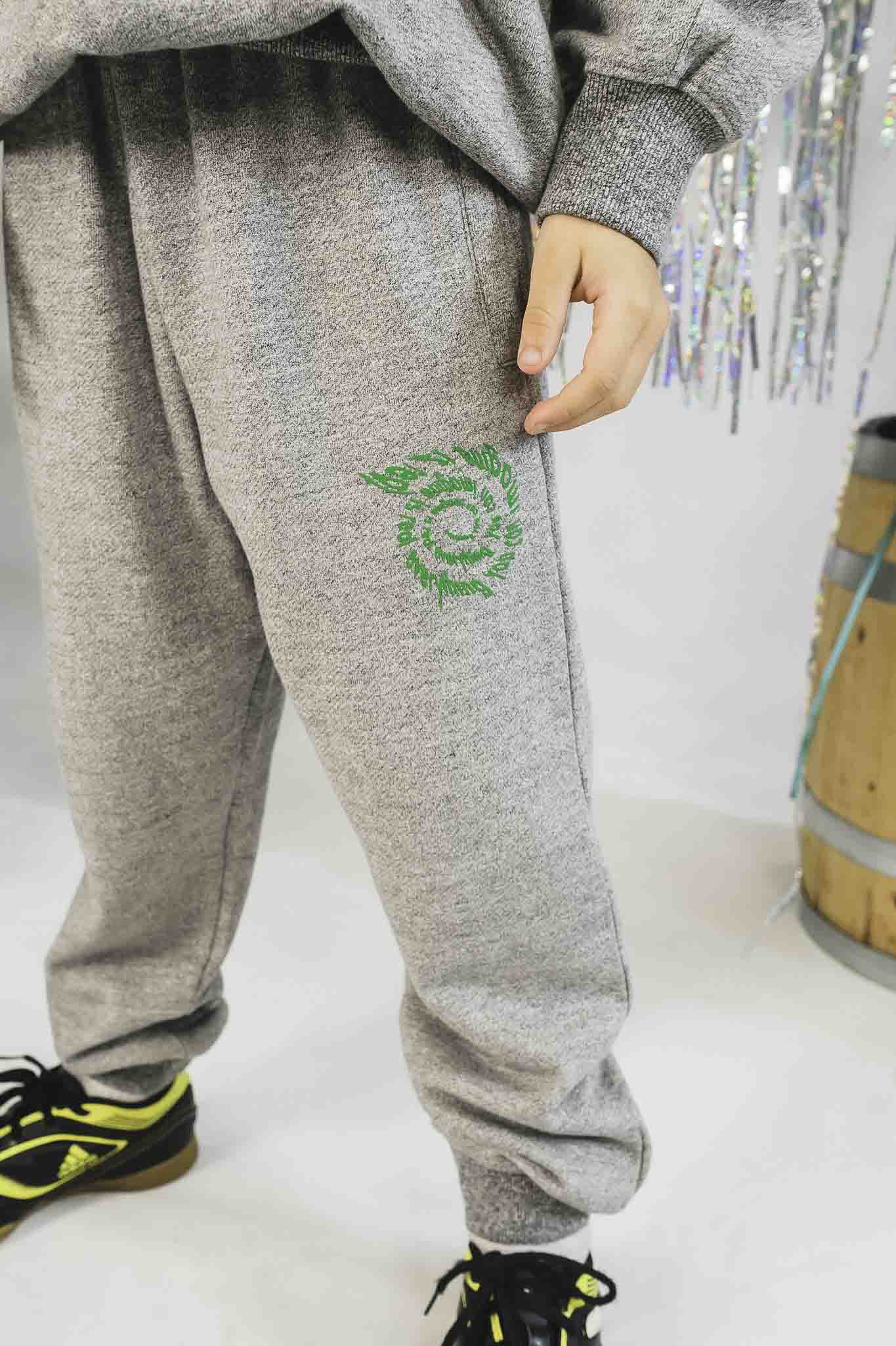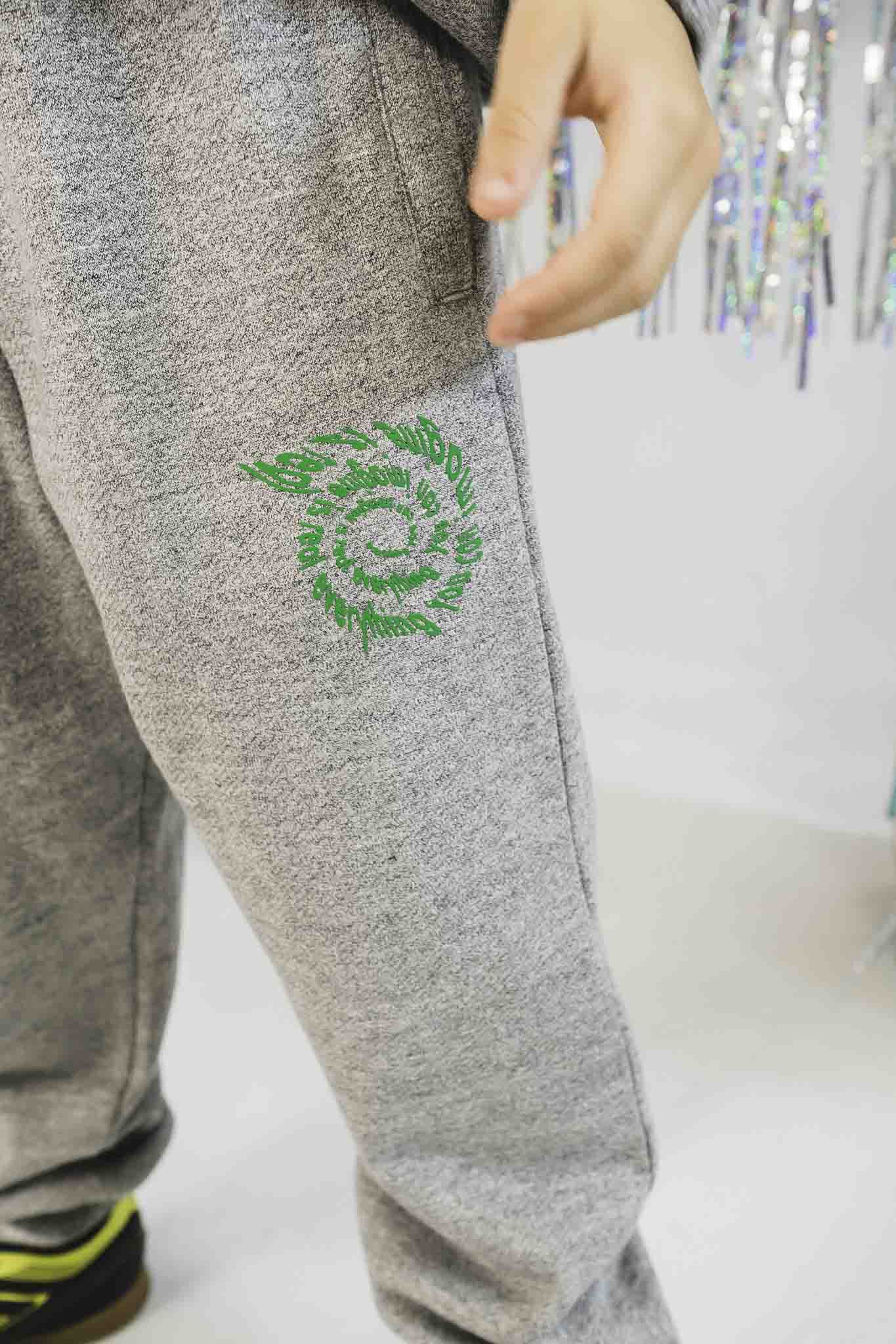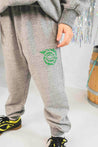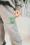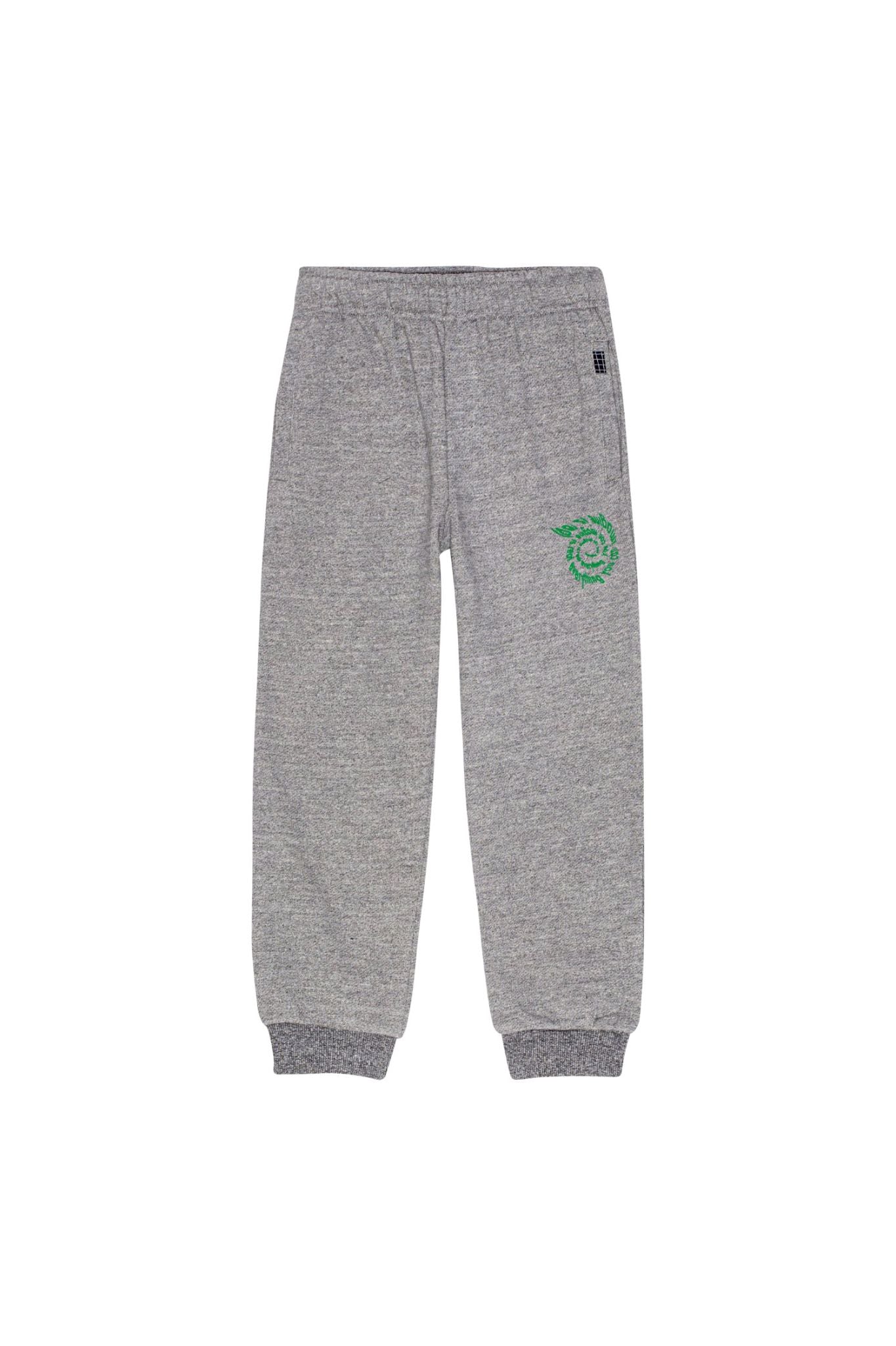 These ultra-cool sweatpants from Molo come in a heather grey hue and feature an elastic waistband. Green spiral lettering beneath the side pocket makes for a bold and interesting detail.