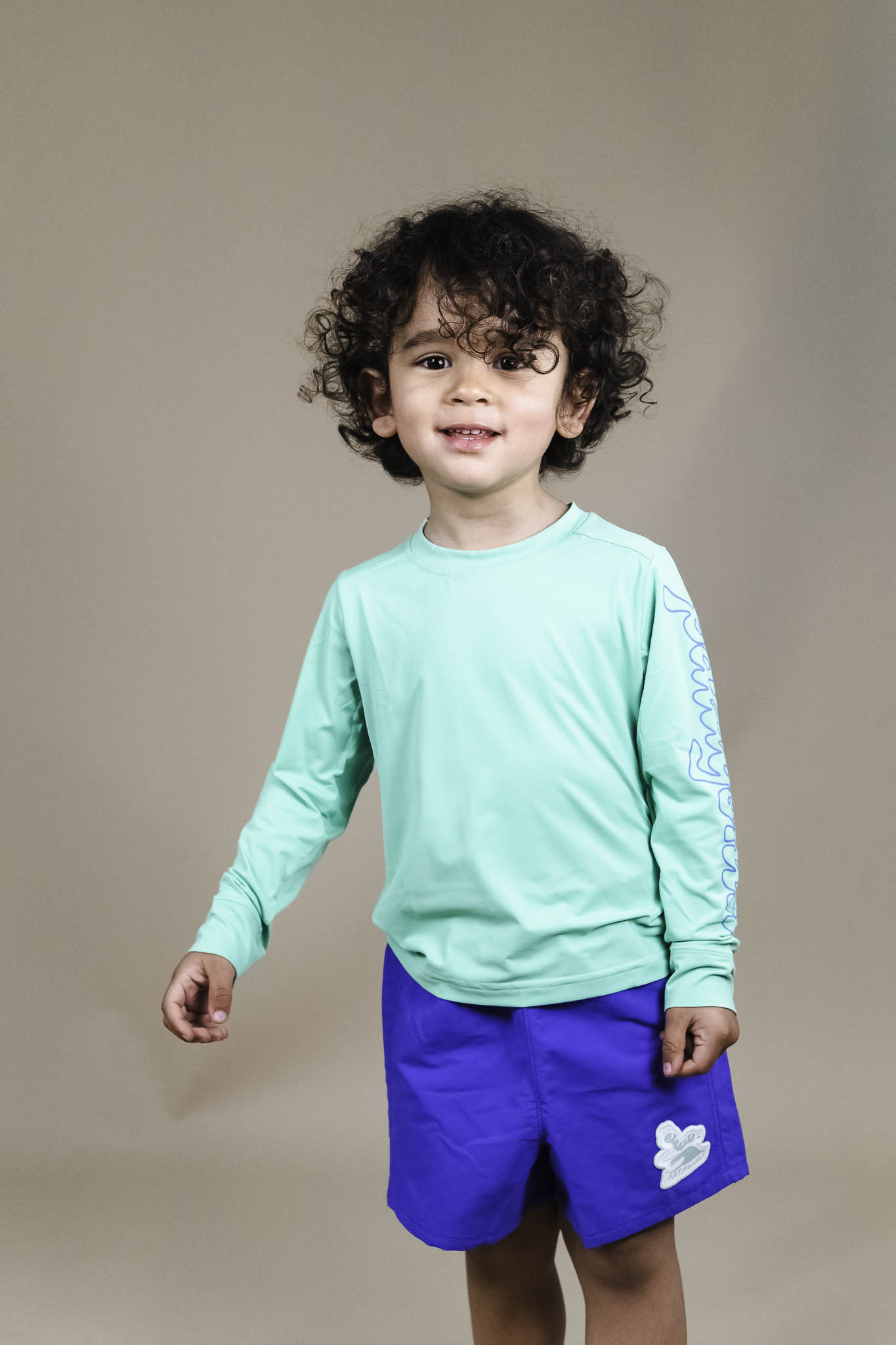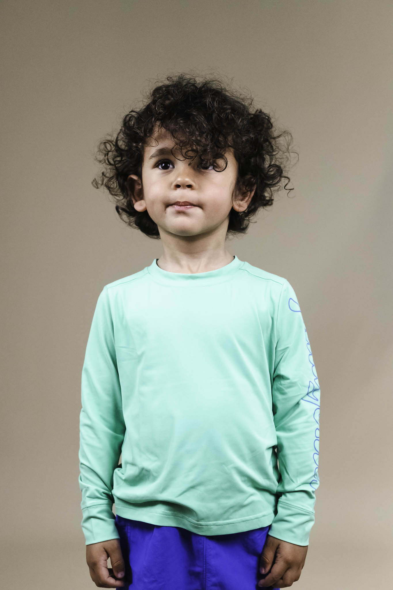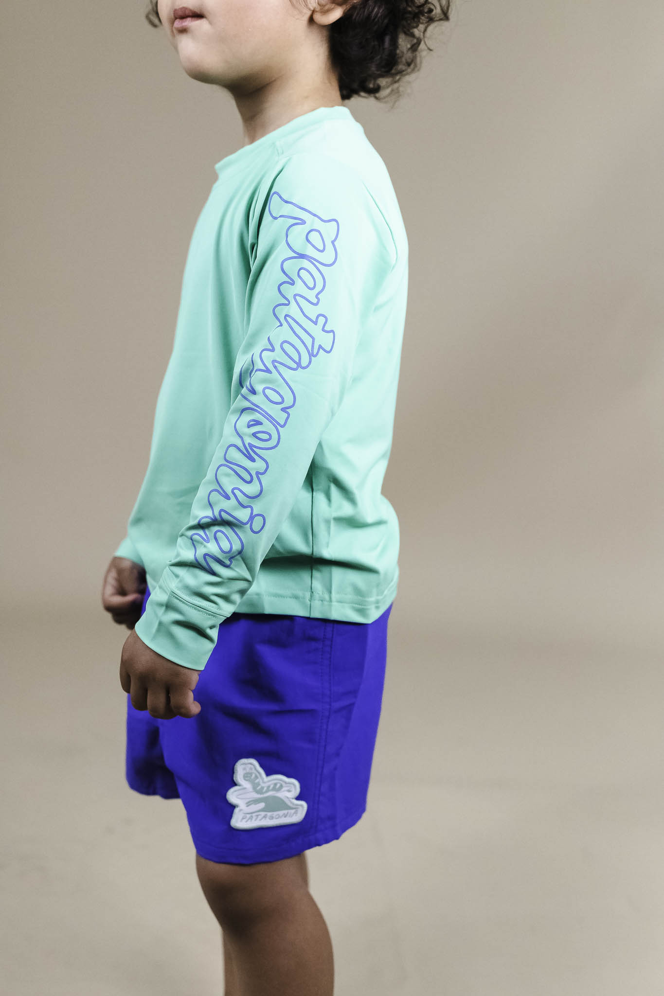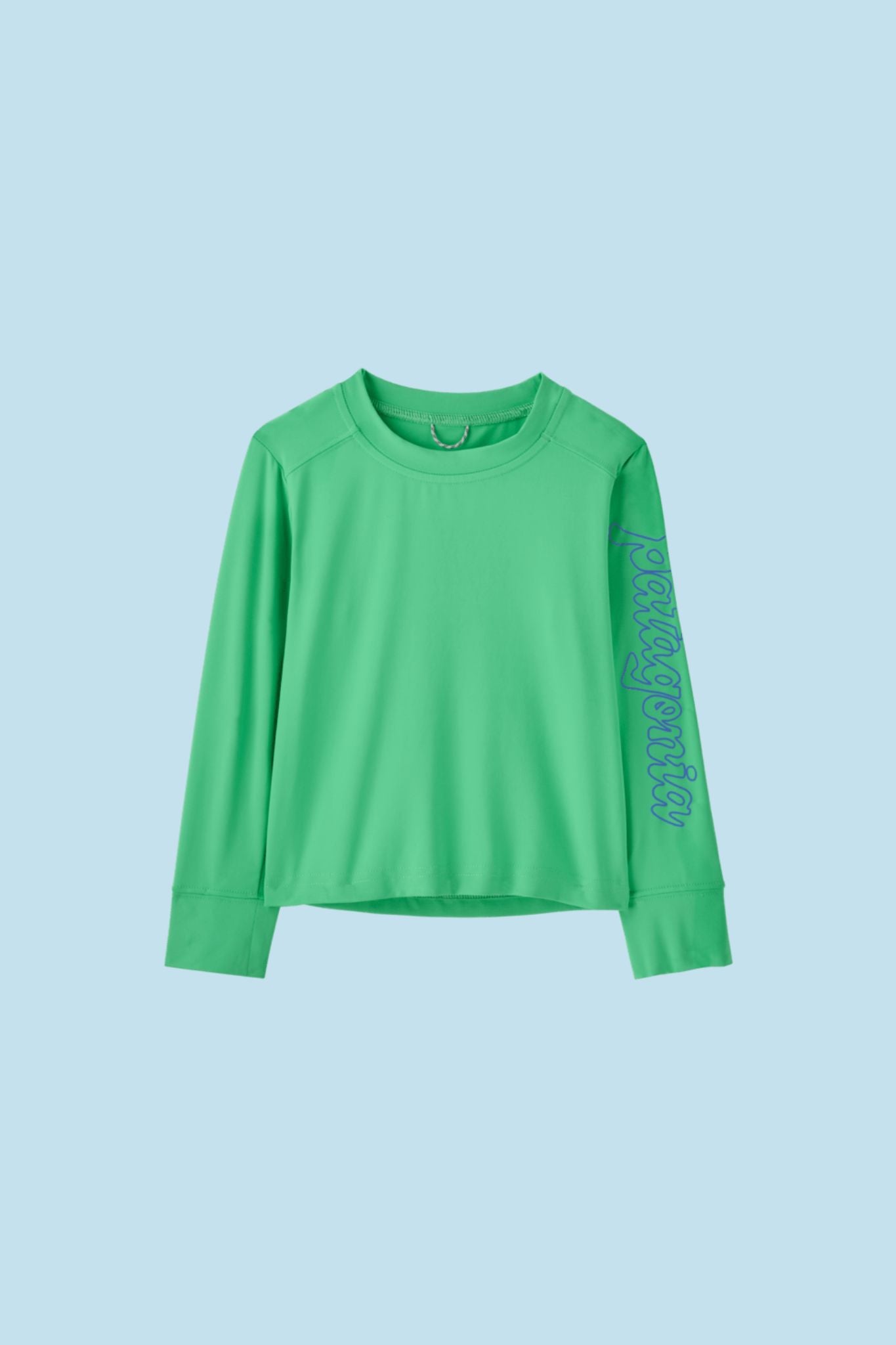 This vibrant green t-shirt by Patagonia is perfect for your little one! It features long sleeves, the brand name printed on one sleeve, and a breathable fabric. Add a pair of shorts and sneakers for an easy outfit.