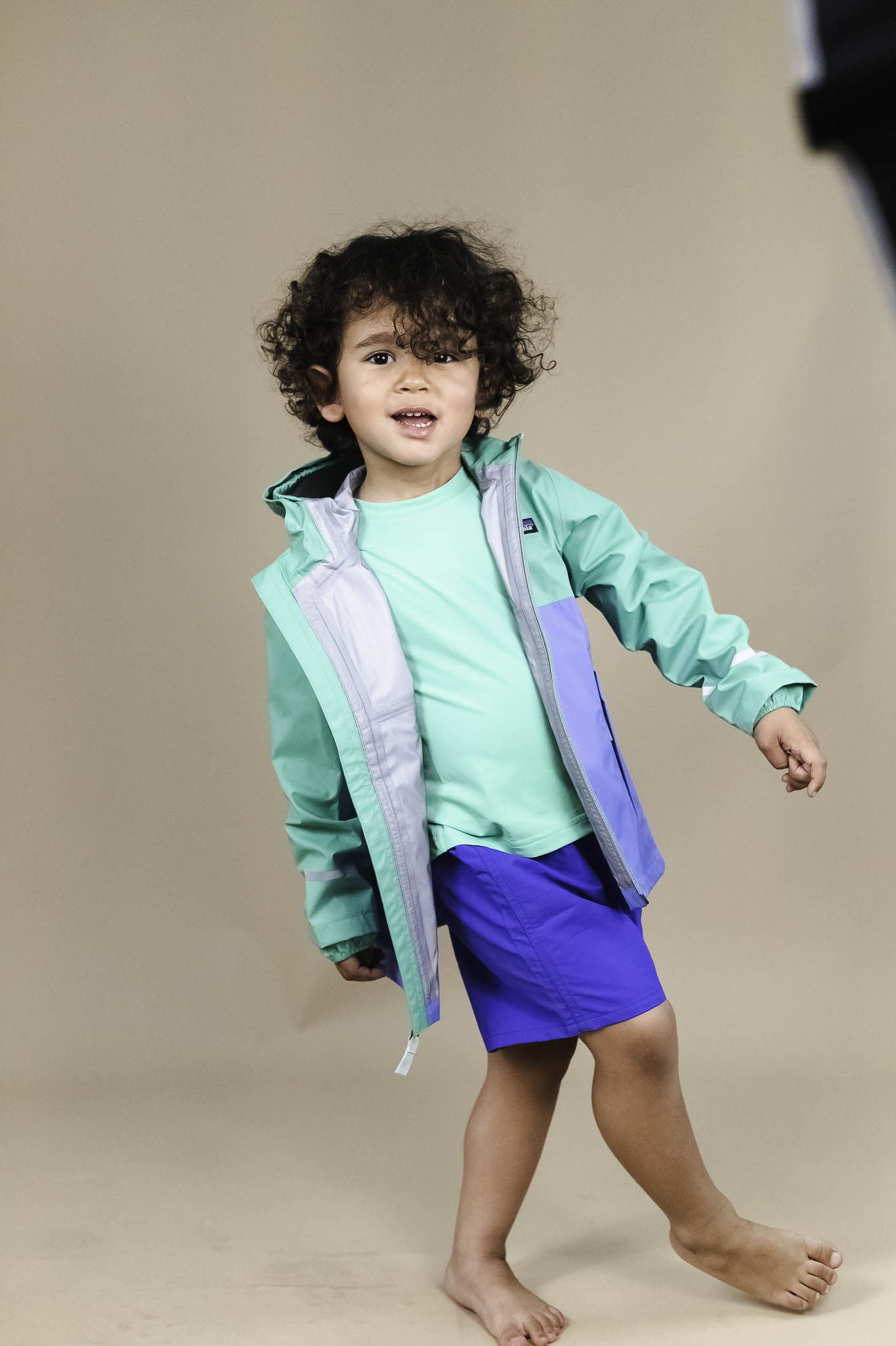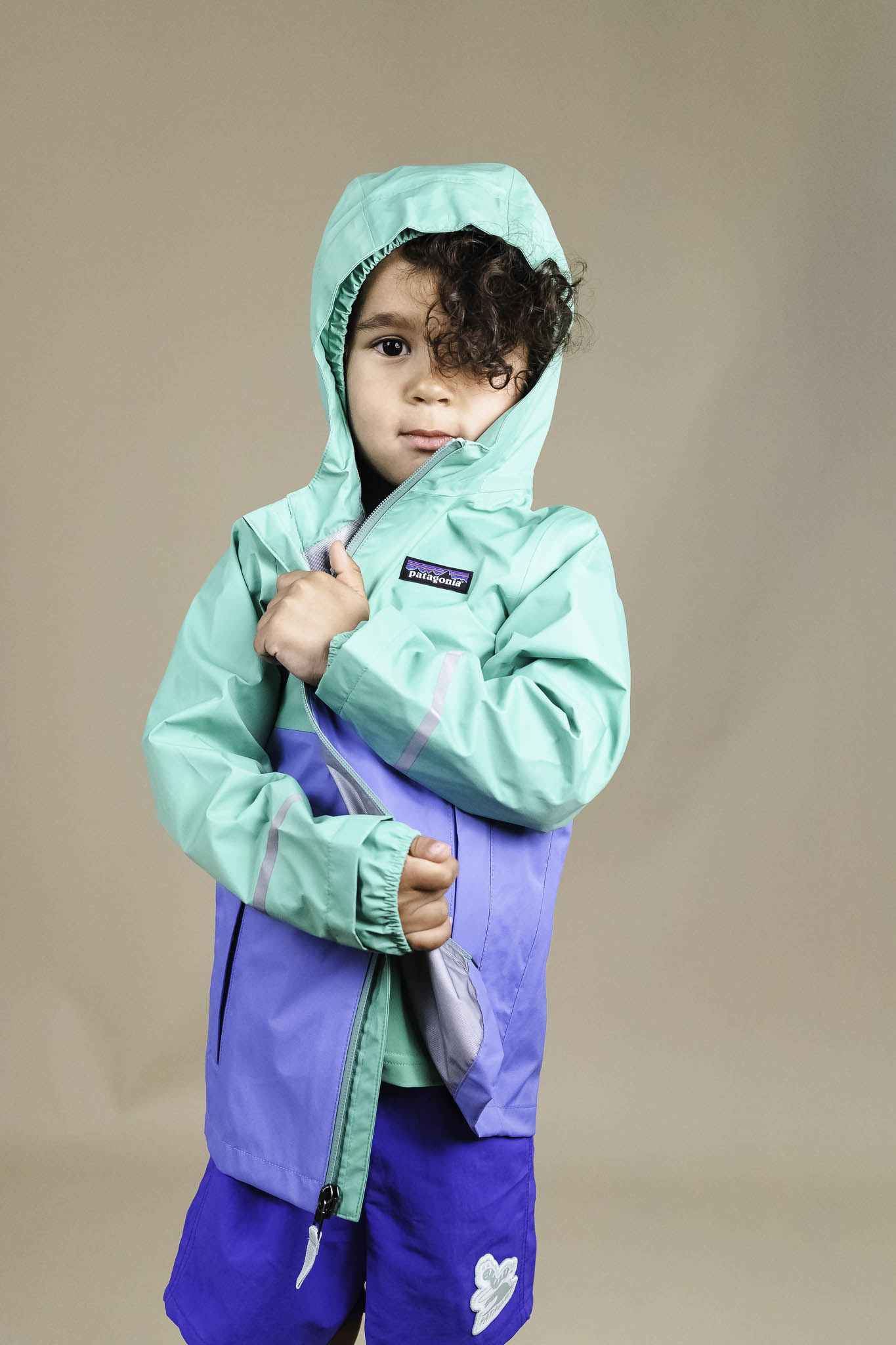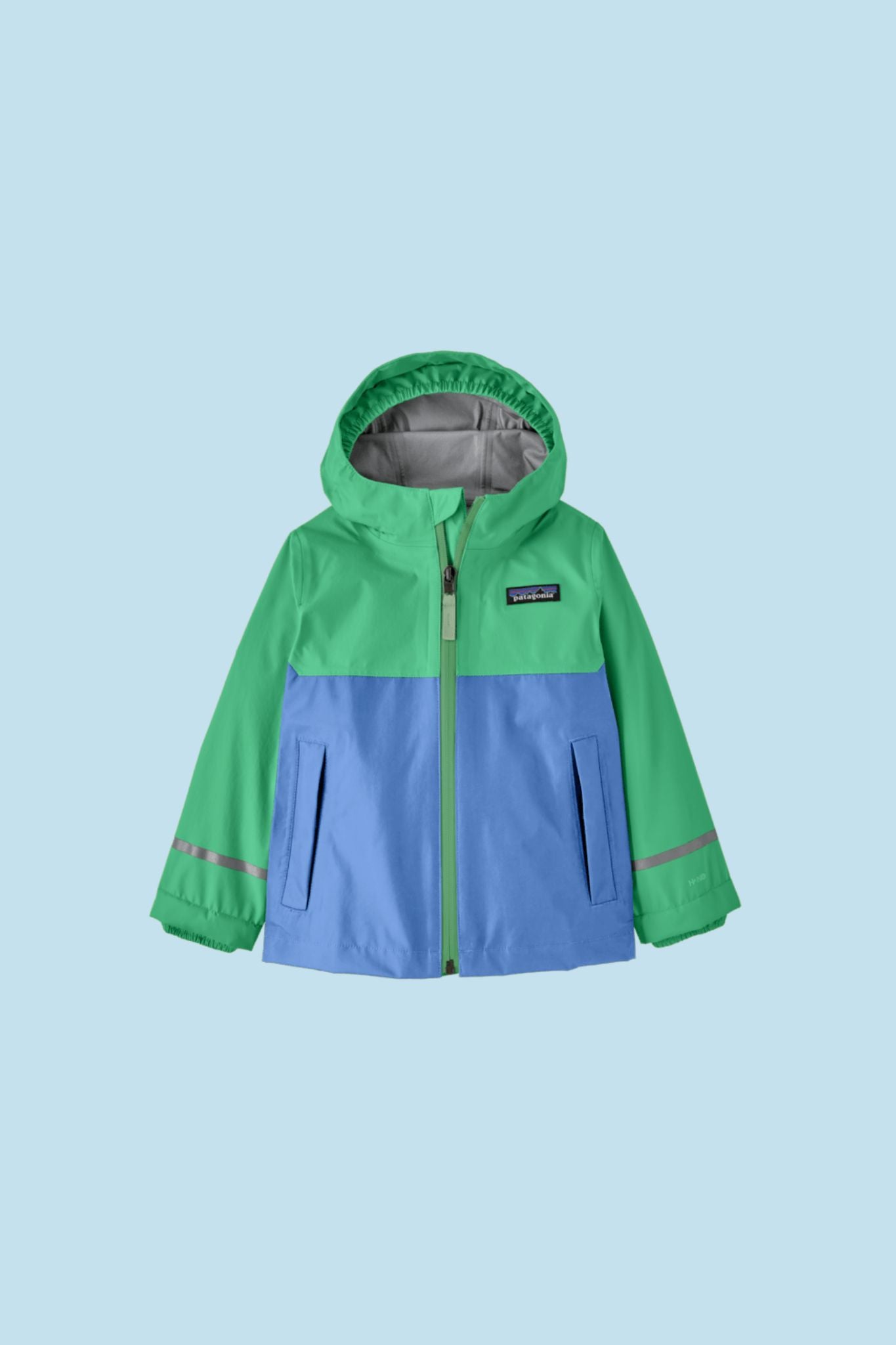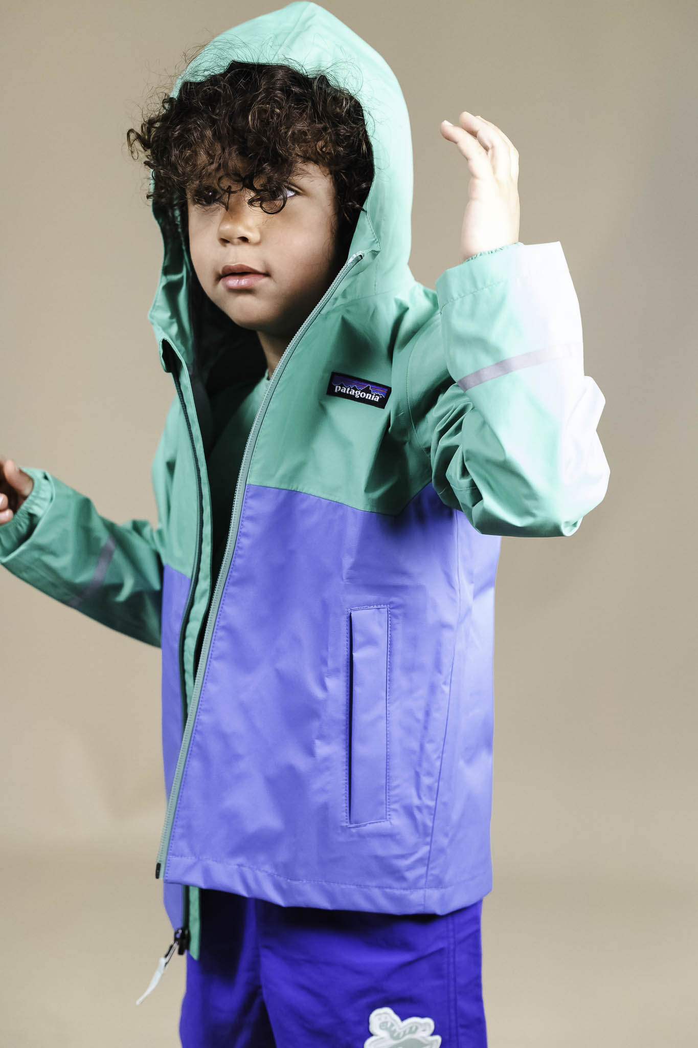 Gear up for a rainy day with this green-and-blue rain jacket from Patagonia! Made in a fair-trade factory from recycled nylon, it features a hood, center front zipper, and slit pockets.