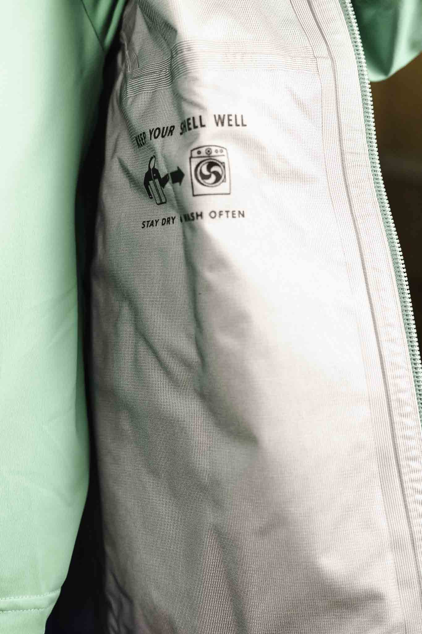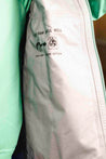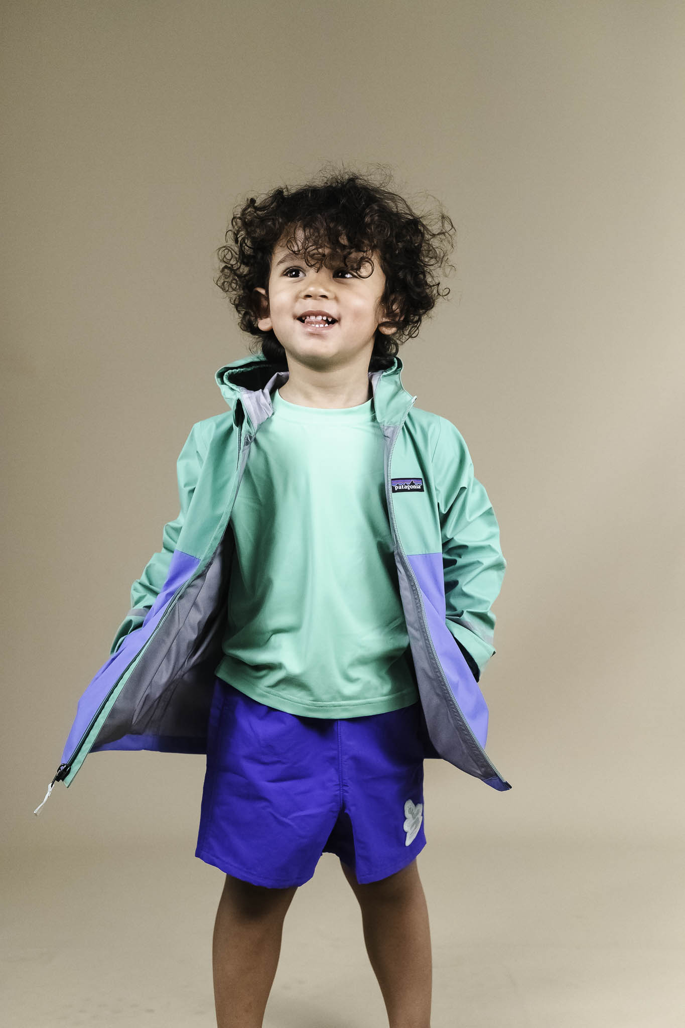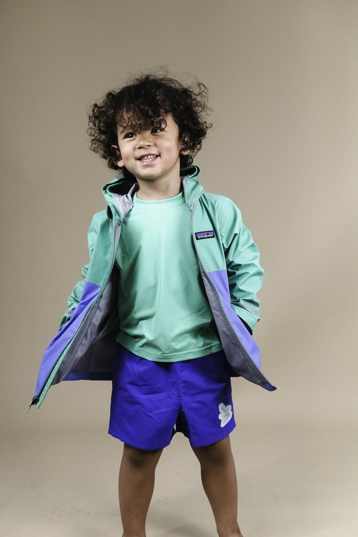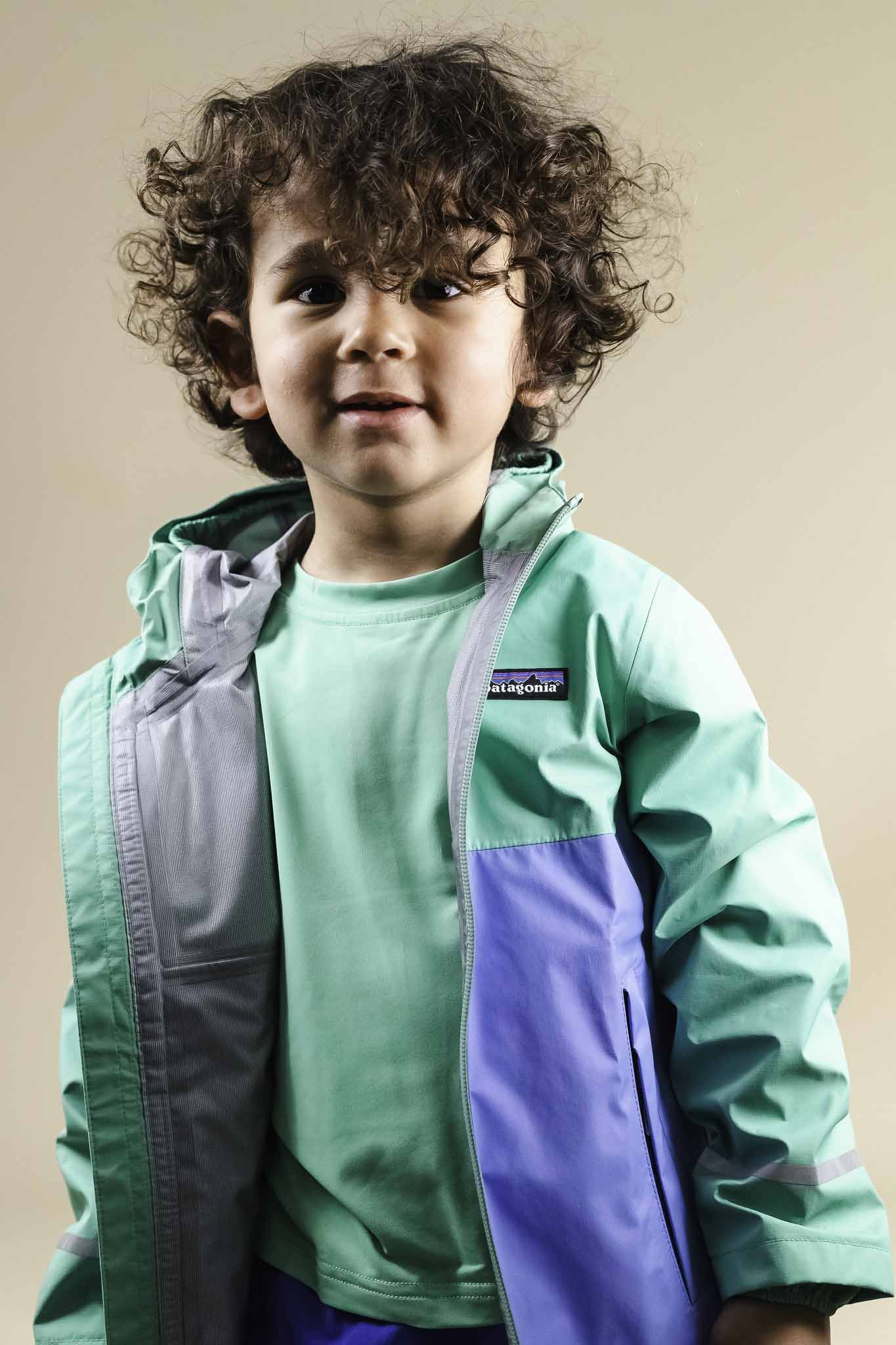 Gear up for a rainy day with this green-and-blue rain jacket from Patagonia! Made in a fair-trade factory from recycled nylon, it features a hood, center front zipper, and slit pockets.