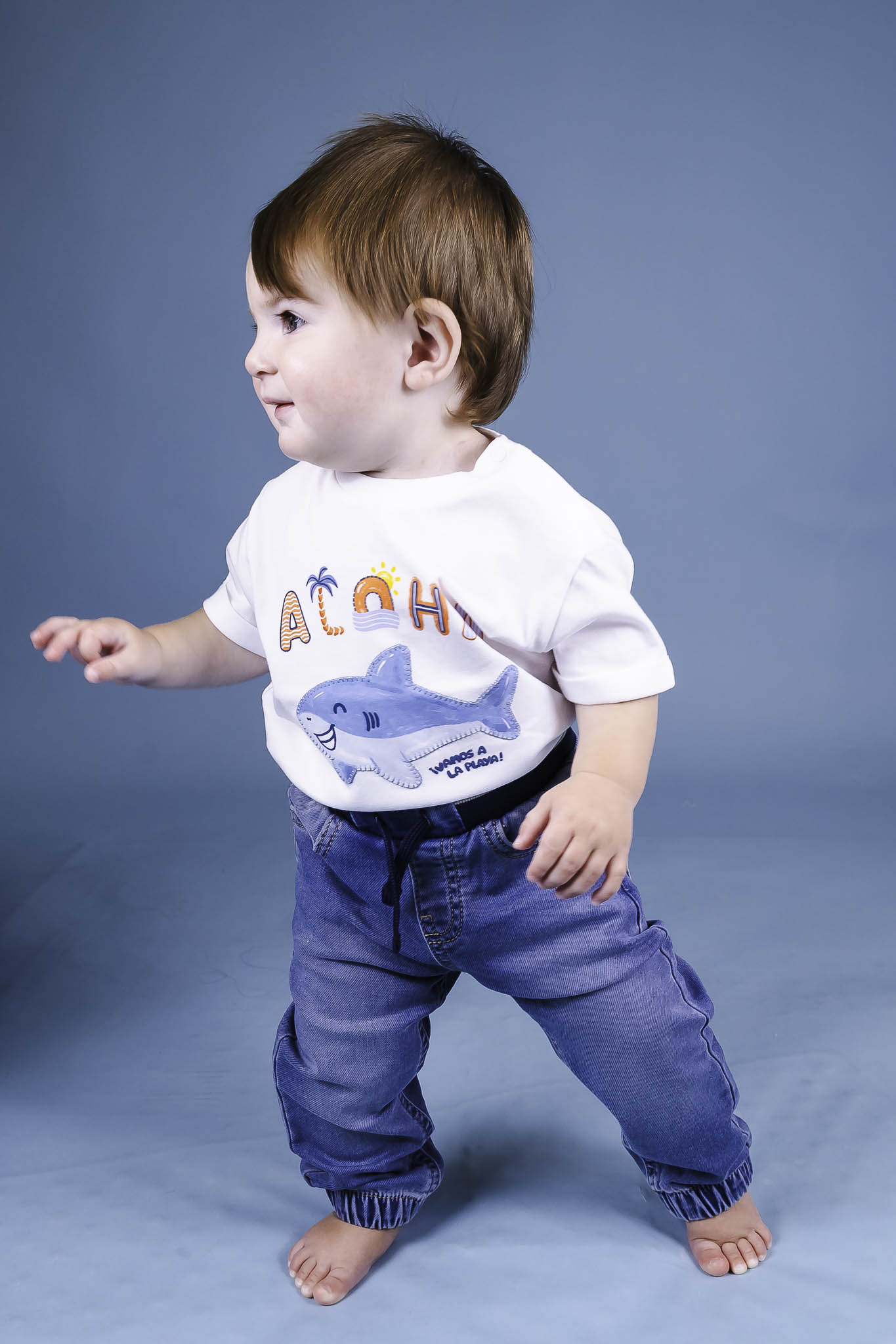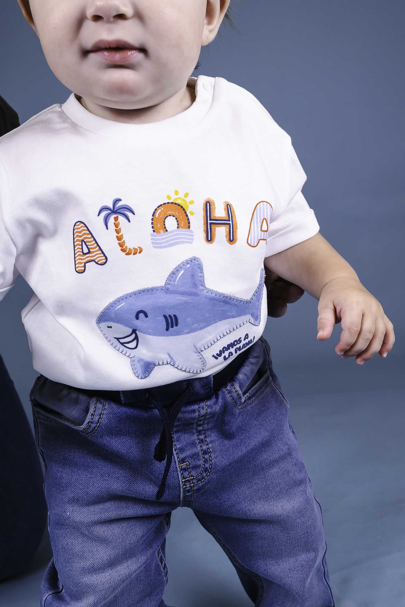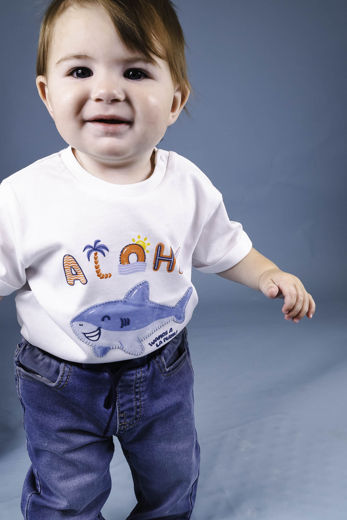 Bring in sweet summertime with this adorable graphic t-shirt from Mayoral! It features a shark and the word 'aloha' written across the front.