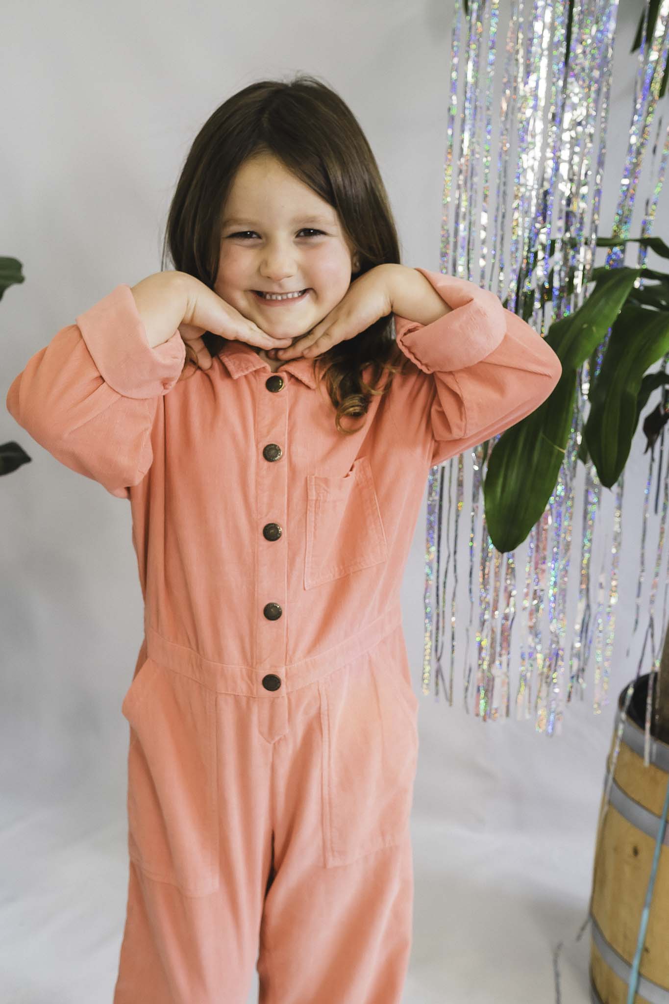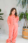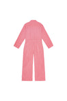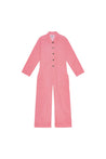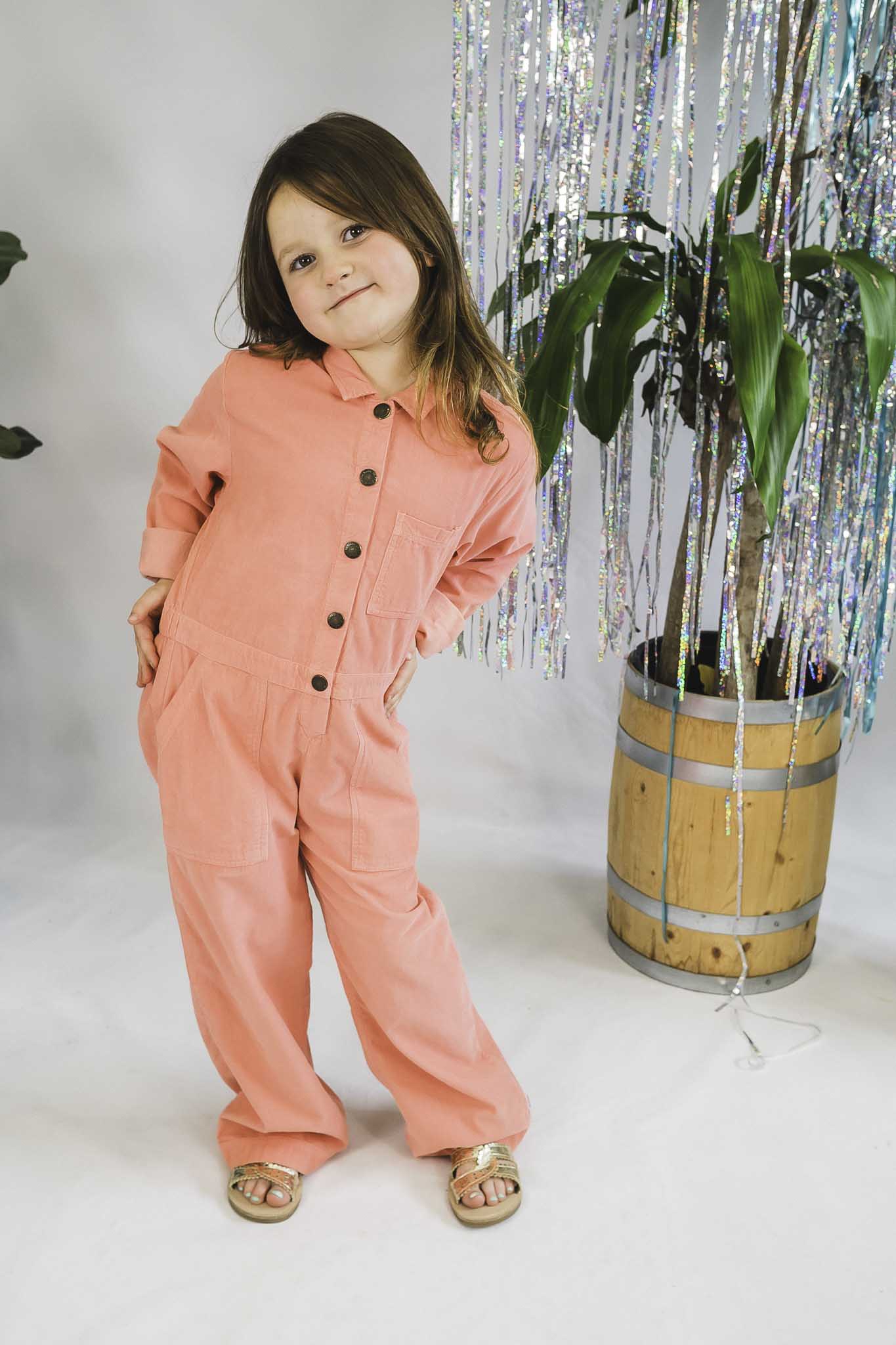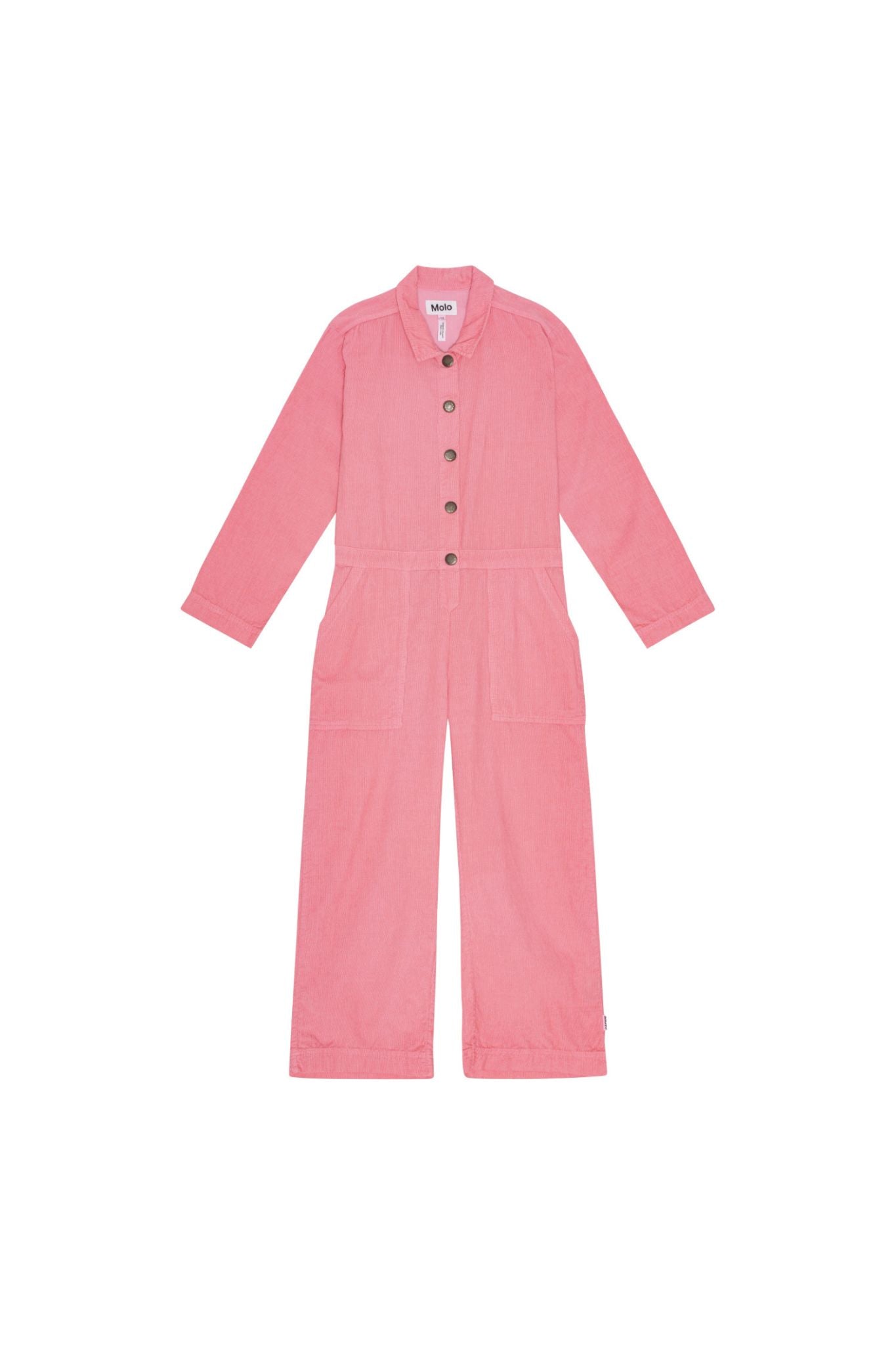 This bright pink, button-down jumpsuit by Molo is a must have piece for your little fashionista. It features a collar and bucket pockets on the frontal hips.
