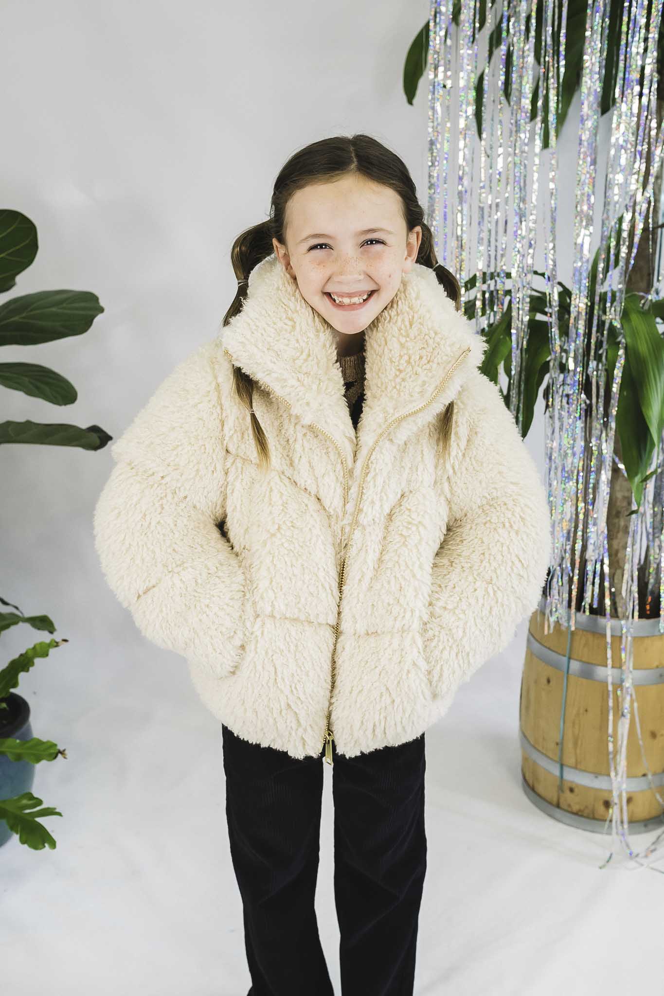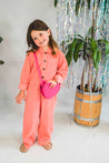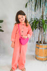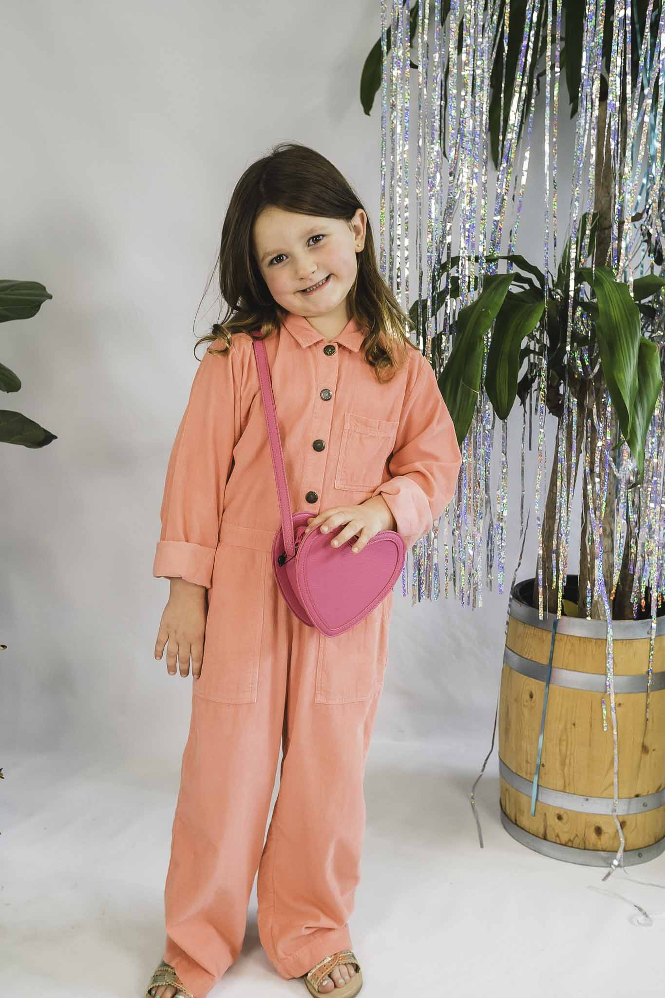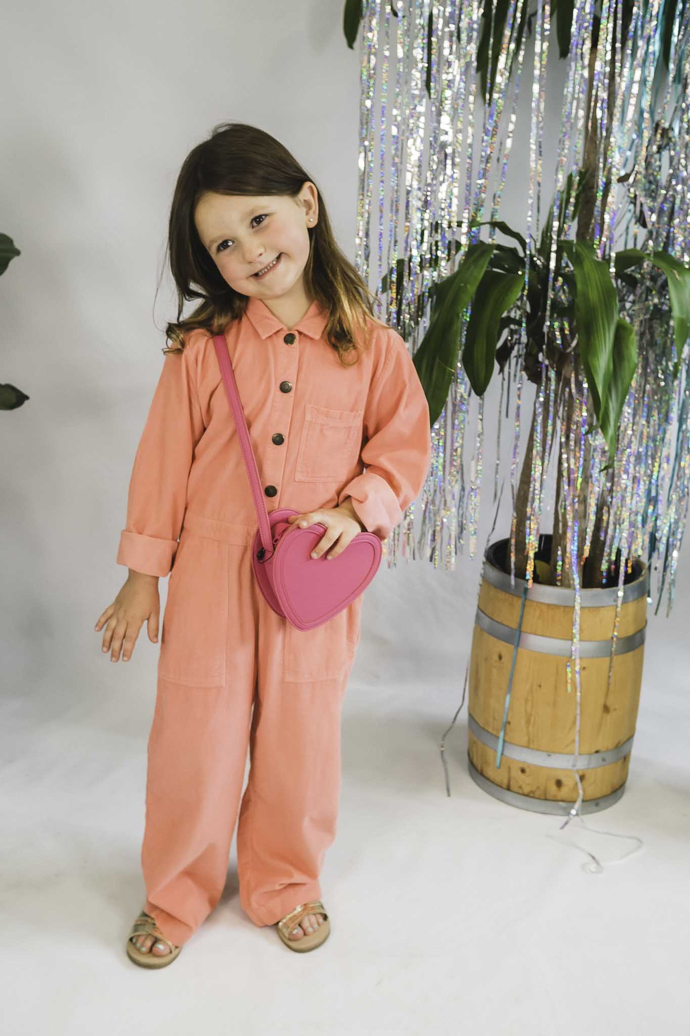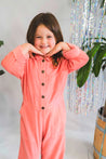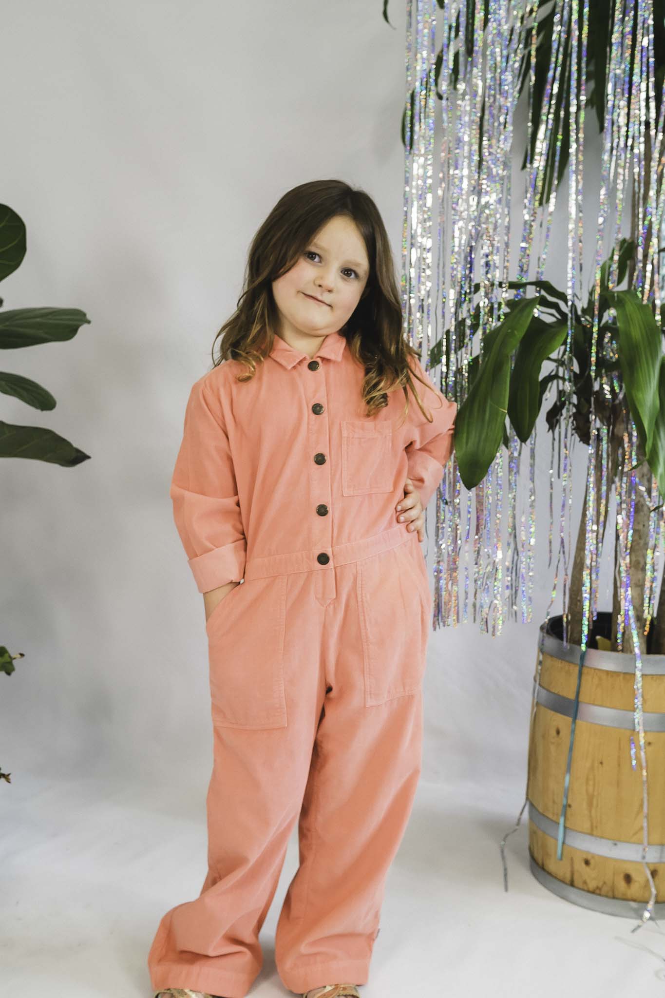 This bright pink, button-down jumpsuit by Molo is a must have piece for your little fashionista. It features a collar and bucket pockets on the frontal hips.