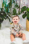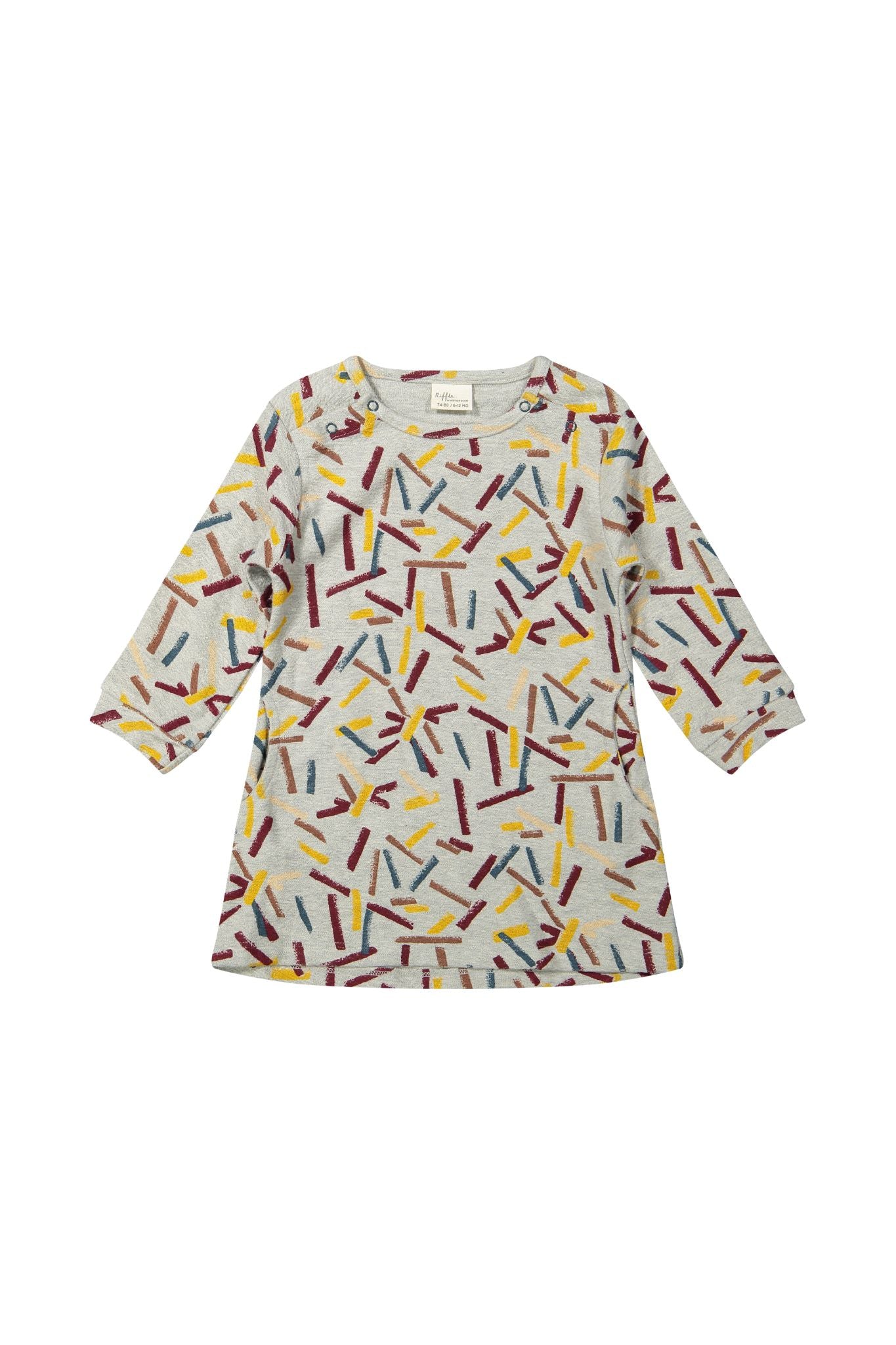 This everyday dress by Riffle is an easy-peasy outfit for baby girl! It features long sleeves, snap closure at the shoulders, and an allover abstract print. Add a pair of sneakers to complete the outfit.