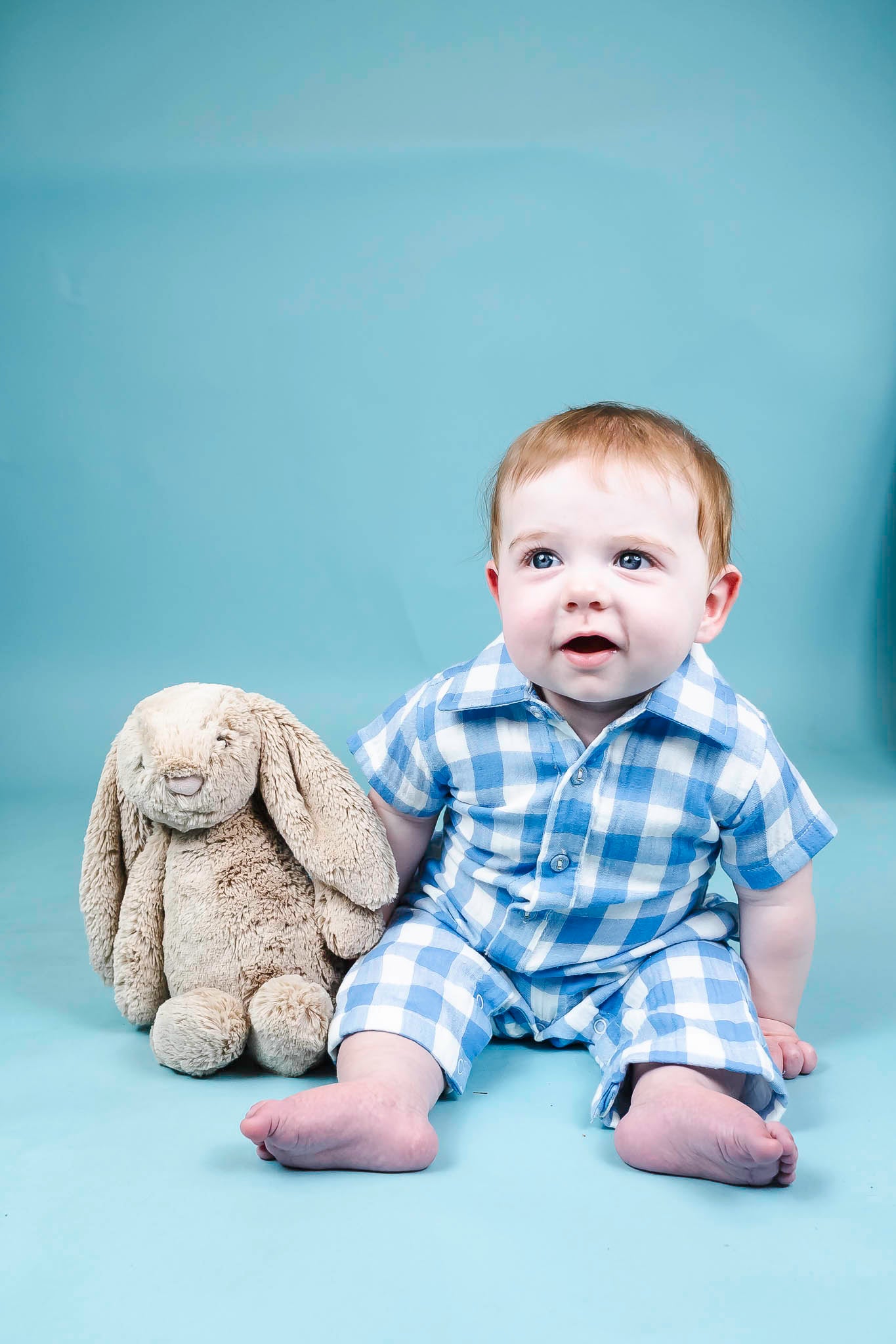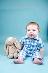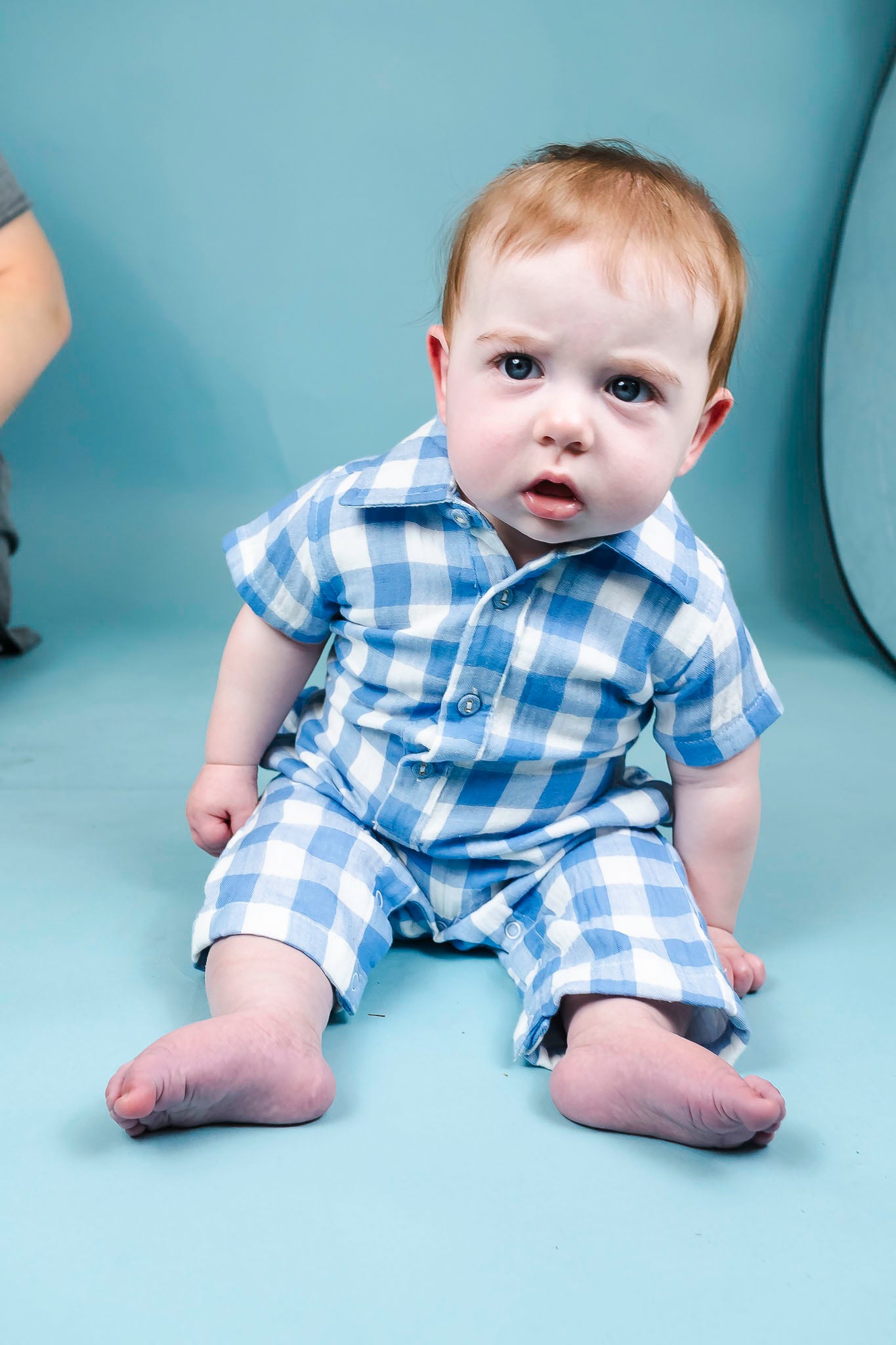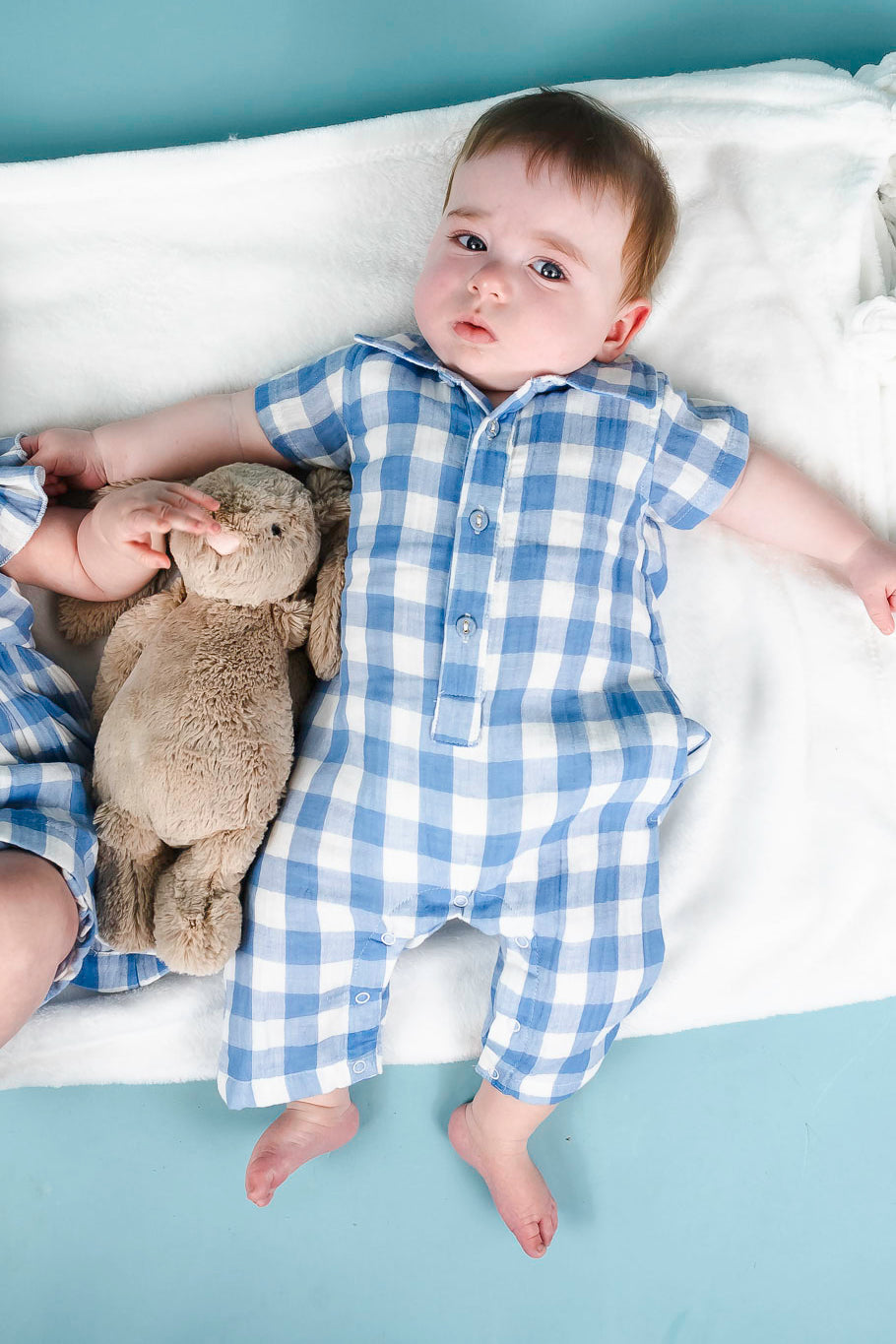 This adorable cargo romper by Viverano is an upscale outfit for baby boy this summer! It features an allover blue gingham print, short sleeves, and a collar. Add a pair of sneakers to complete his outfit.