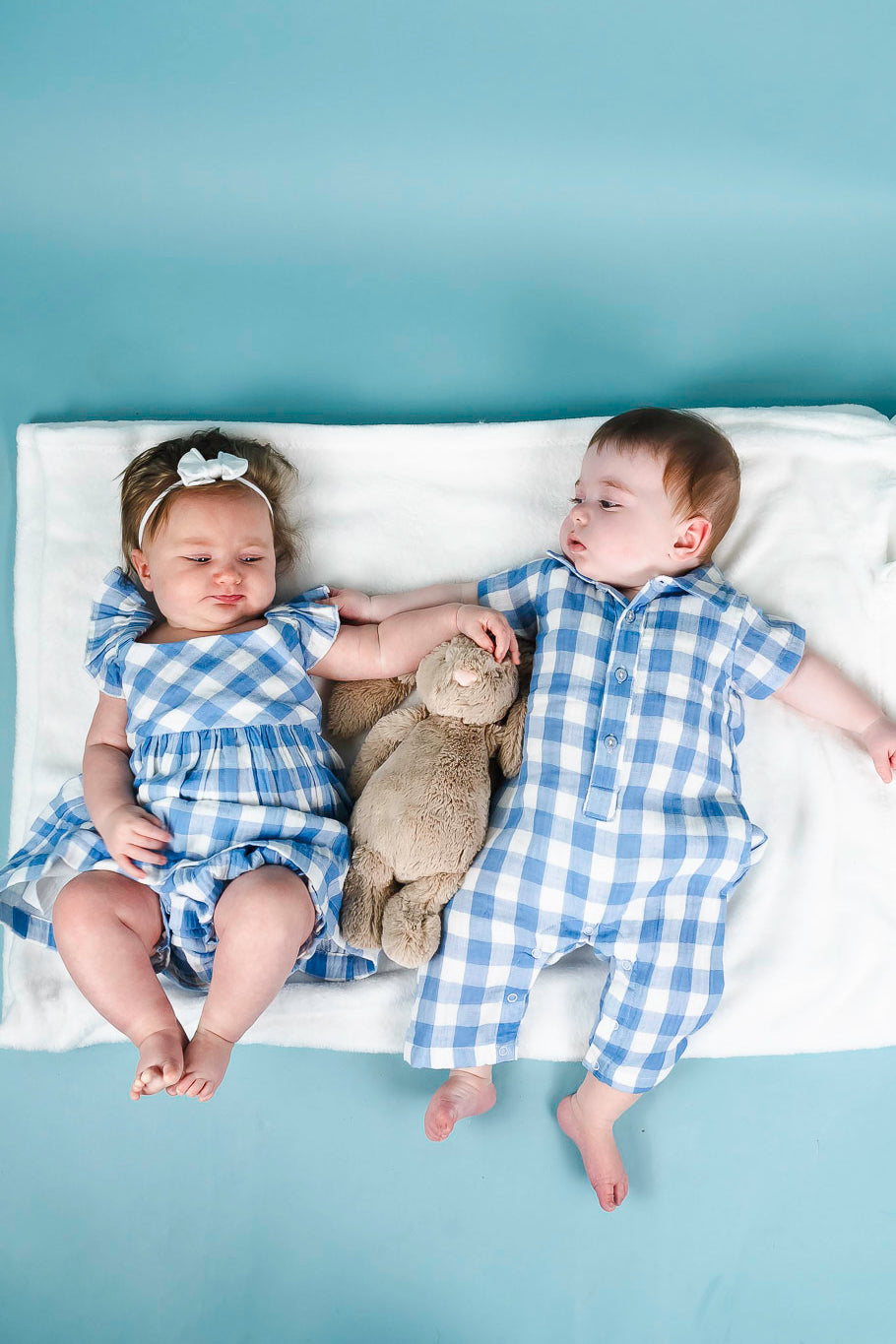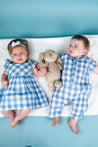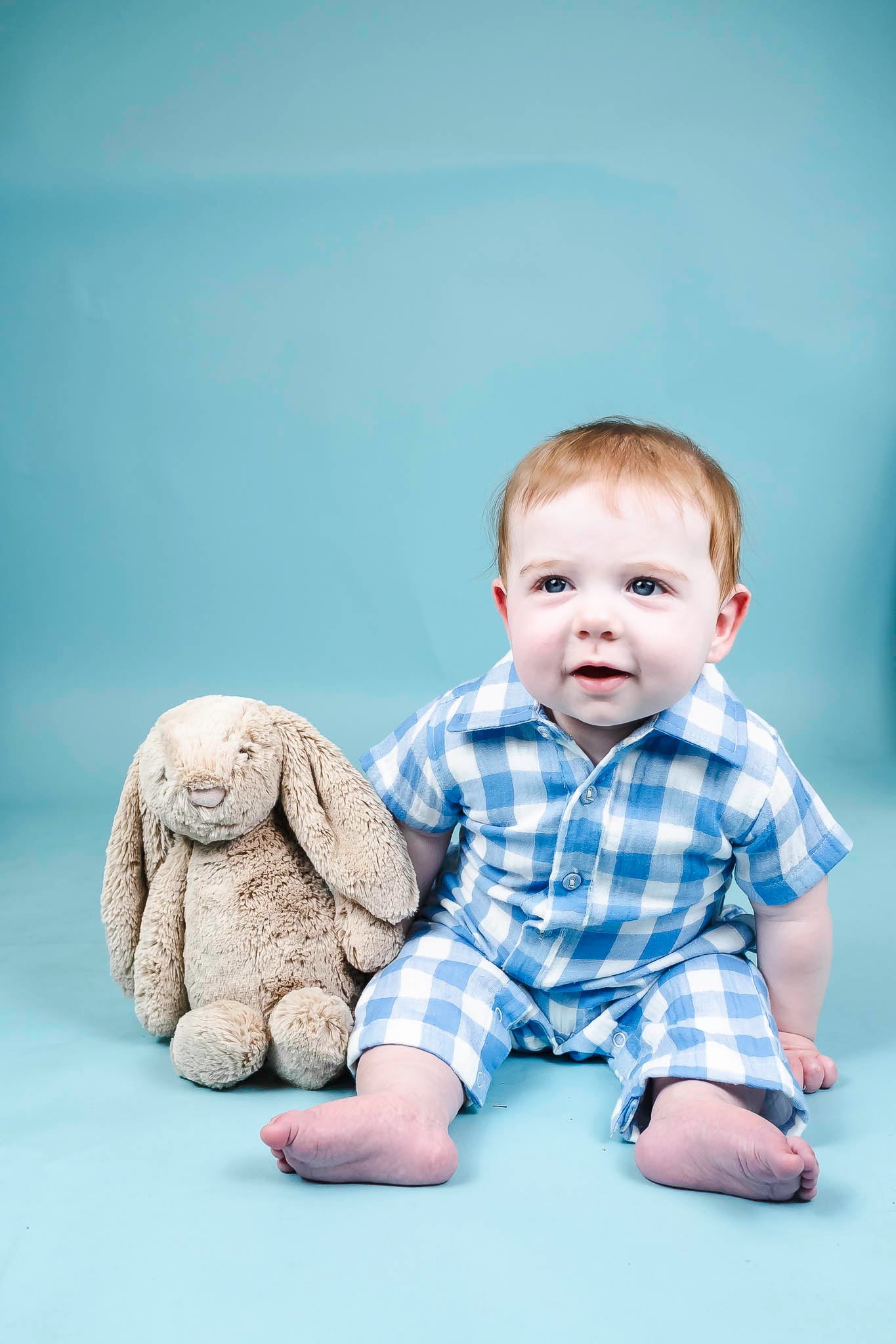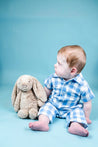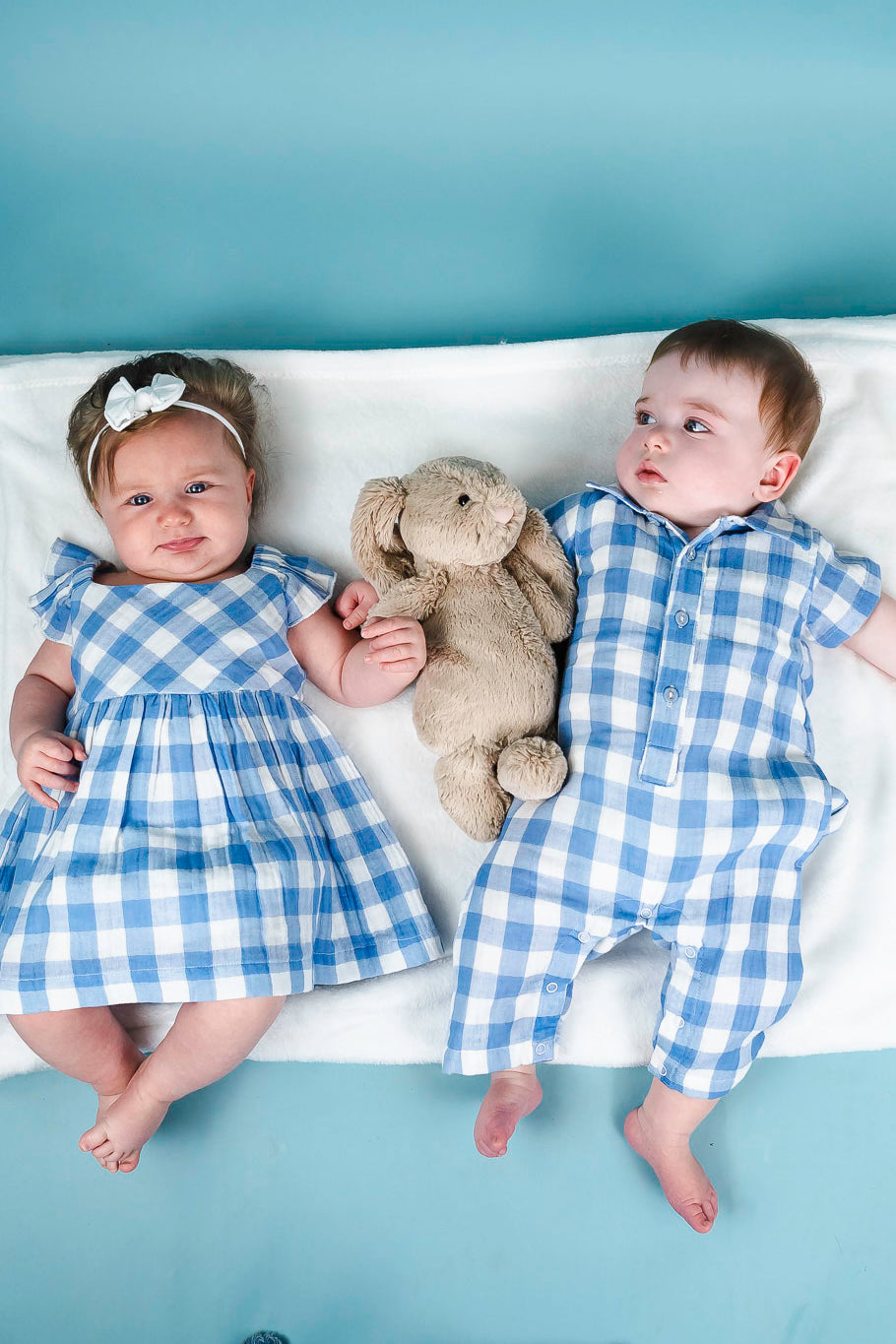 This adorable cargo romper by Viverano is an upscale outfit for baby boy this summer! It features an allover blue gingham print, short sleeves, and a collar. Add a pair of sneakers to complete his outfit.