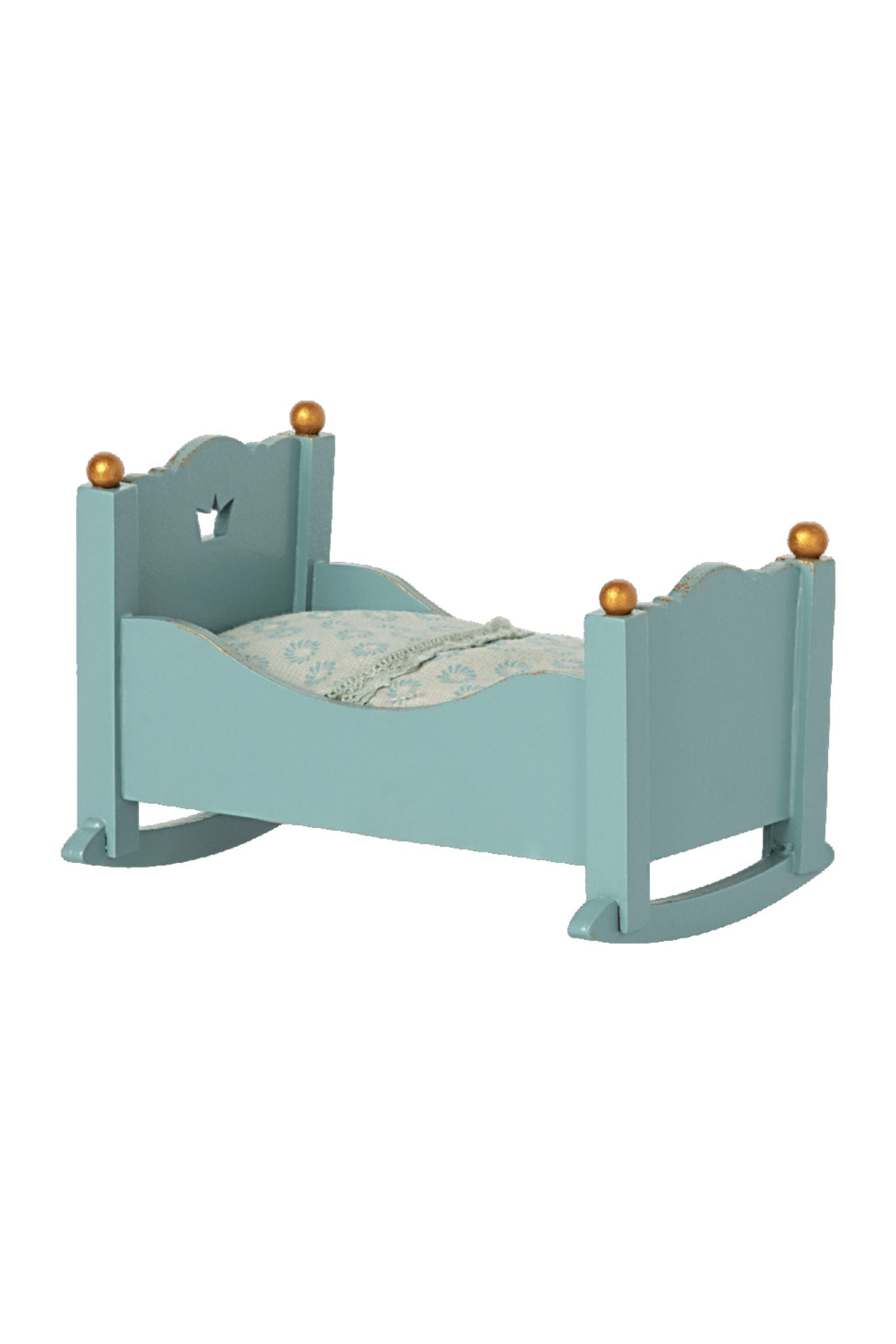 Your Maileg Mouse needs somewhere to sleep! This sweet blue bed is the perfect spot. It features a floral comforter and gold accents. This toy is best for children aged three and up.