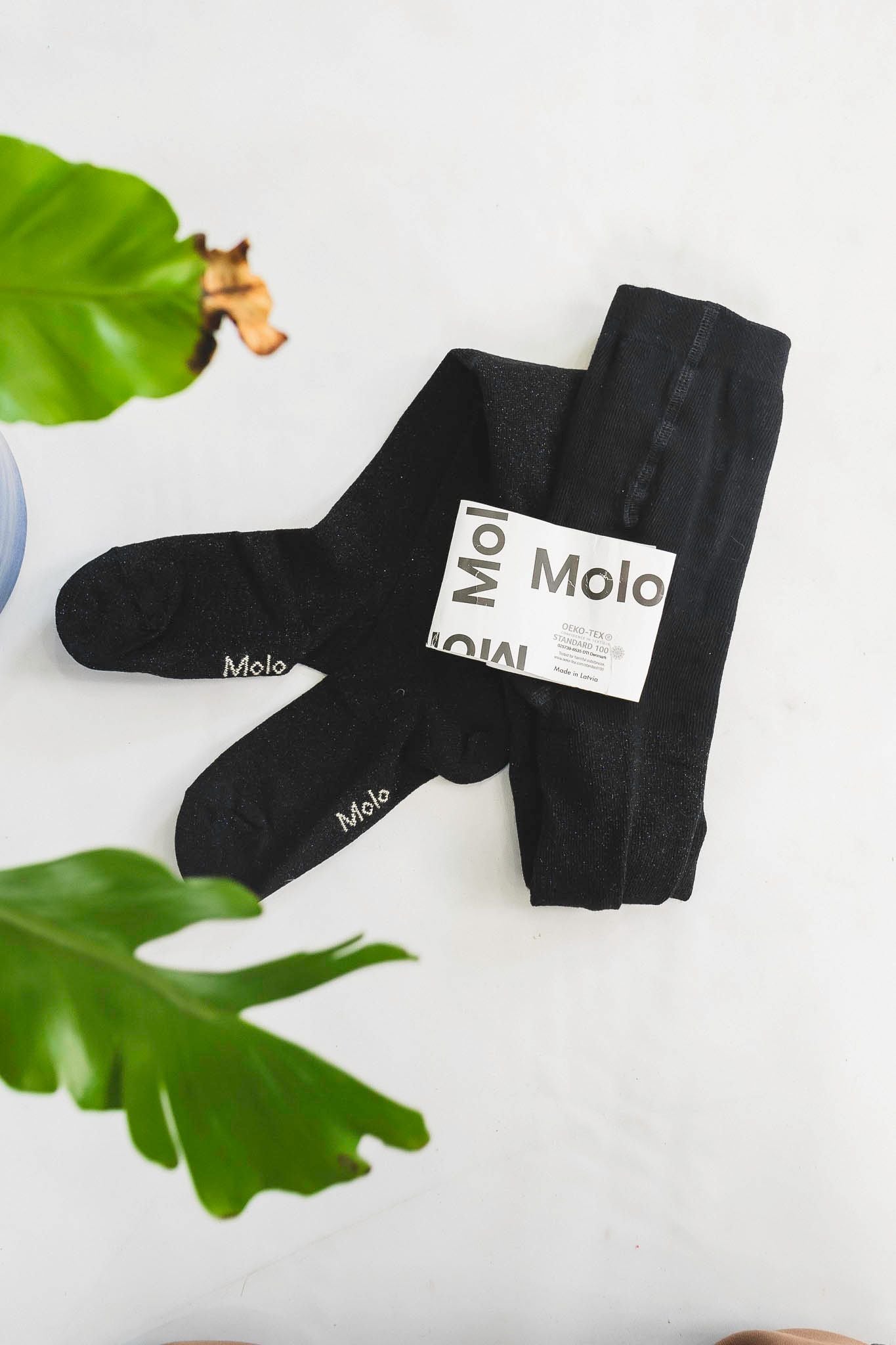 Every little girl needs a pair of glitter tights! This Molo pair comes in a black hue and features the brand name on the bottom of each foot.