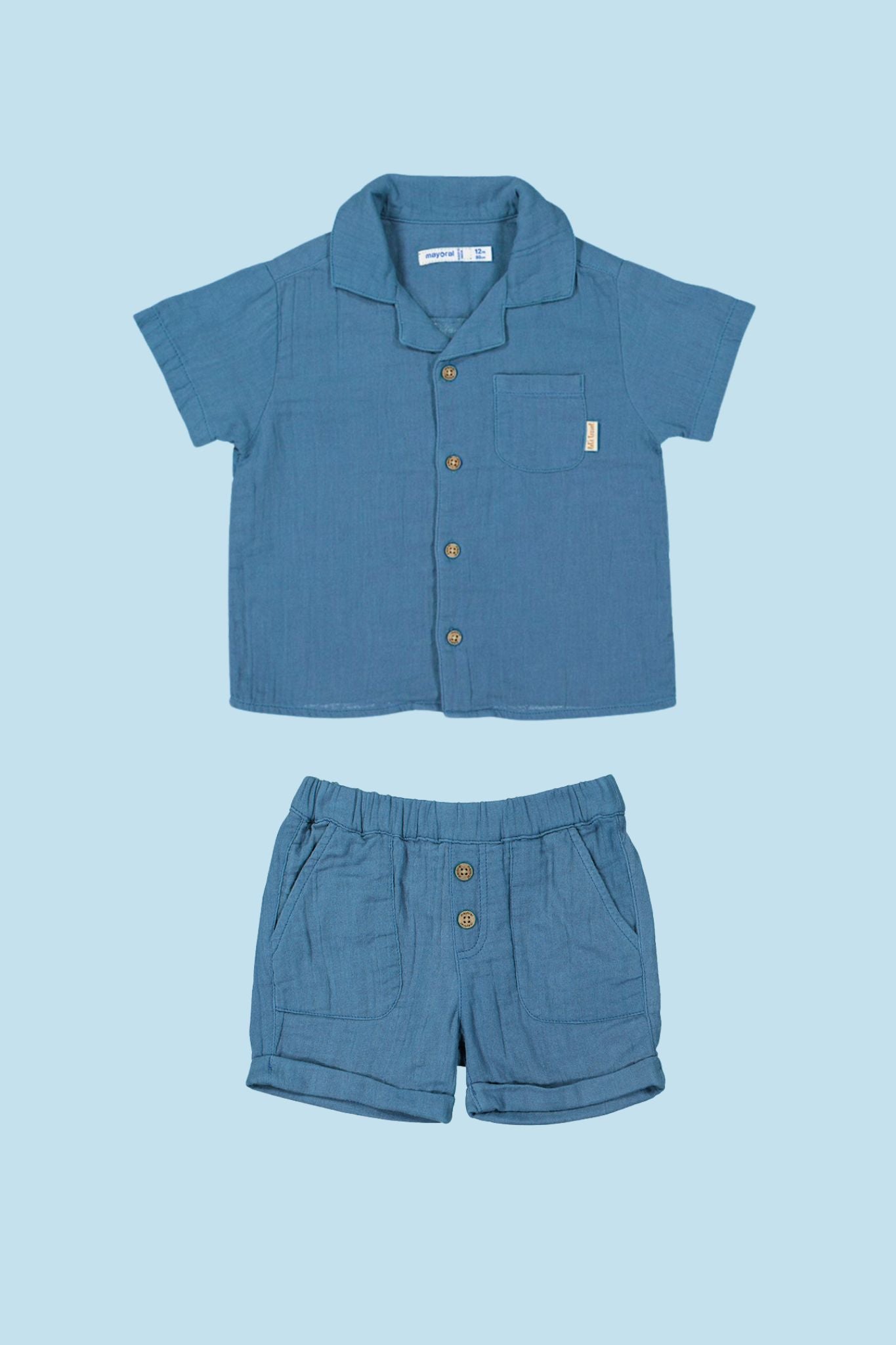 This button-up shirt from Mayoral comes in blue and features short sleeves. A single pocket adorns the chest.