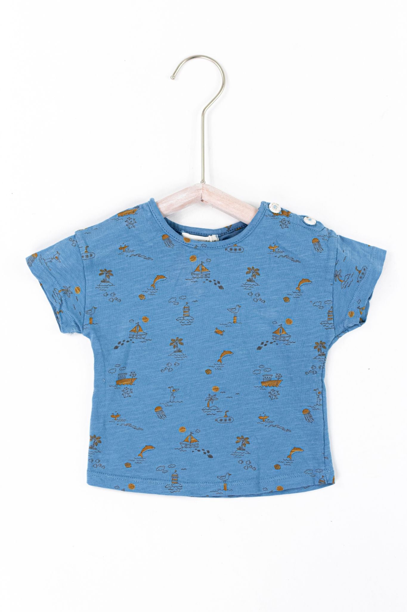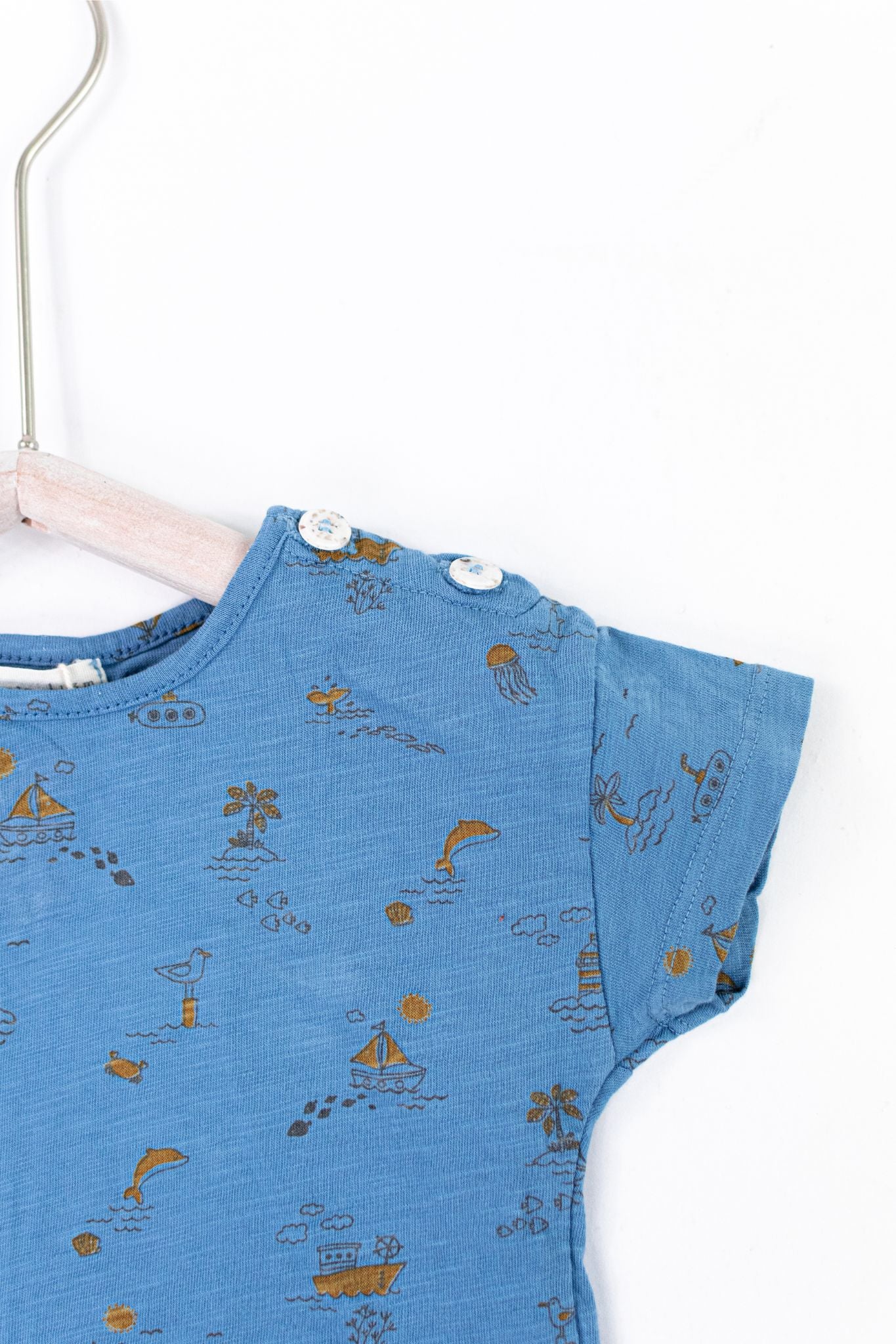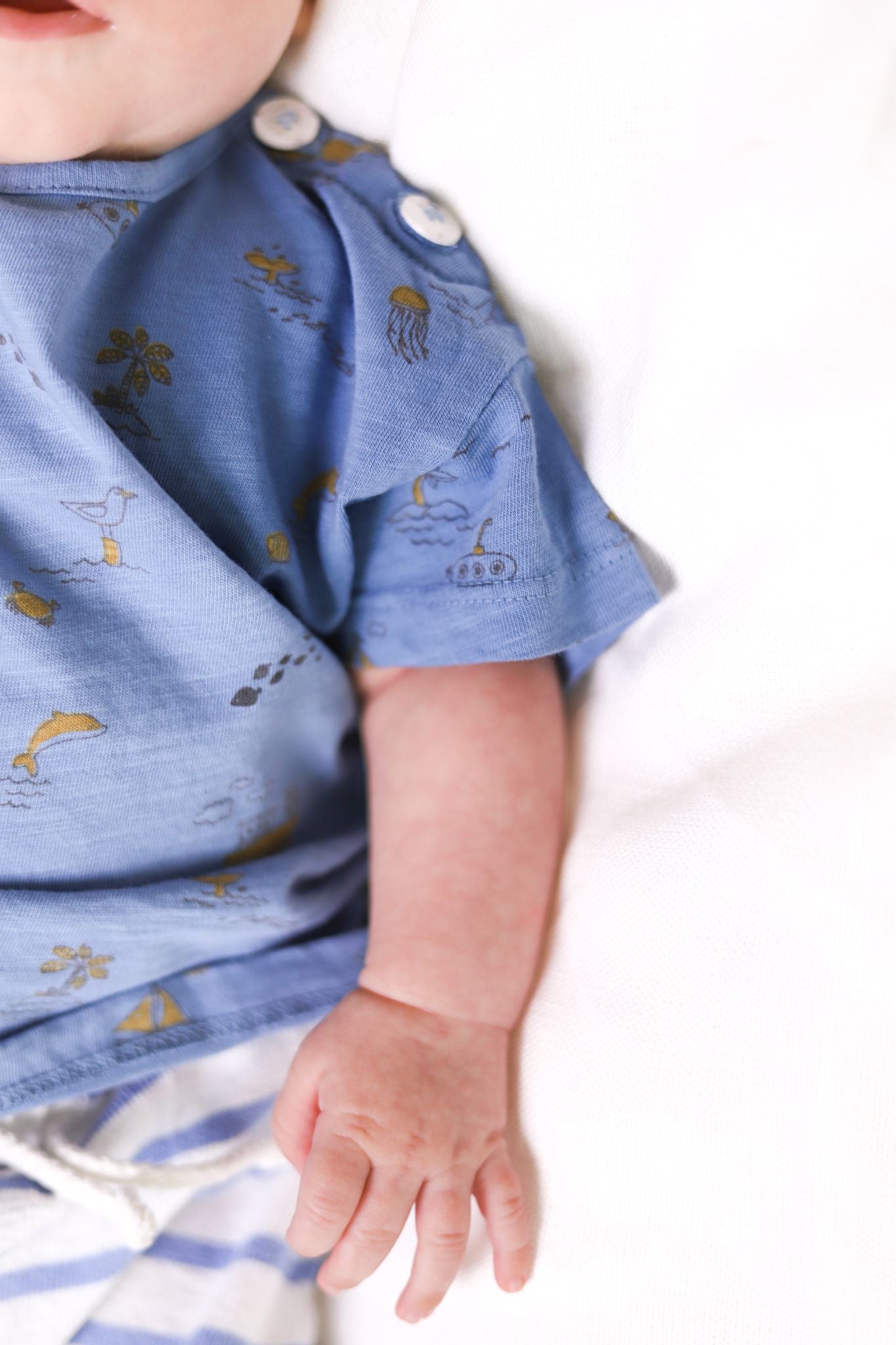 This precious t-shirt from Beans comes in blue and features an allover boat print. Buttons at the side neck allow baby to get in and out with ease.