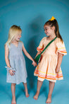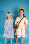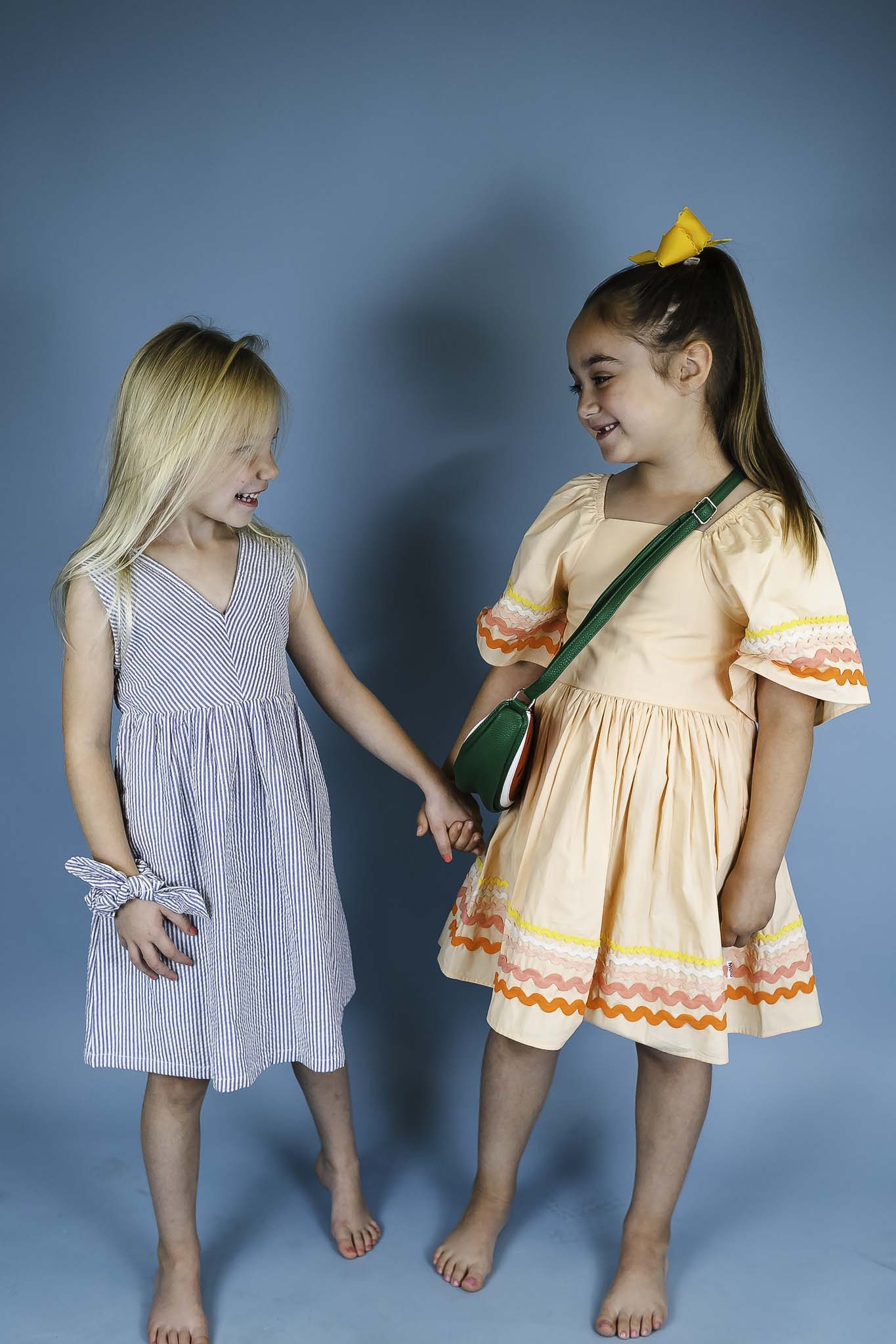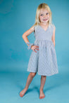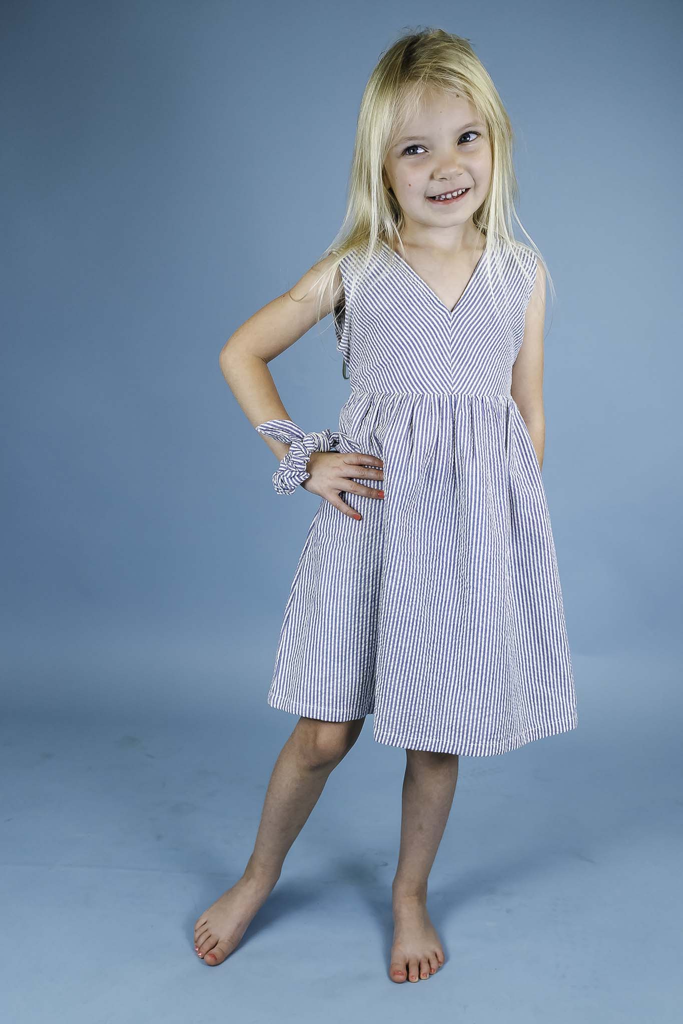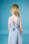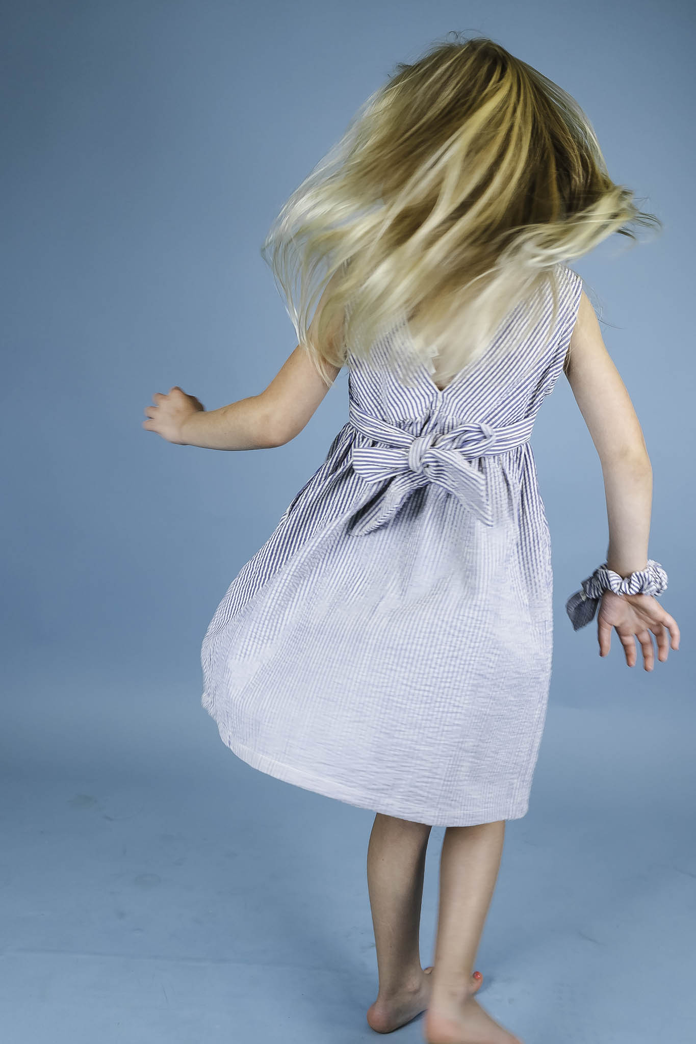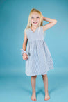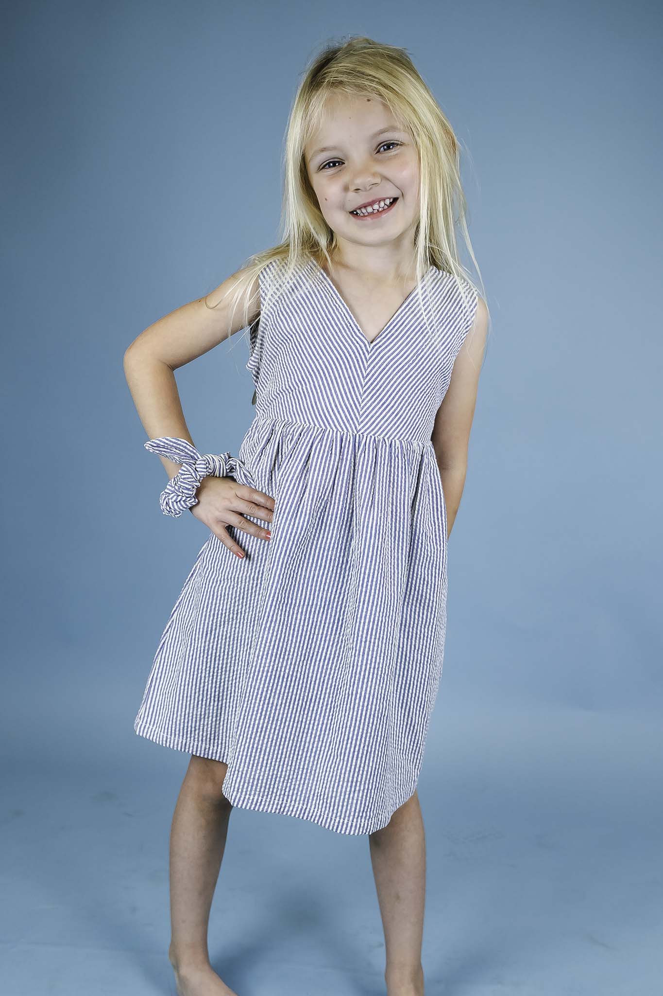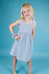This pretty dress from Arsene features blue seersucker stripes and a v-neckline. A self-tie belt adorns the waist.