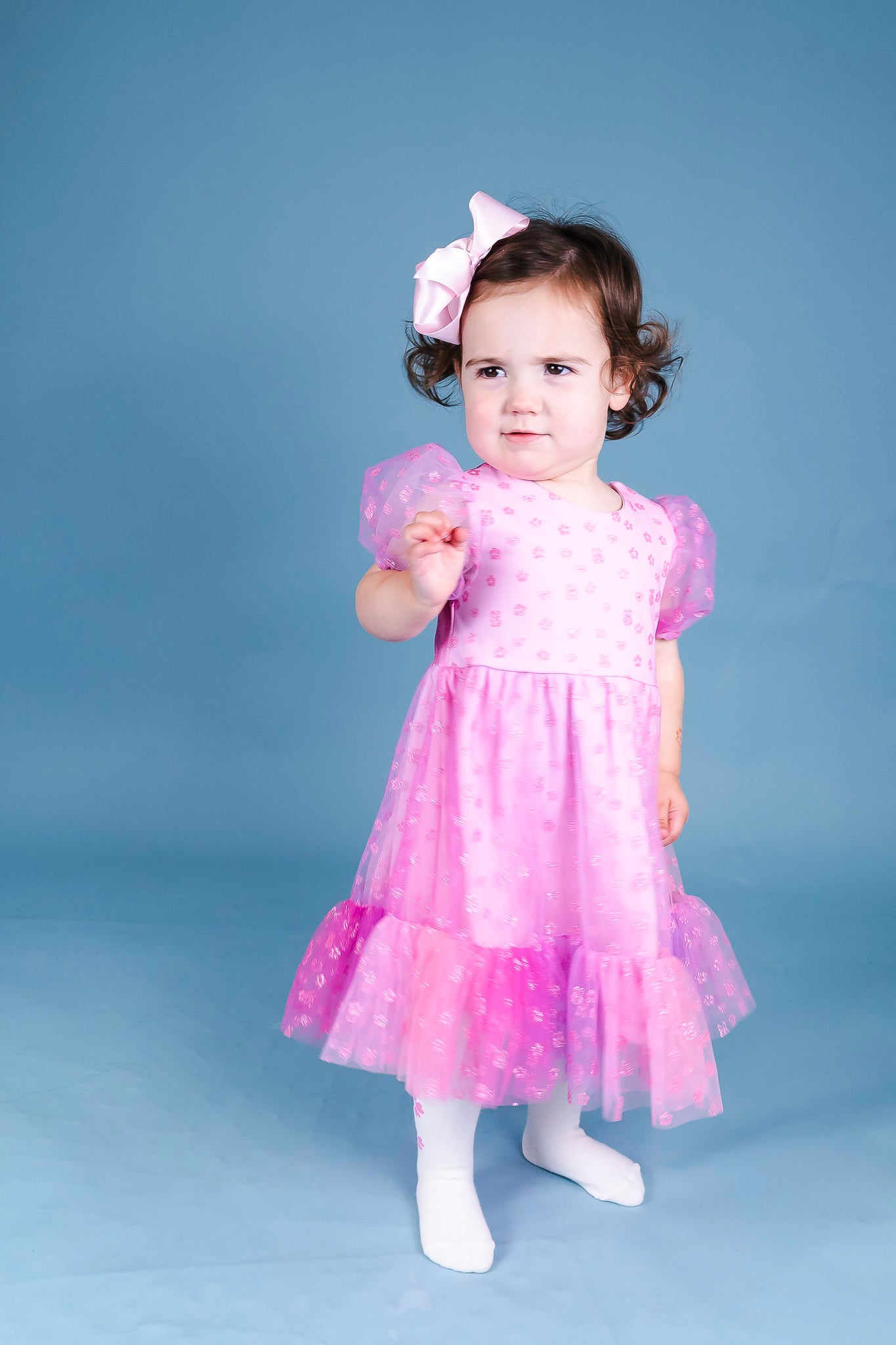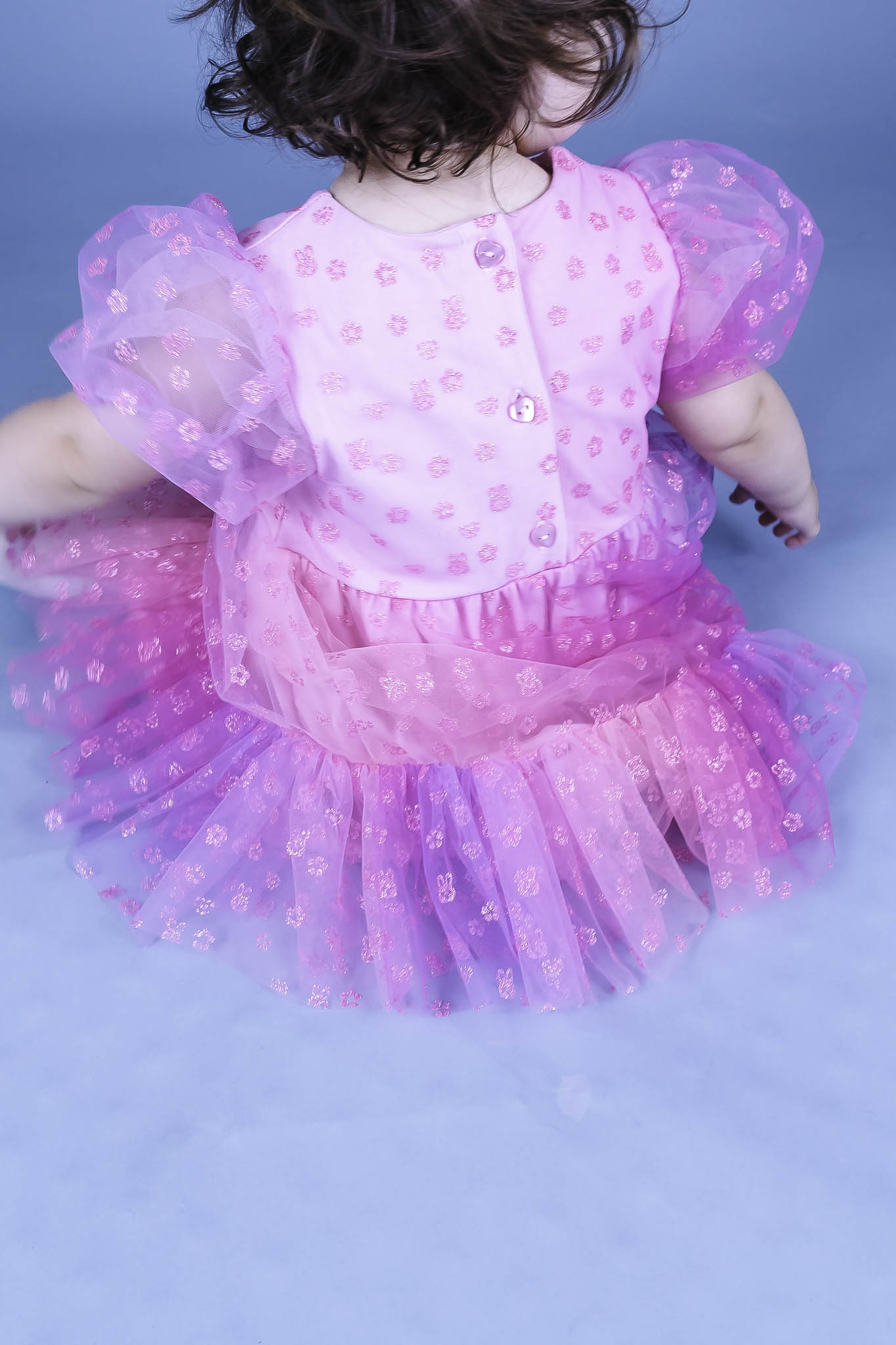 This party dress by Huxbaby takes baby girl from Easter celebrations to birthday festivities! It comes in hot pink and features a bunny-printed tulle fabric. Puff sleeves and a ruffle along the hem make for cute details.