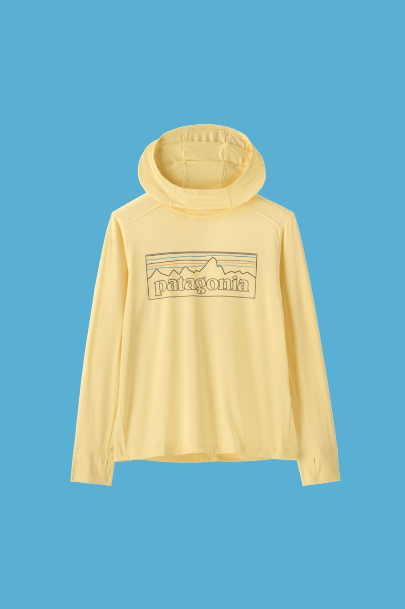 This buttercup yellow Patagonia sweatshirt features a colorful brand logo printed across the chest. A hood makes for extra warmth.