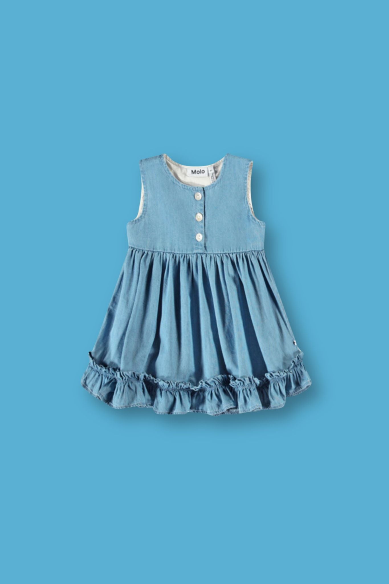 This pretty, sleeveless dress from Molo comes in a chambray denim fabric and features ruffles along the hem. Three vertical buttons adorn the center front chest.
