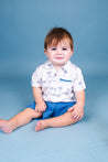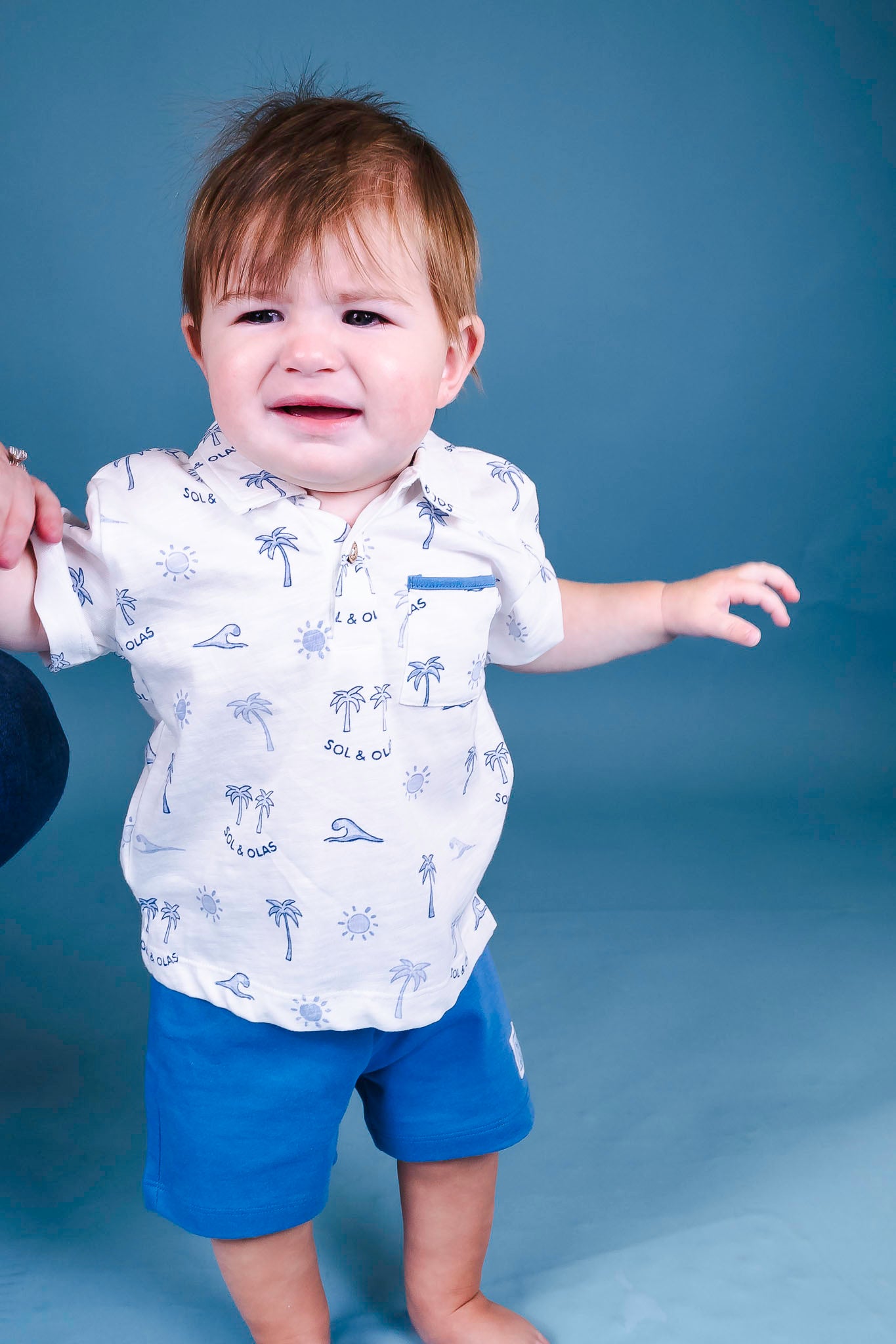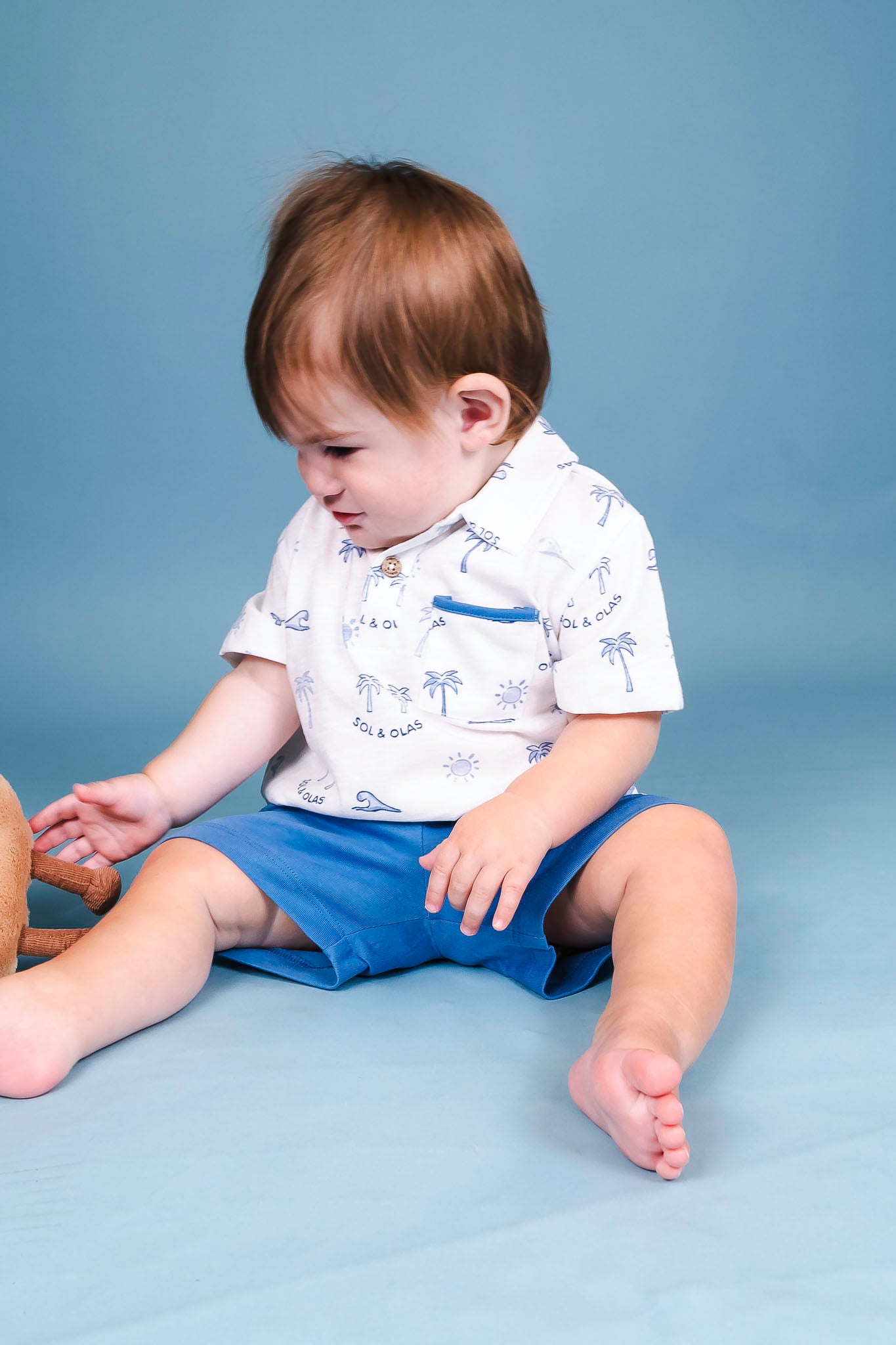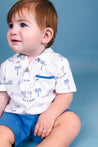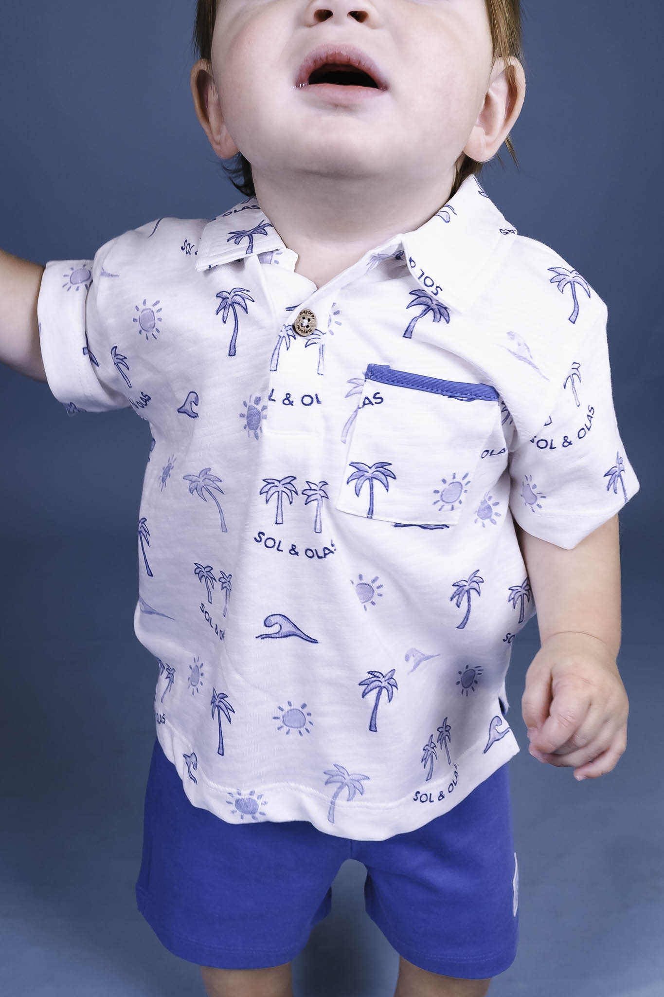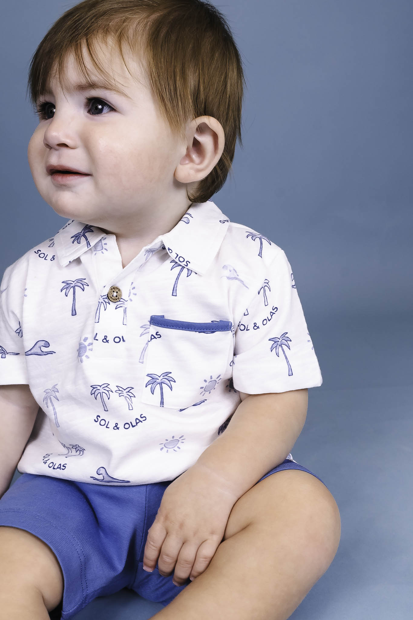 Outfit your little one in this adorable short set from Mayoral! It includes a pair of blue shorts with a drawstring waist and a palm tree-printed polo tee.