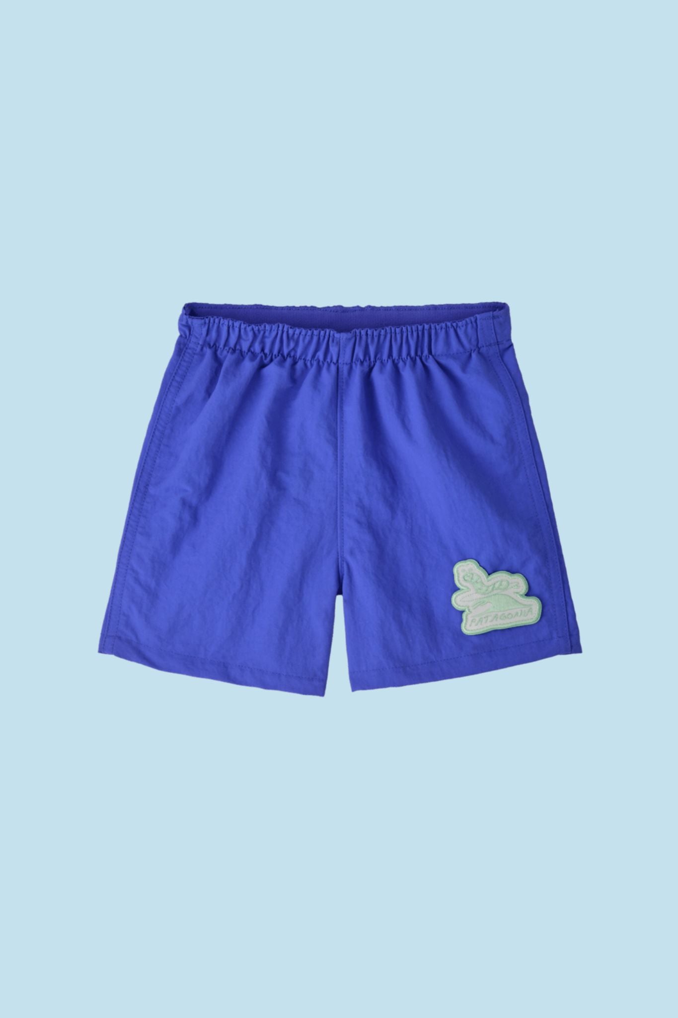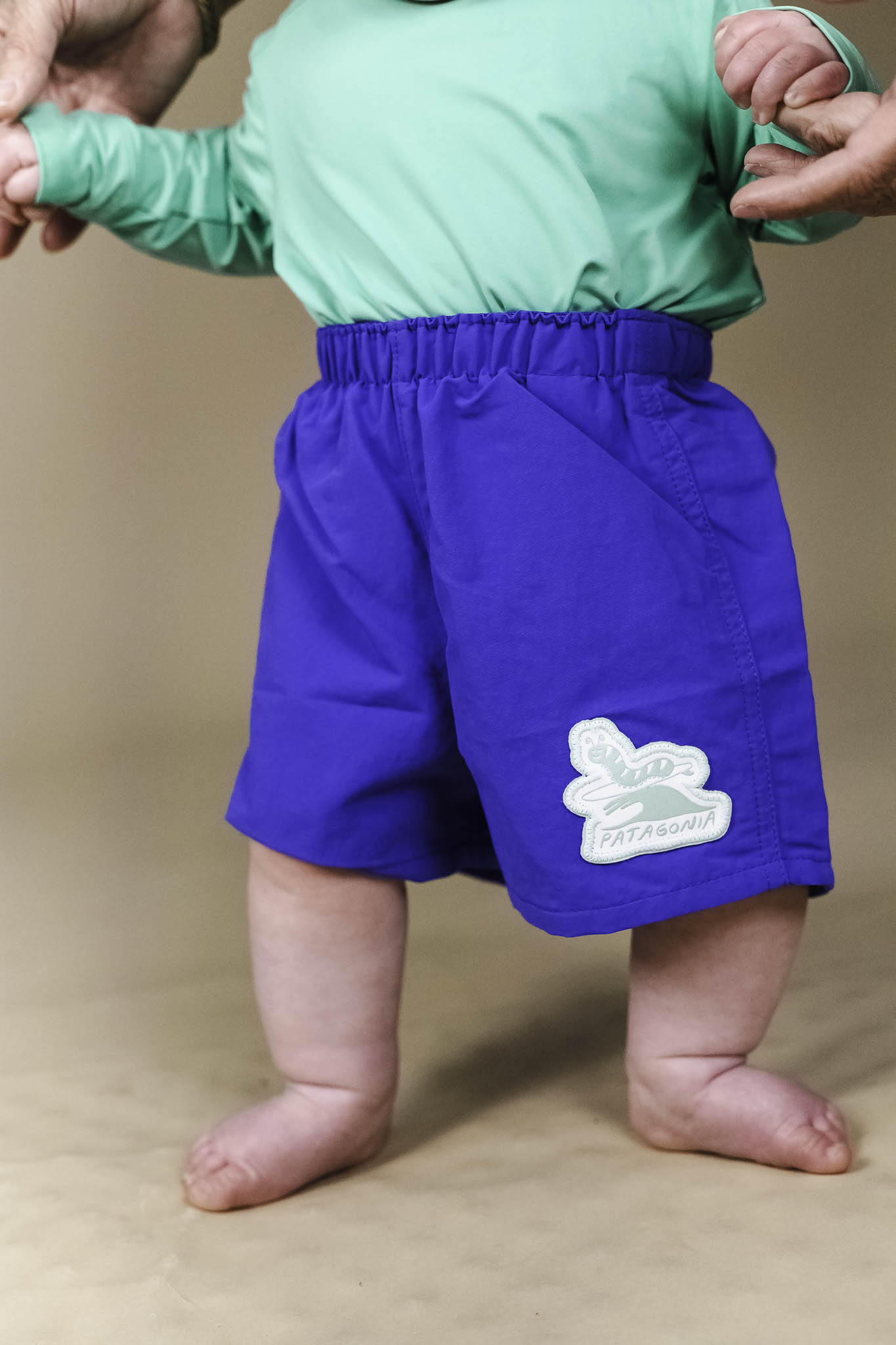 These comfy nylon shorts by Patagonia come in a royal blue hue and feature a sweet caterpillar patch at the bottom thigh. The elastic waistband keeps baby boy cozy.