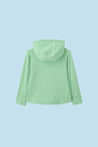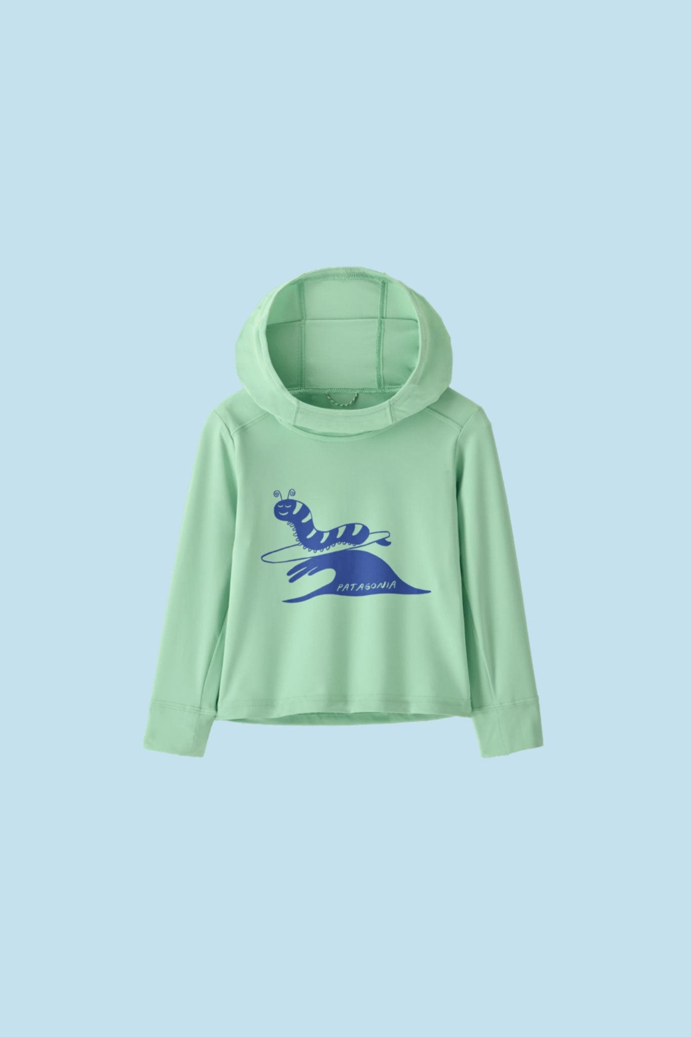 This cozy Patagonia sweatshirt comes in a light green hue and features a sweet caterpillar graphic in royal blue. A hood makes for added warmth.