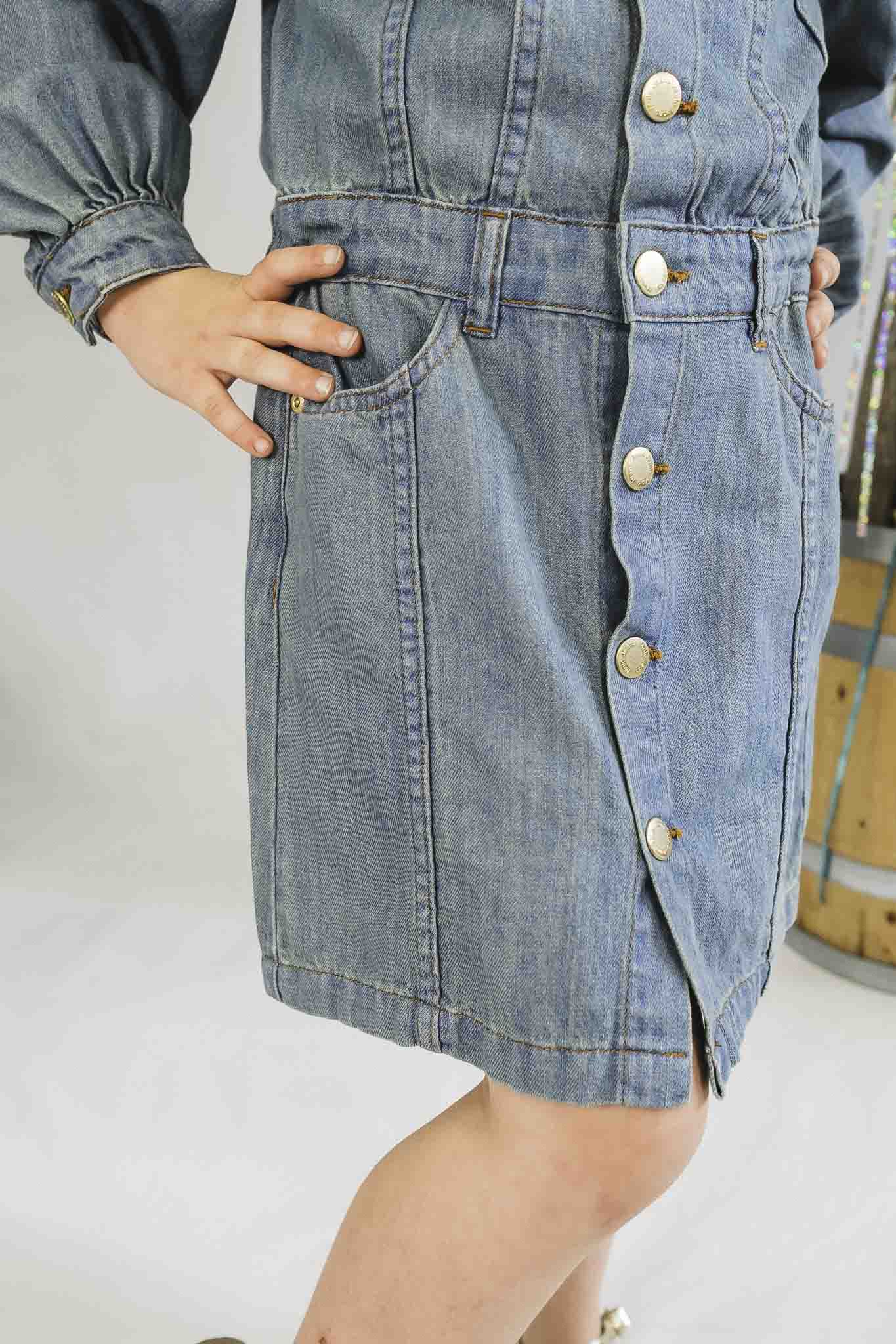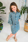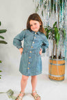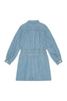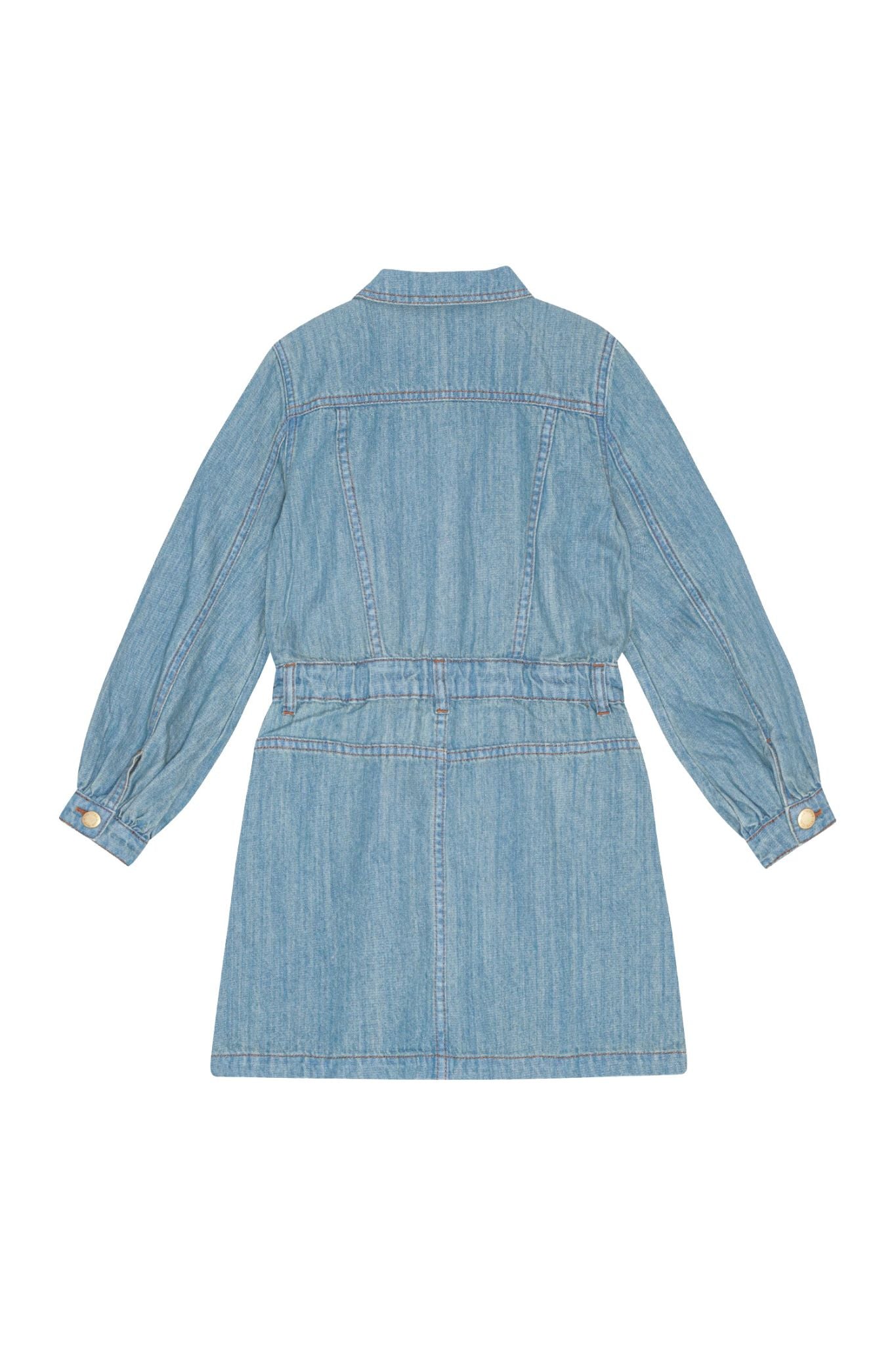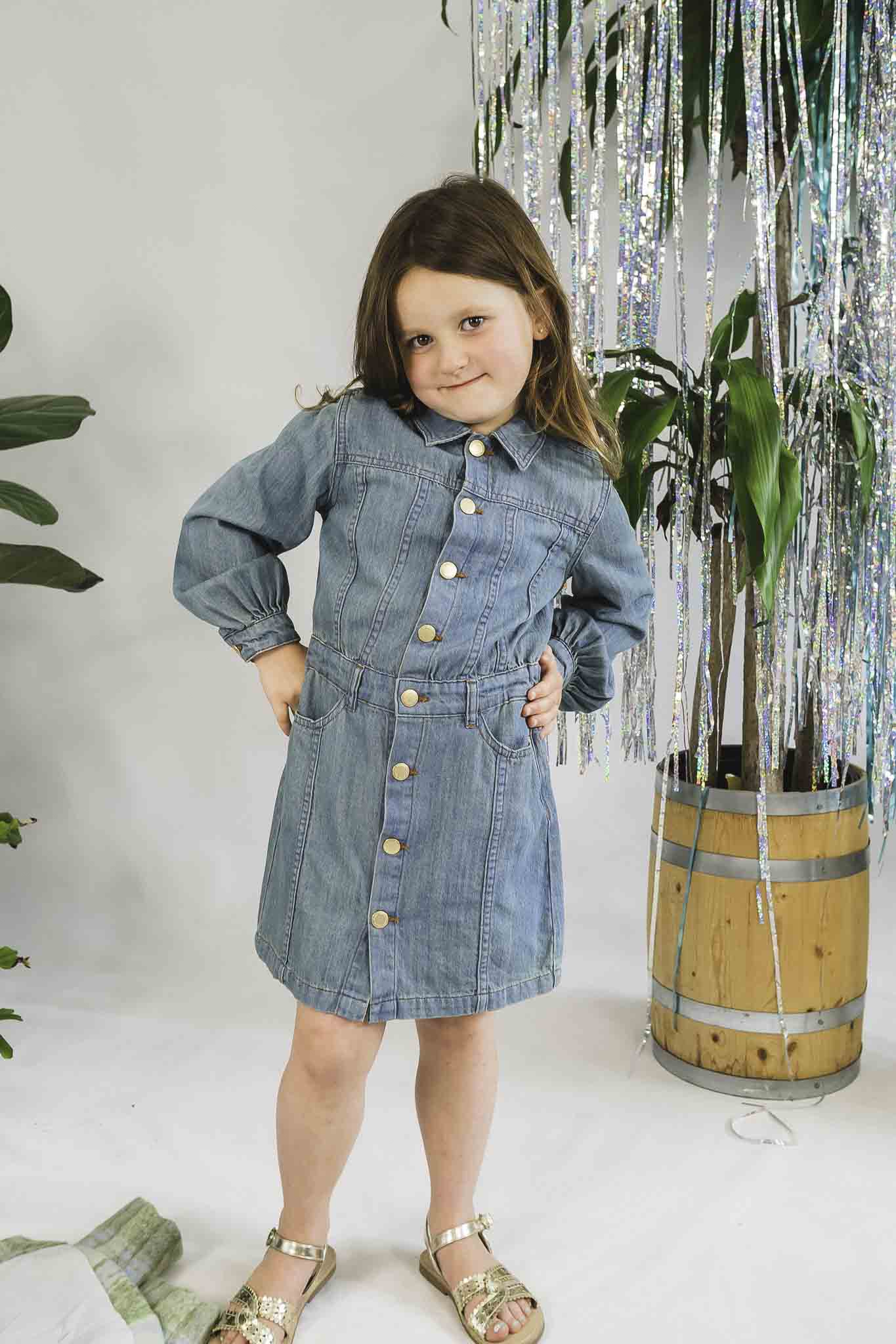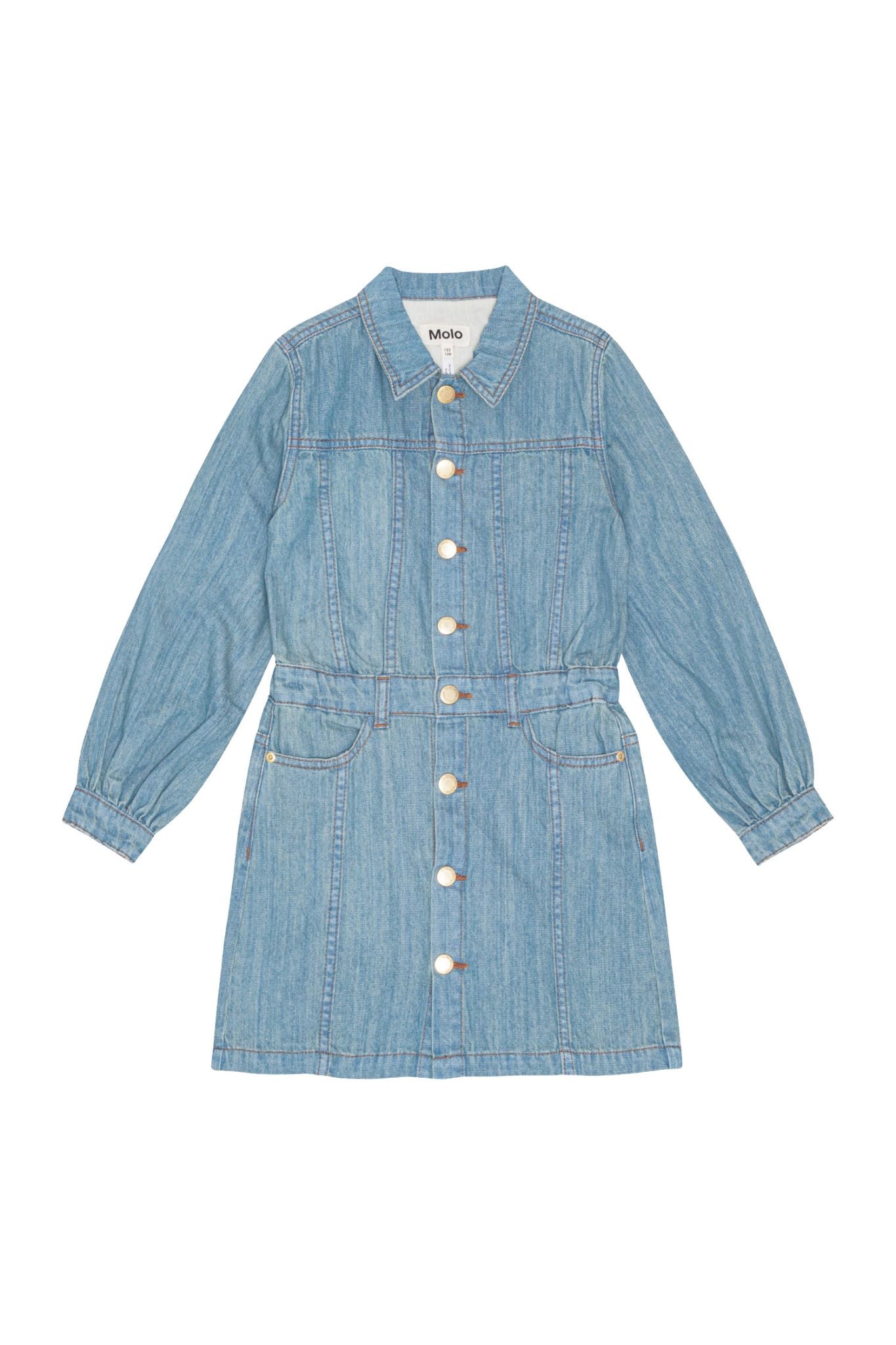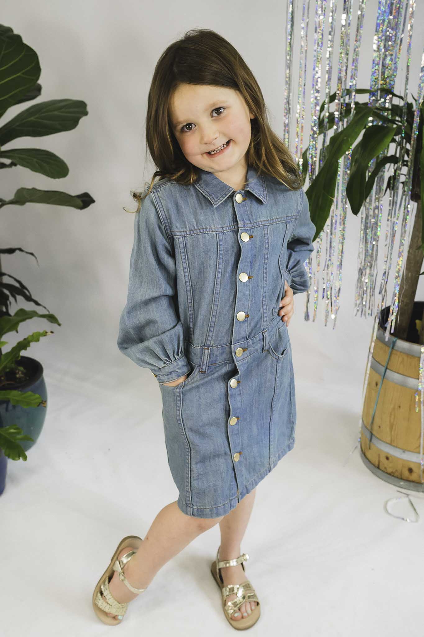 This super sweet denim dress by Molo features long sleeves, a light wash, and buttons down the front. Pockets adorn the frontal hips. Add a pair of sandals to make for a cute outfit!