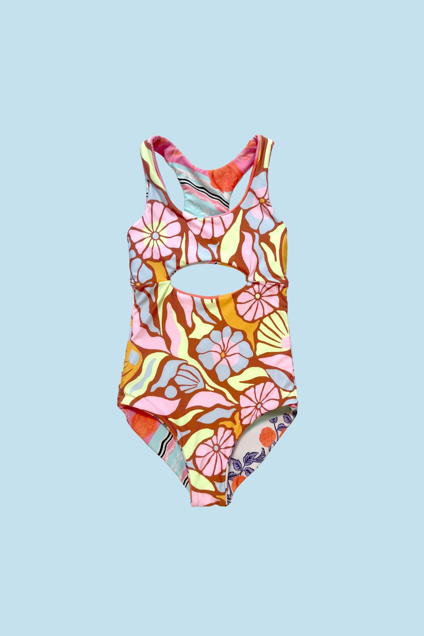 Sunny days are up ahead with this reversible one-piece swimsuit from Maaji! It features a U-shaped neckline, sporty and sophisticated cutouts and the bold colors of a summer sunset! Turn it inside out for another look - it's like two swimsuits in one!