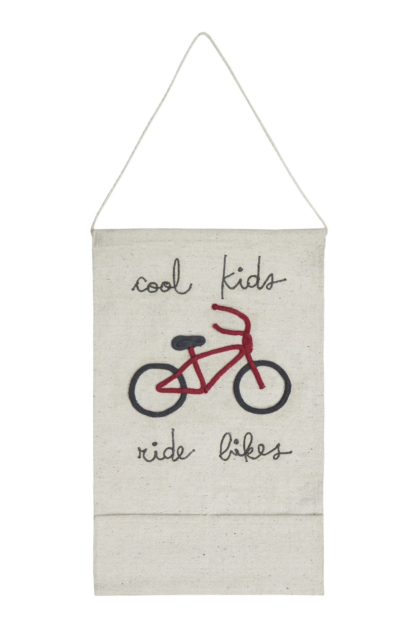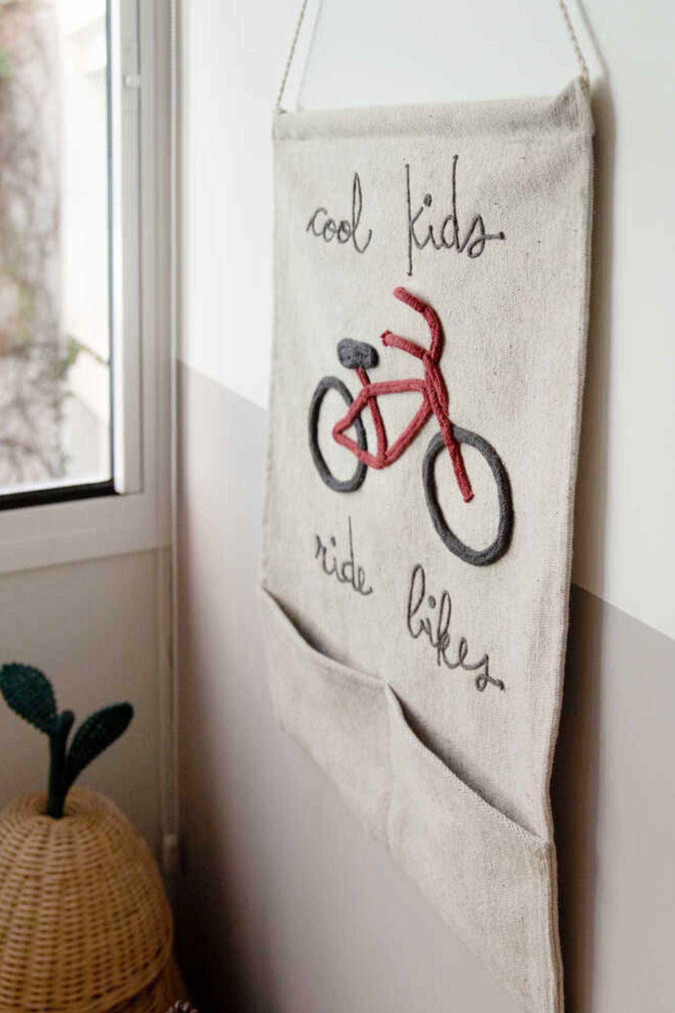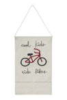 Welcome to Eco-City, where adventurous kids ride bikes! This charming wall pocket hanger features embroidered lettering and offers a fun and functional way to keep things organized. Ideal for storing small toys, books, crayons, building blocks, or even cozy slippers, it’s a stylish and practical addition to any room.