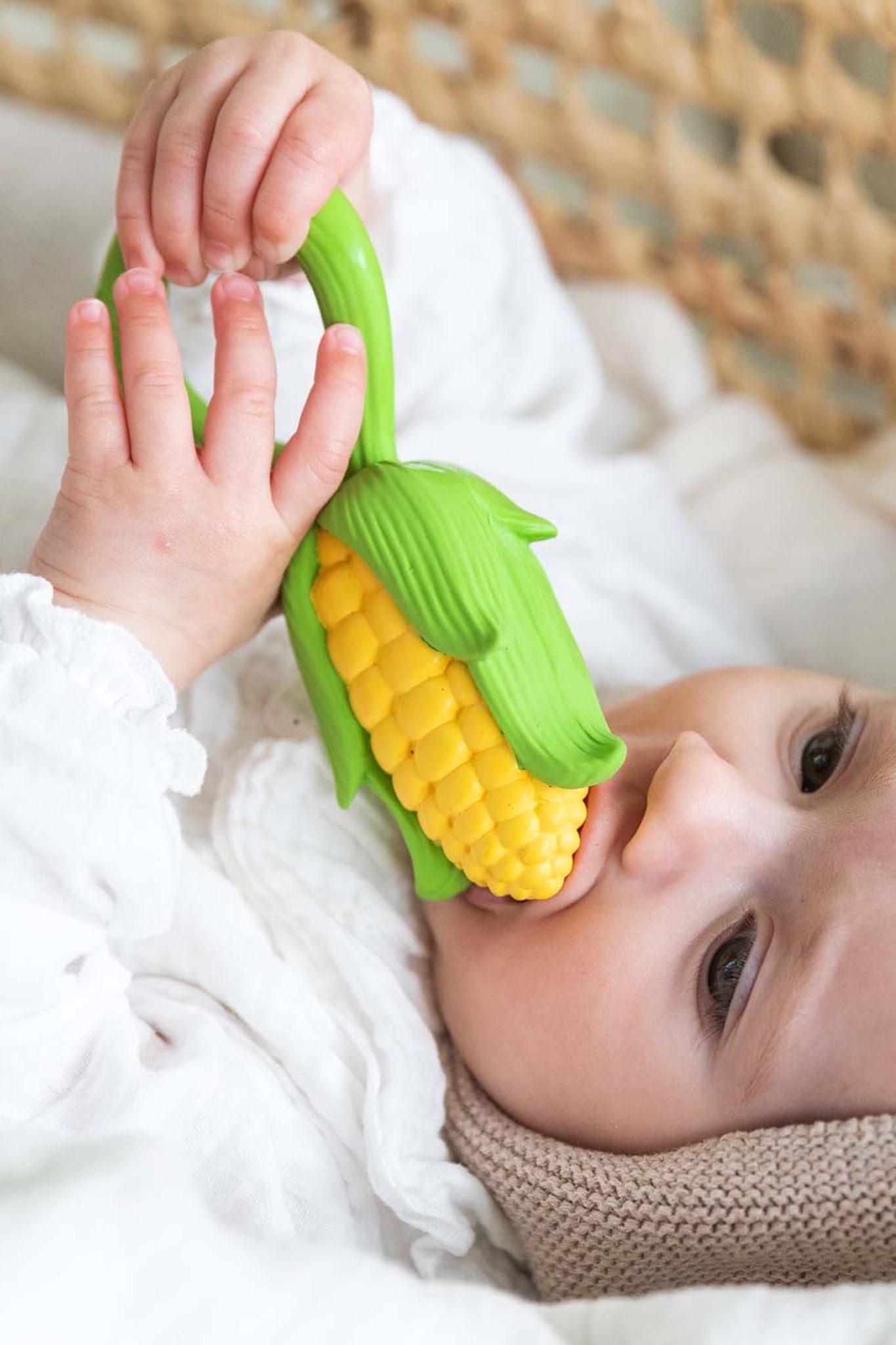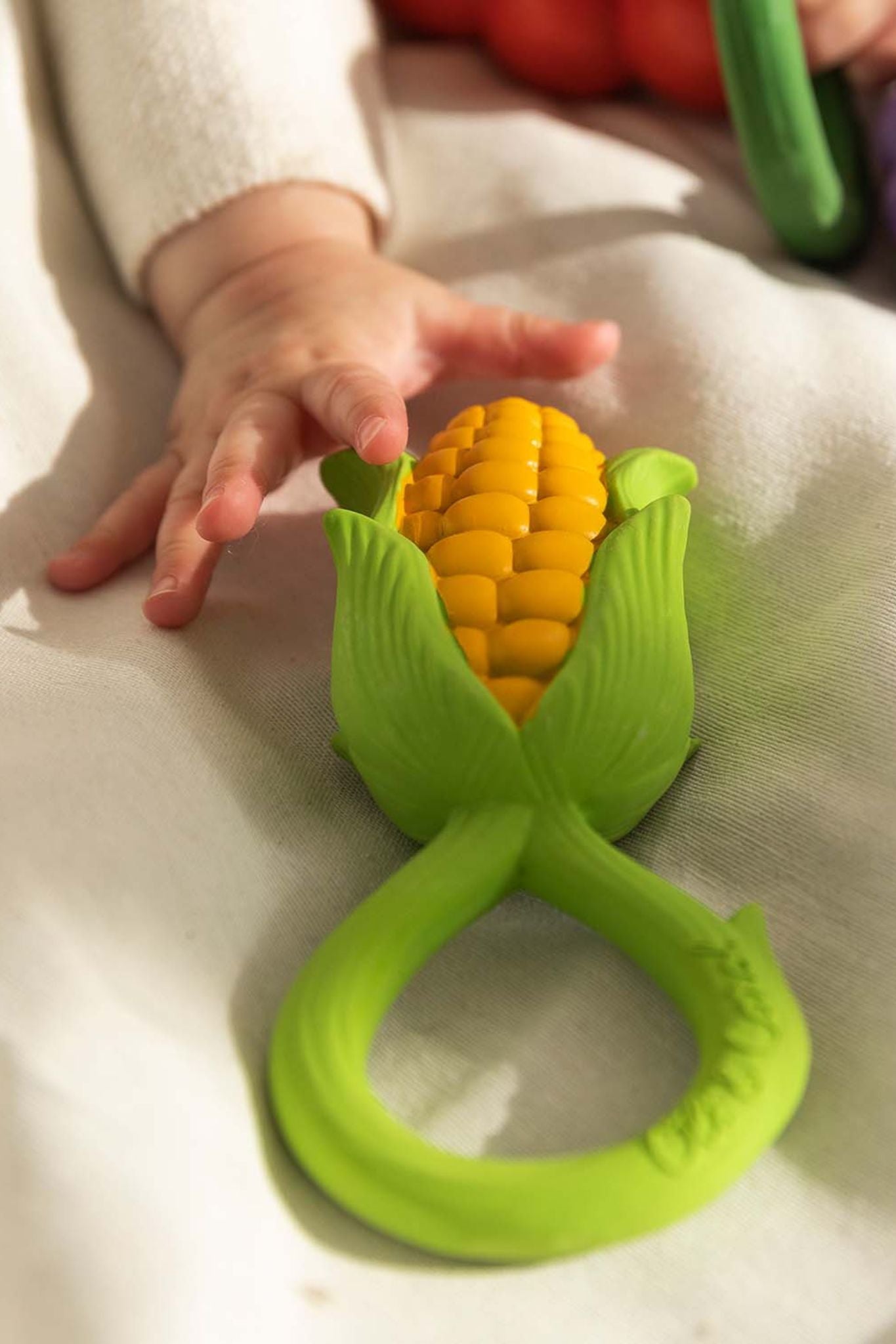 Oli & Carol’s Corn Rattle Toy is a 2-in-1 teether and rattle, designed to soothe and engage your baby. Made from 100% natural rubber and filled with upcycled cherry seeds, it creates a calming, nature-inspired sound.