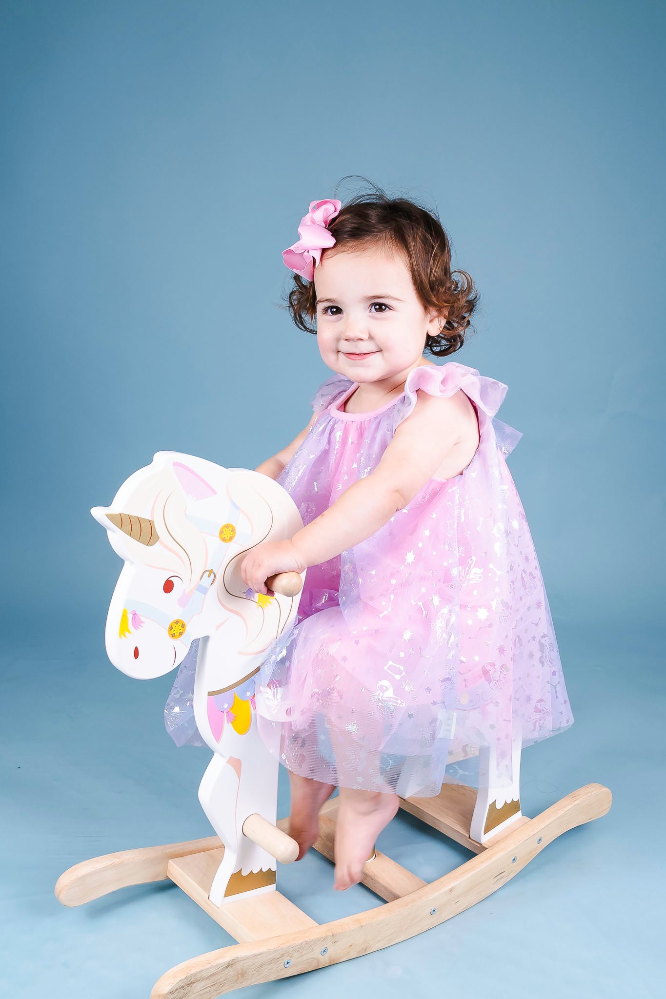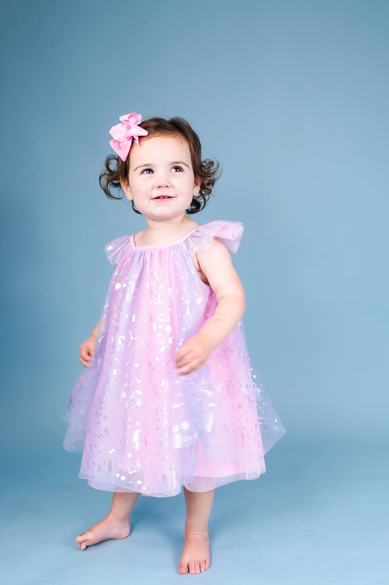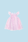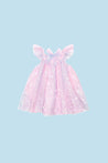 This flowy frock by Huxbaby is pure magic! It comes in a pink tulle fabric with an allover unicorn print in silver. Ruffle sleeves and a bow at the back neck make for sweet accents.