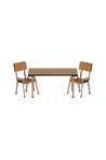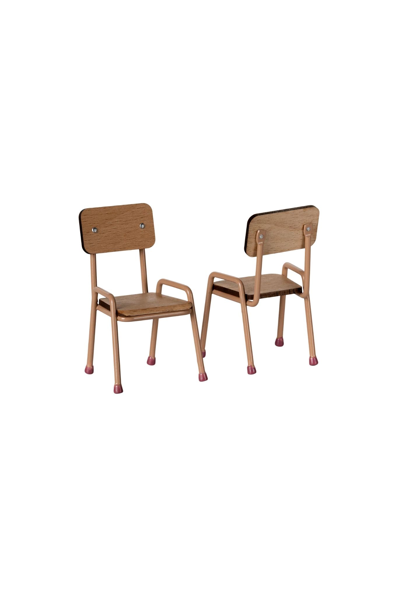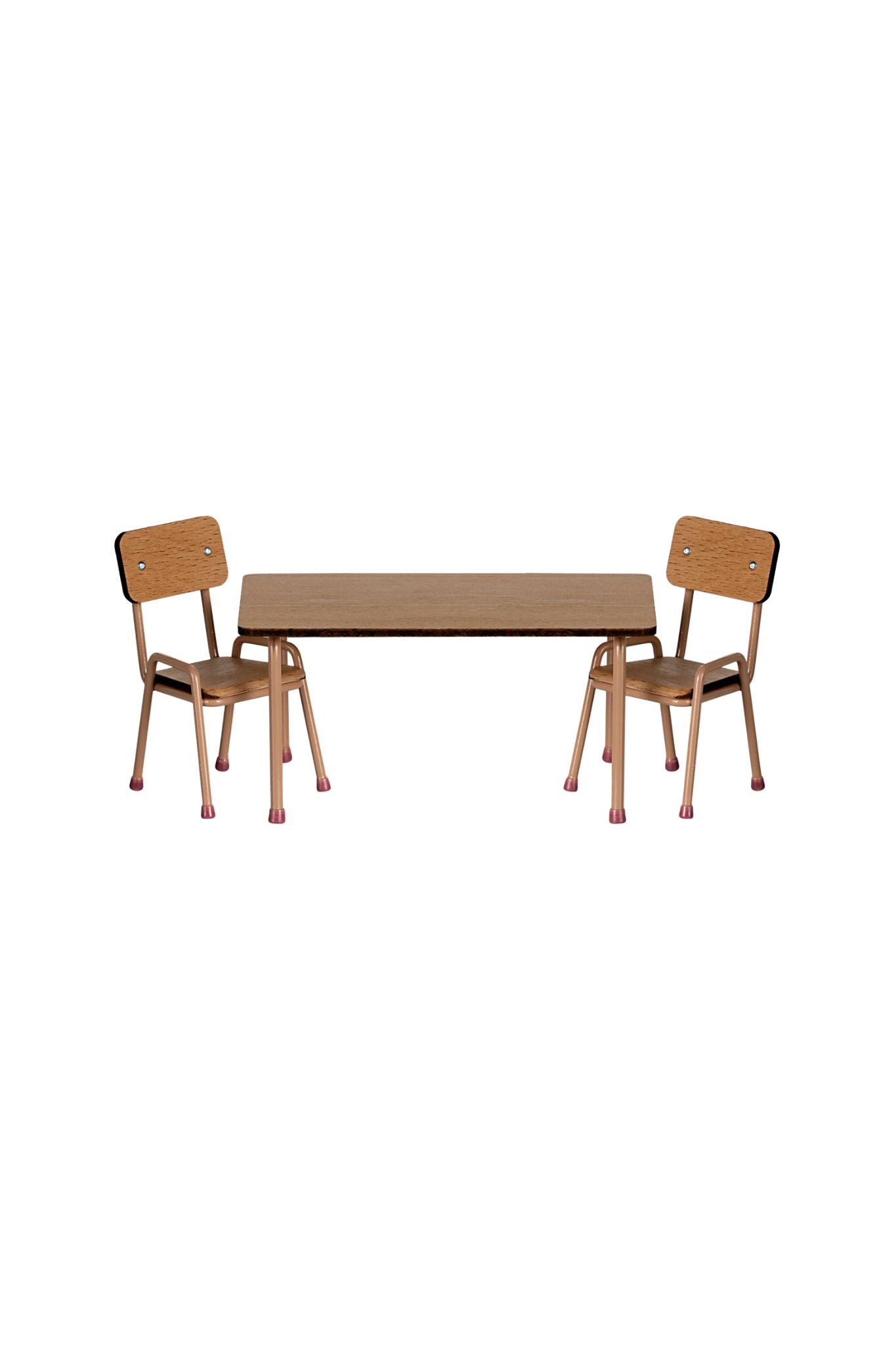 This charming table and chair set is perfect for the Mouse Hole Farmhouse. Made from beech wood with metal legs, it features handmade color details on the feet of both the table and chairs. The set includes 2 chairs, making it an ideal addition to any miniature setting.