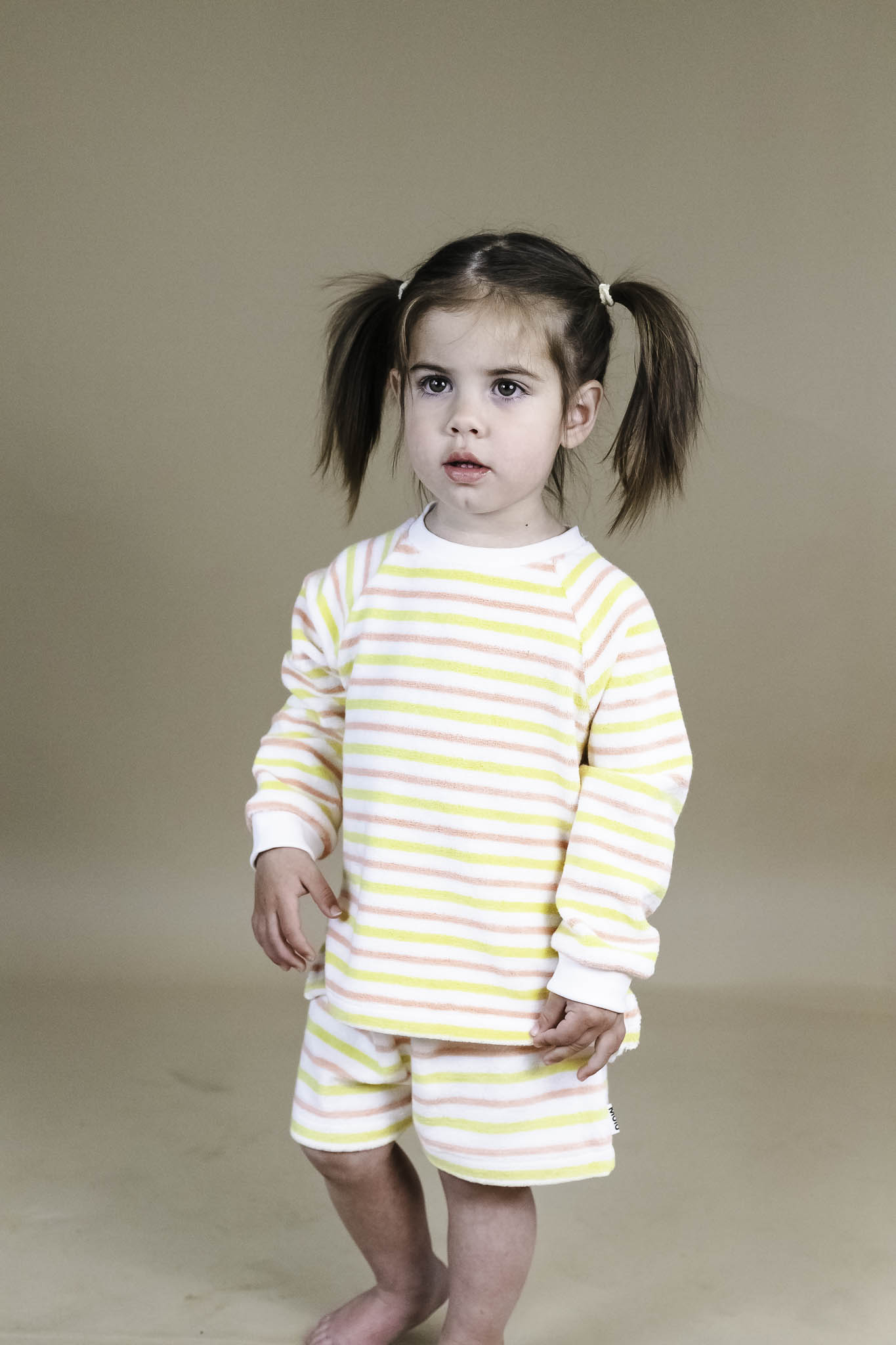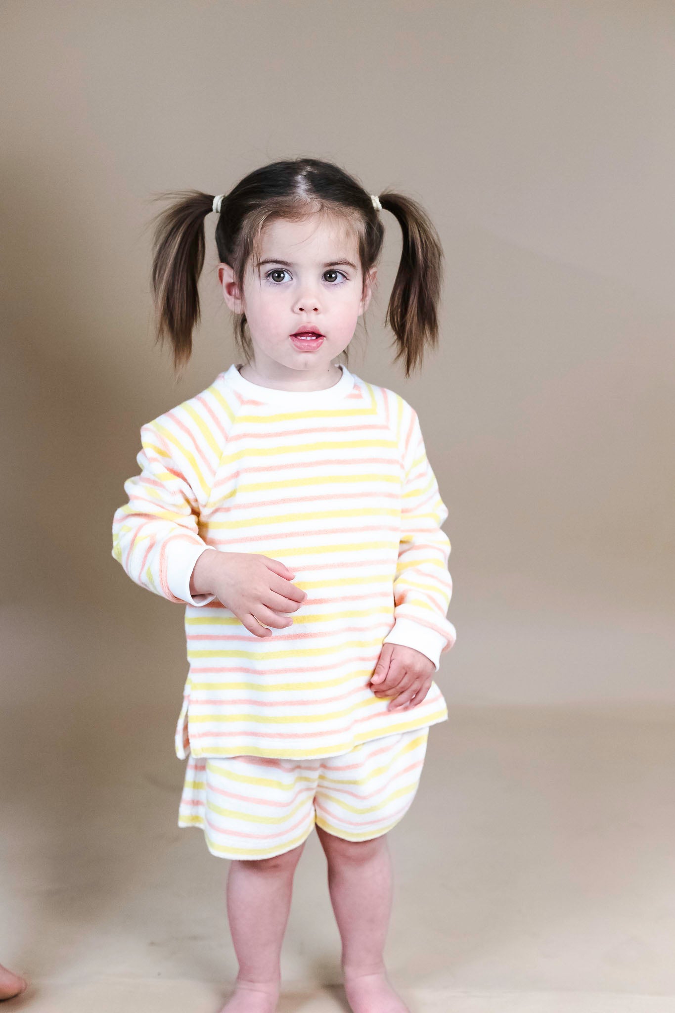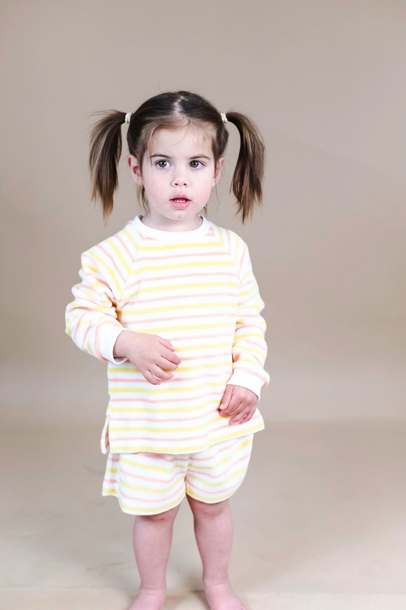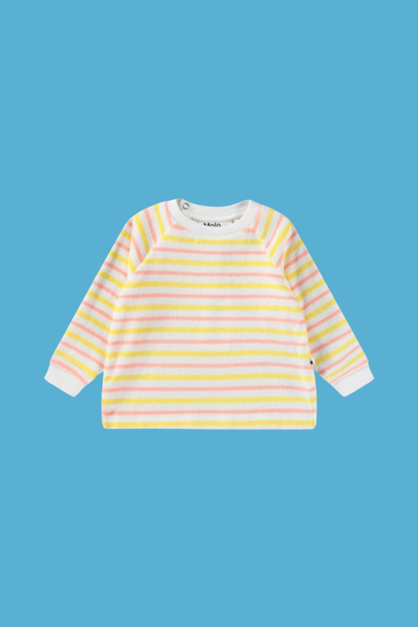 Outfit your little one in this happy, striped sweatshirt from Molo! It comes in pink-and-yellow and has a snap along the inner neckline.