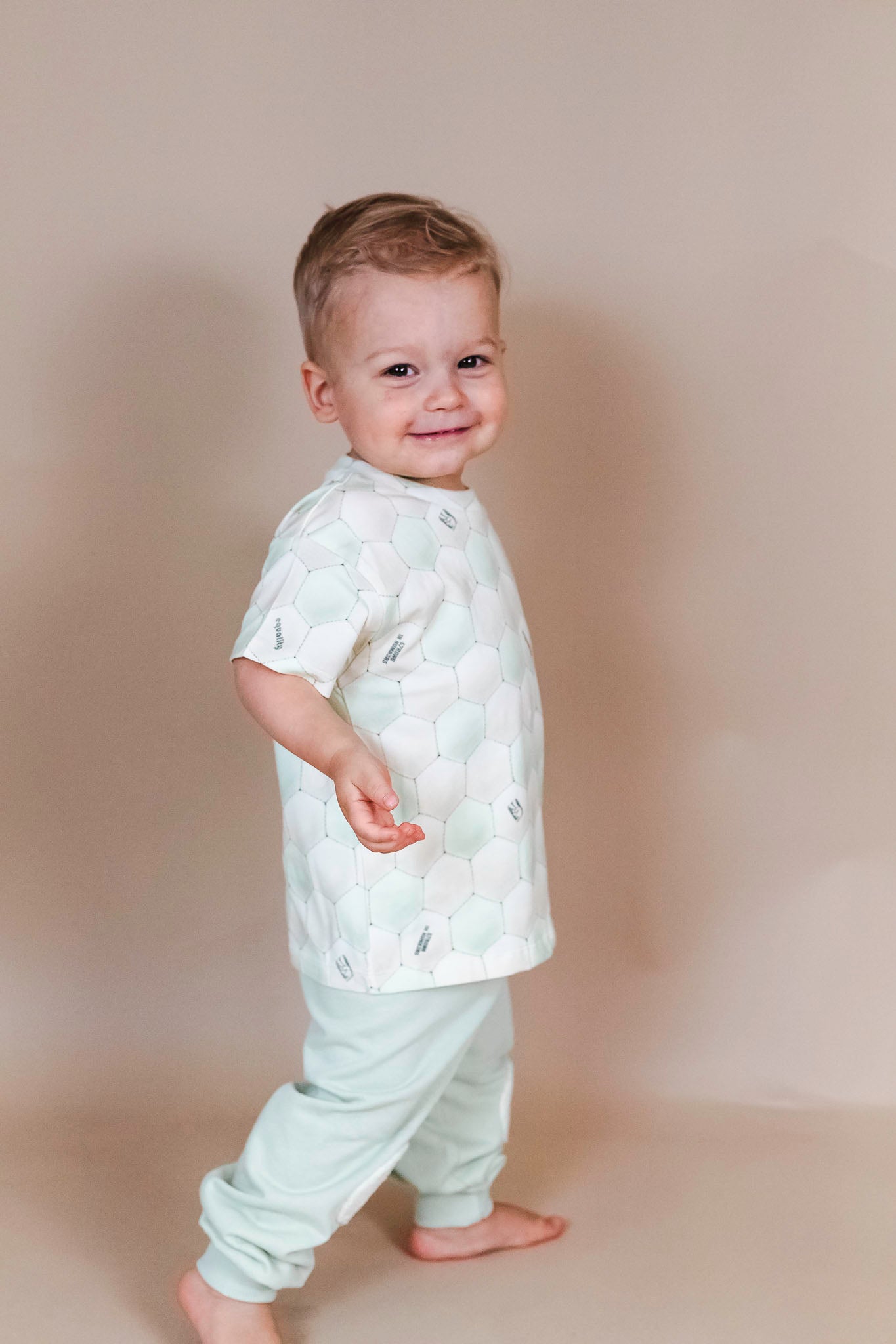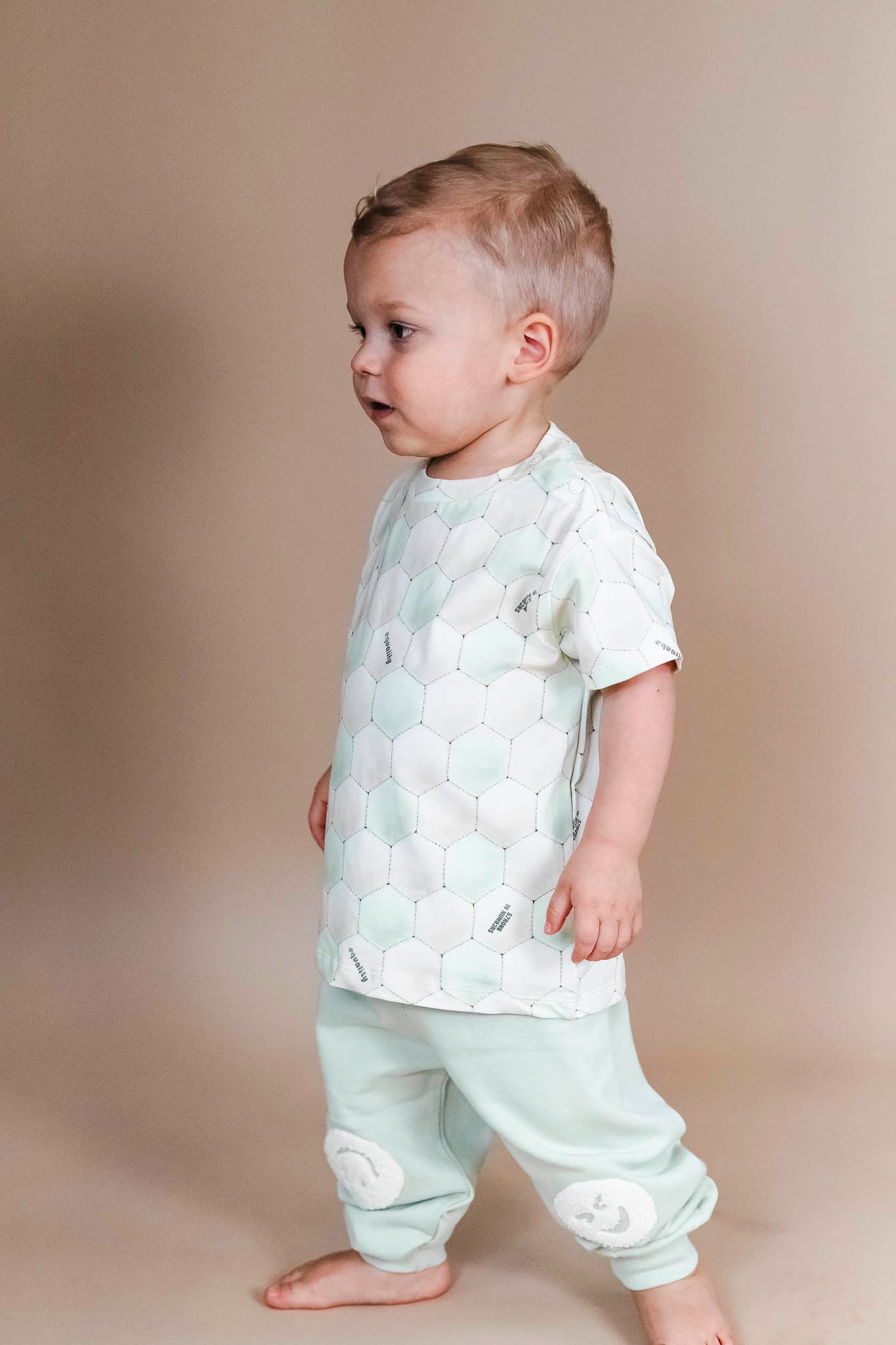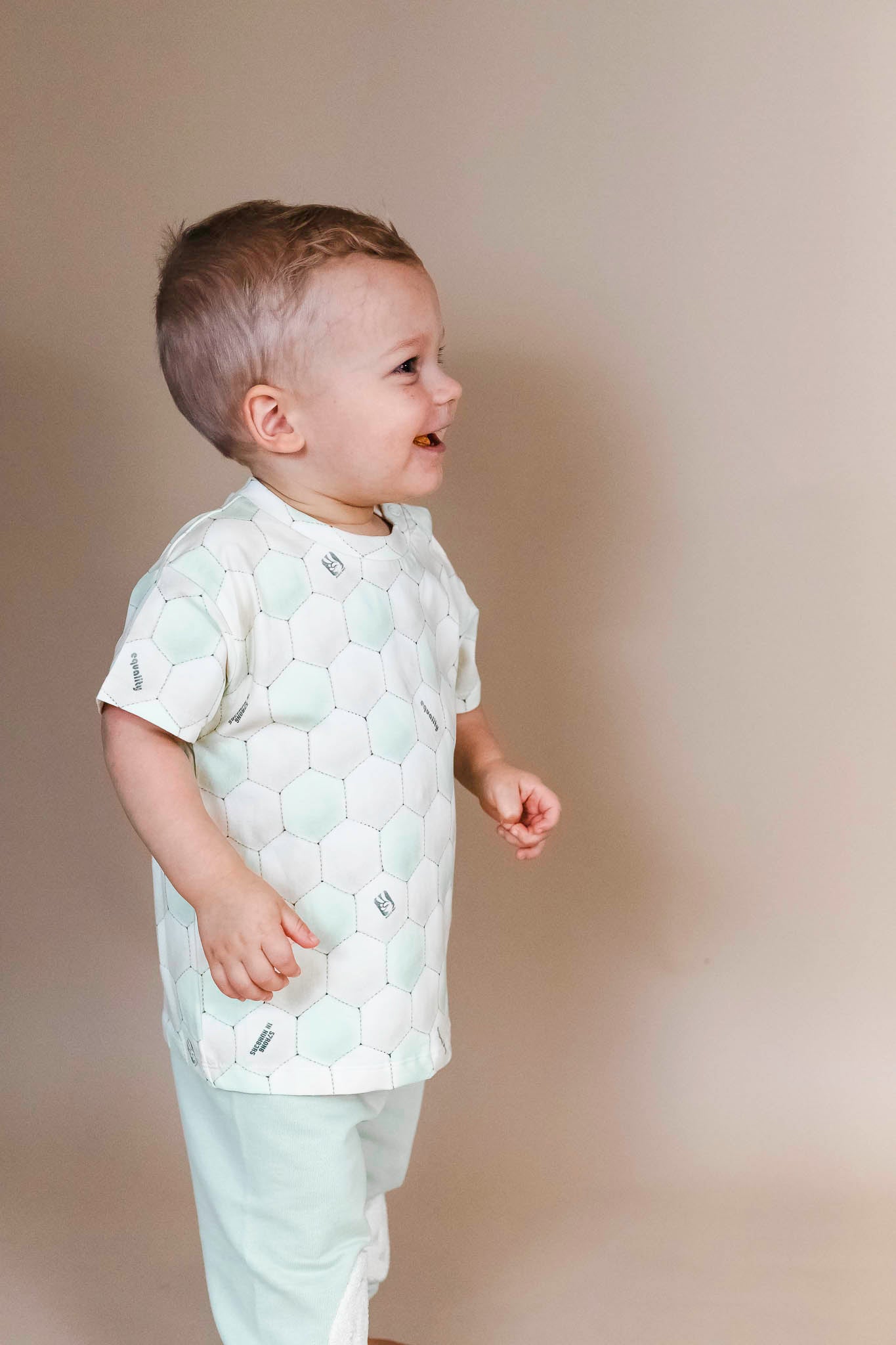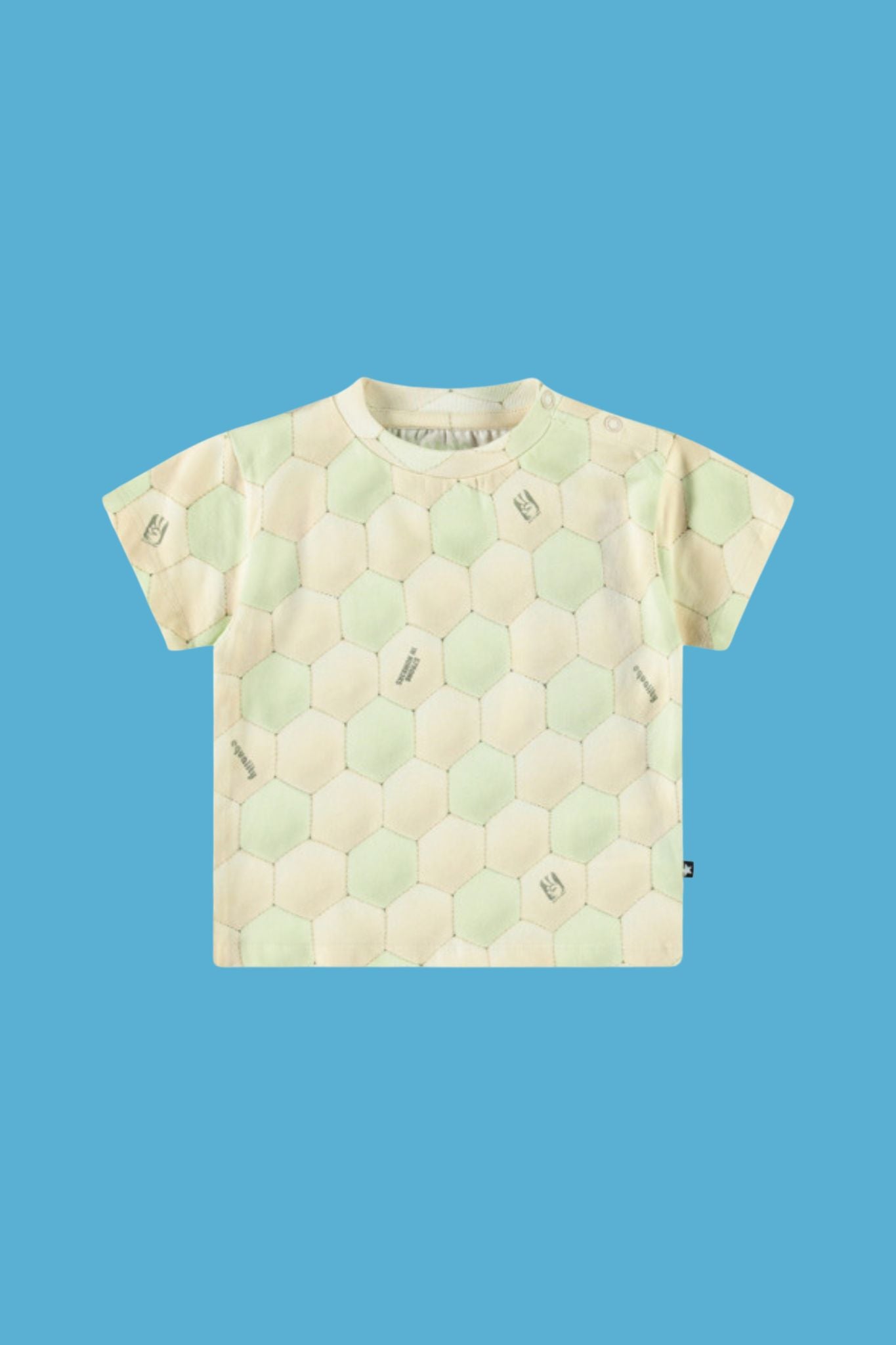 This unique t-shirt from Molo features an allover ball pattern, short sleeves, and a round neckline. It comes in a misty green hue.