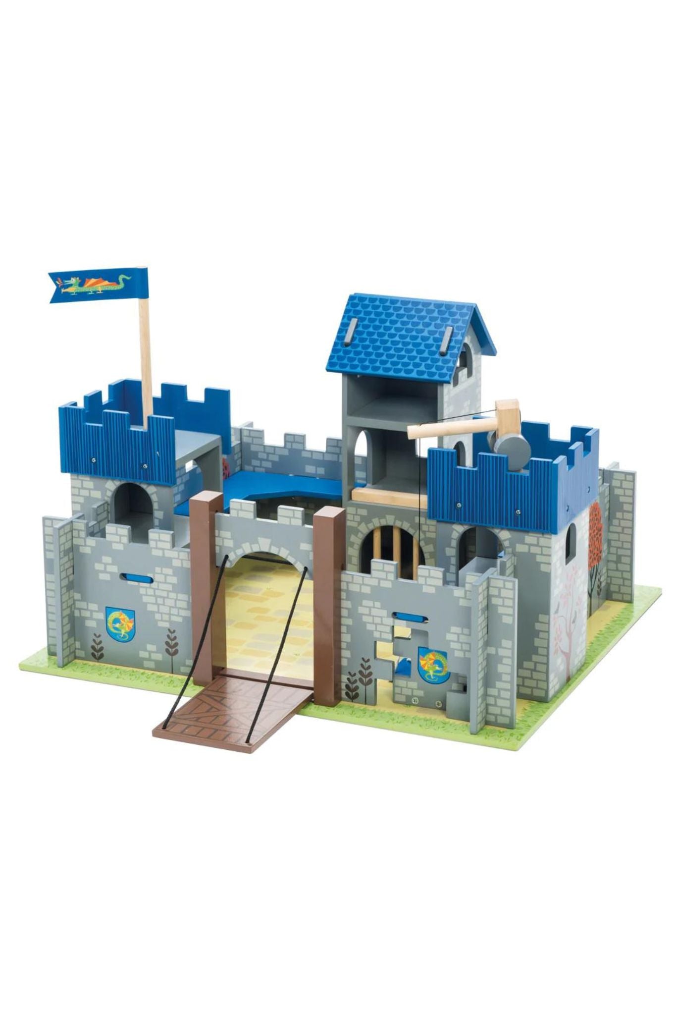 Take it back to Medieval Times with this exquisite castle from Le Toy Van! Deep blues and vibrant greens adorn various parts of this playset.