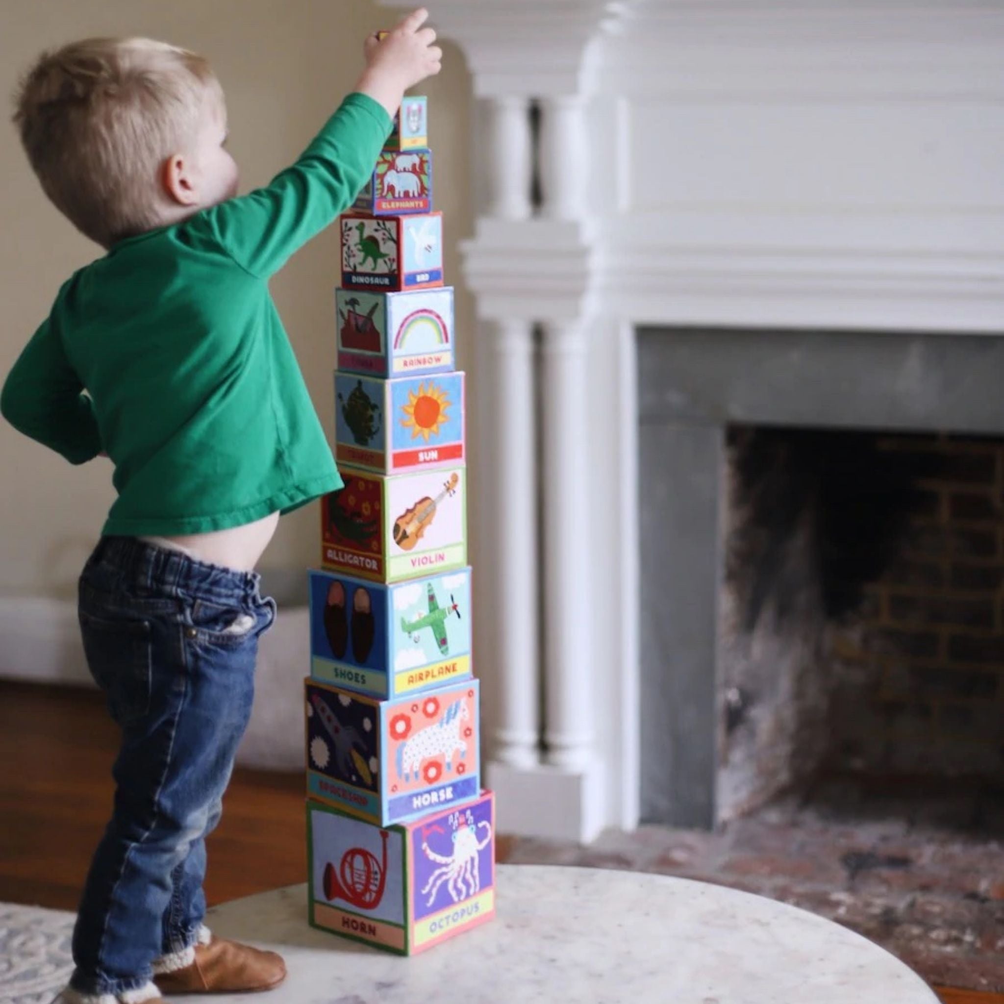Your little one is sure to love this Tot Tower by Eeboo! It includes 10 colorfully illustrated blocks of all different sizes, which help to promote language development.