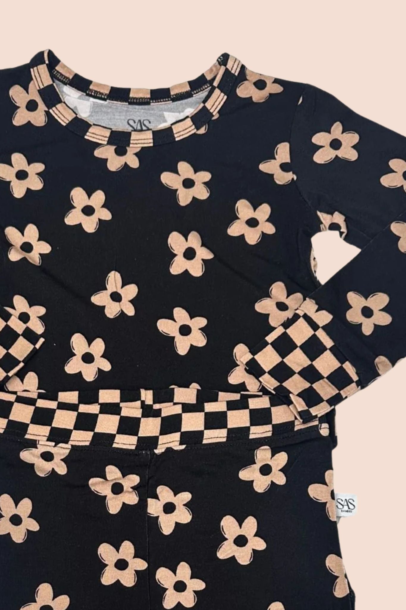 Bedtime just got a whole lot cozier with these two-piece girl pajamas by SAS Bamboo. The graphic floral print pops playfully against a black background, while the checkered cuffs add a cool, stylish twist, perfect for sweet dreams with a touch of fun.