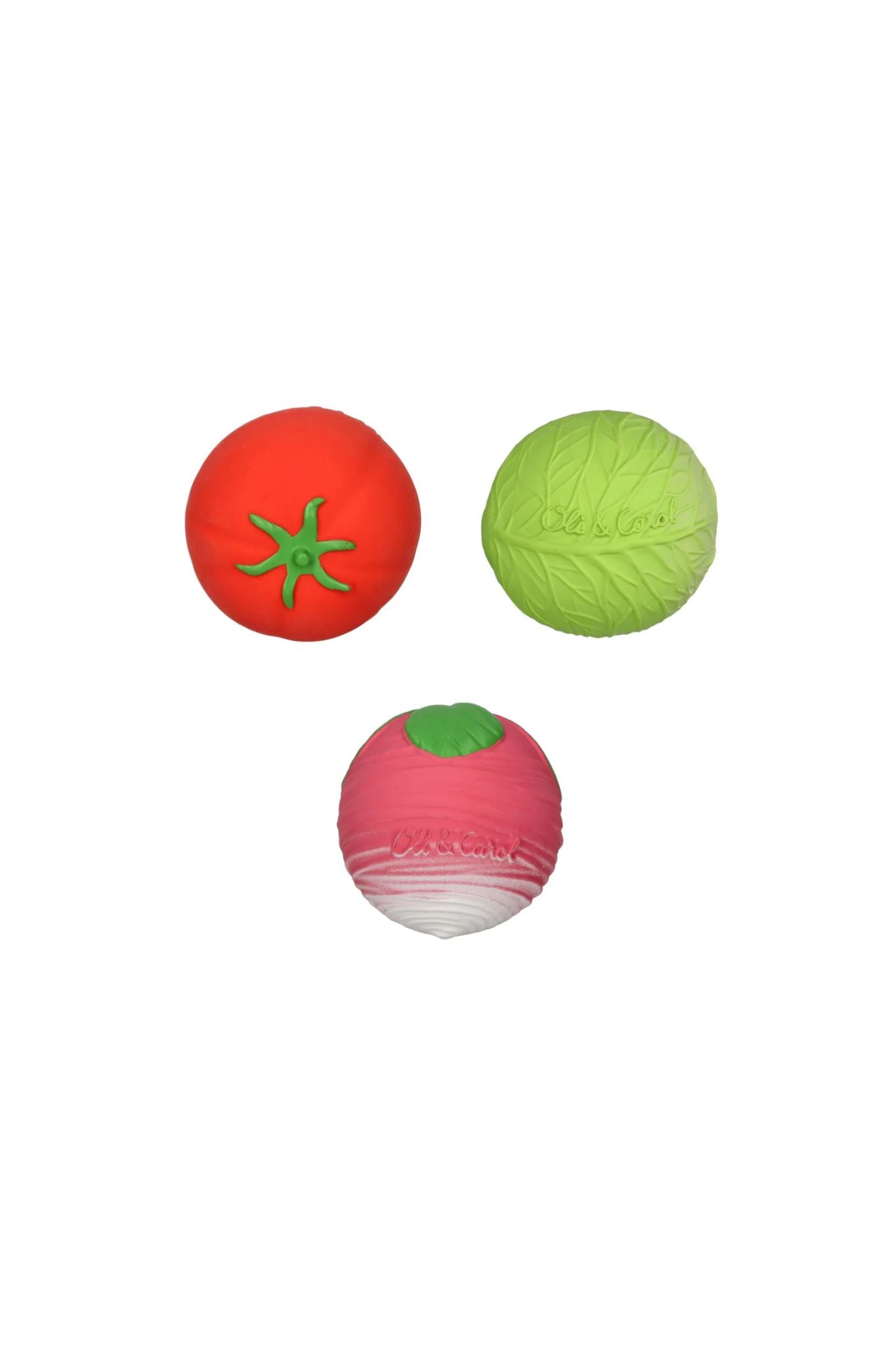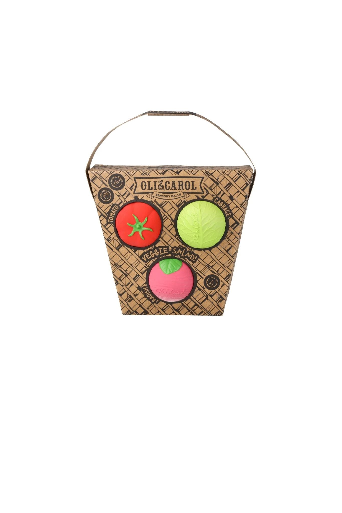 The Veggie Salad set includes 3 sensory balls—radish, tomato, and cabbage—to support sensory development and soothe teething gums. Made from 100% natural rubber, they’re eco-friendly, non-toxic, and free from plastic, PVC, and chemicals.