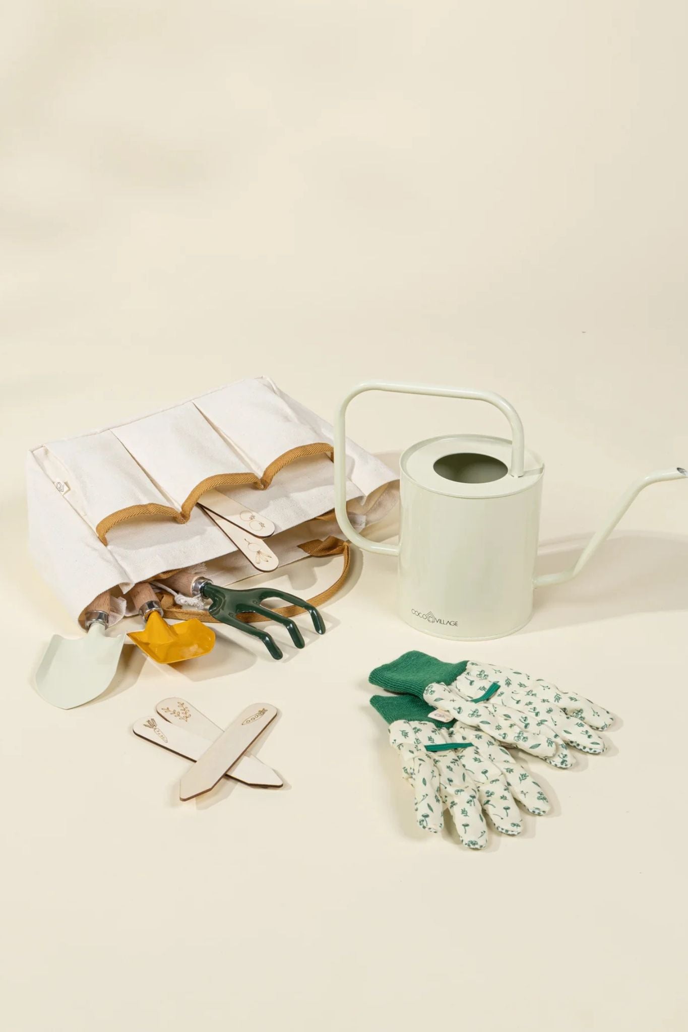 1 watering can, 2 gardening gloves, 5 wooden stakes, 1 shovel, 1 rake, 1 trowel, 1 transport bag