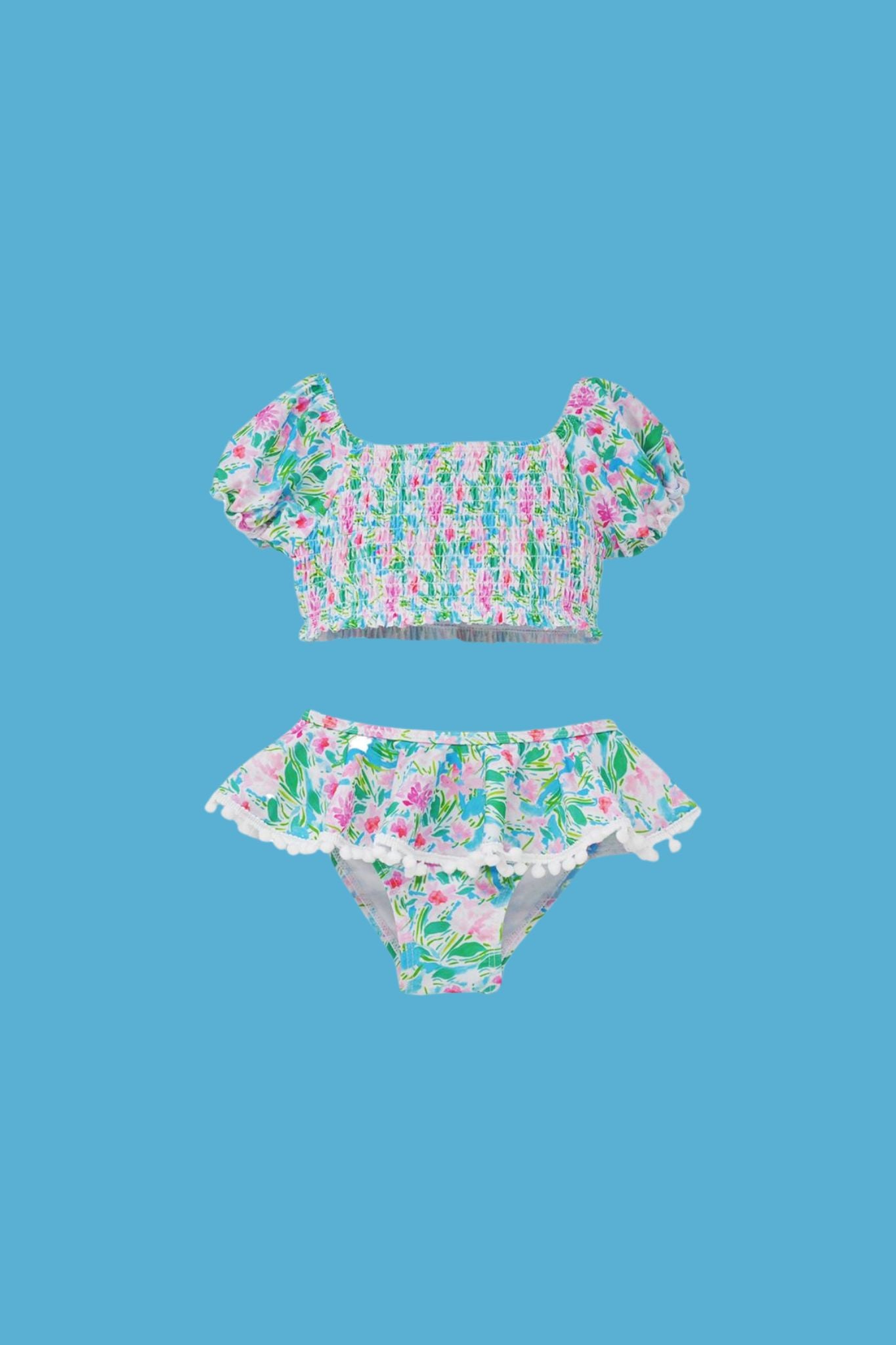 This beautiful bikini by Flap Happy has a vibrant, painterly floral print throughout. It includes a puff sleeve, smocked top and matching bottoms. The skirted bottoms have a fun pom-pom trim.