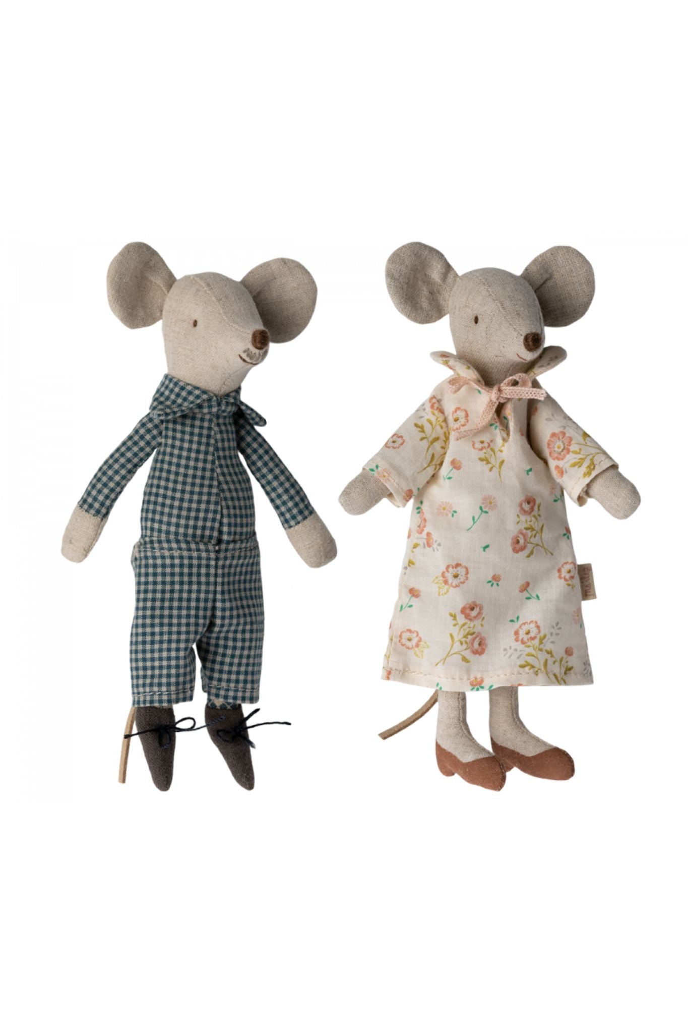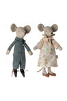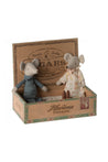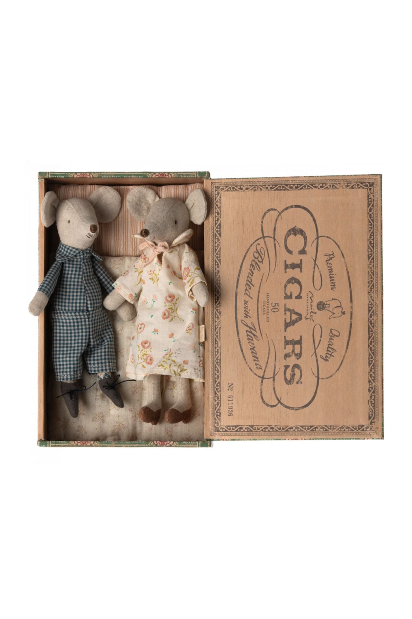 This Maileg cigar box holds the cutest elderly couple of mice! Grandma is outfitted in a floral dress, while grandpa wears all checker print.