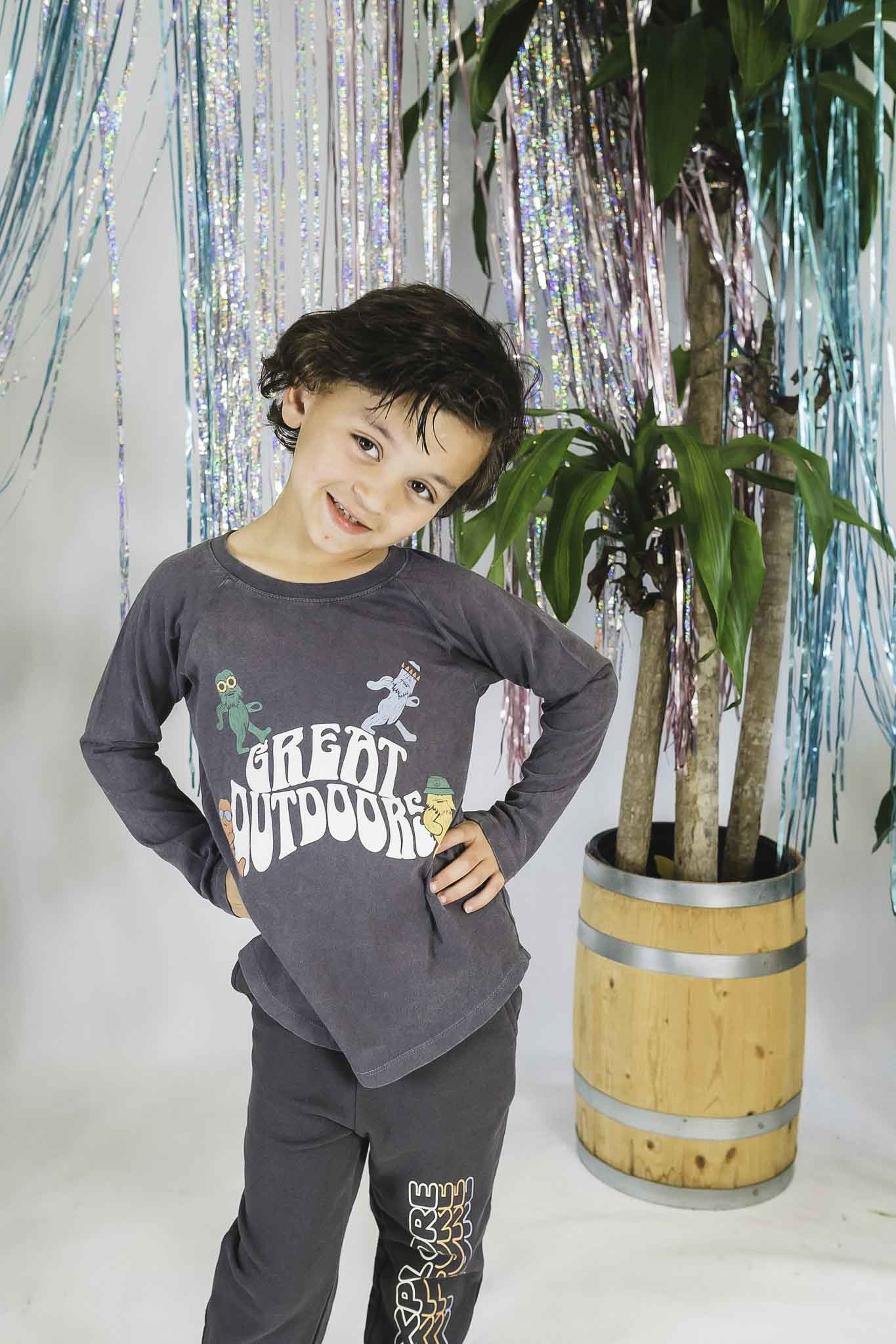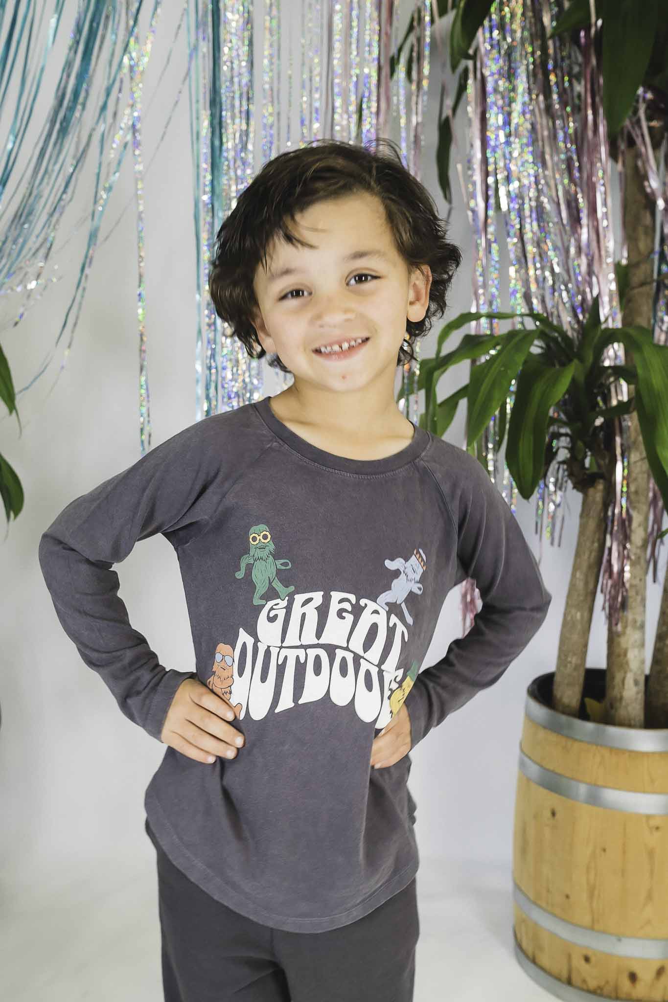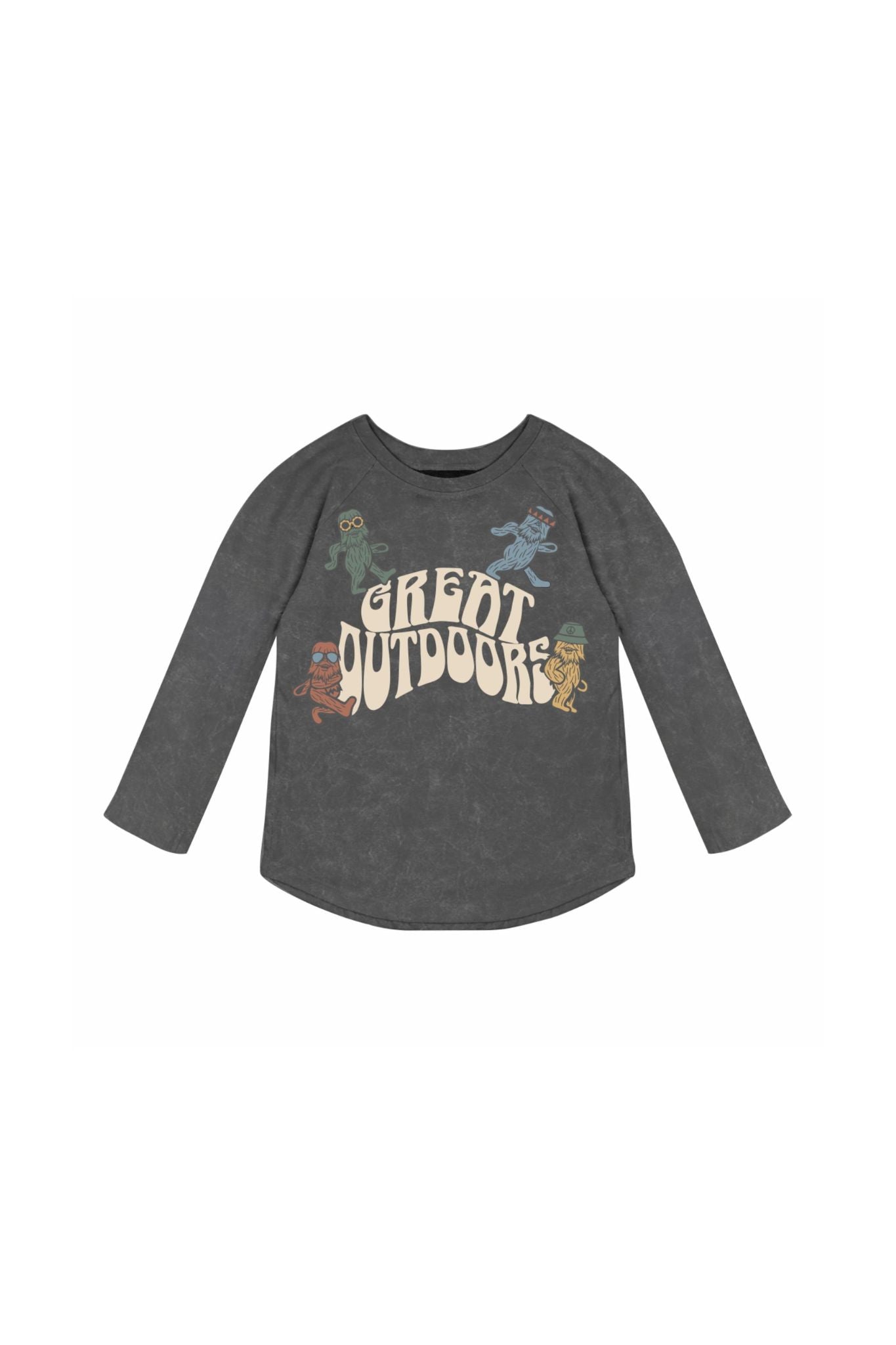 Get outside! This long-sleeved, Tiny Whales tee comes in grey and features 'Great Outdoors' written across the front. Fun characters make up both the front and back graphics.