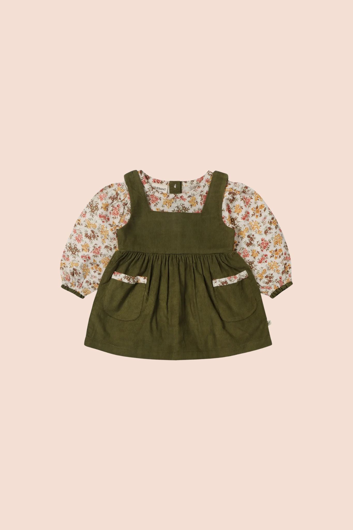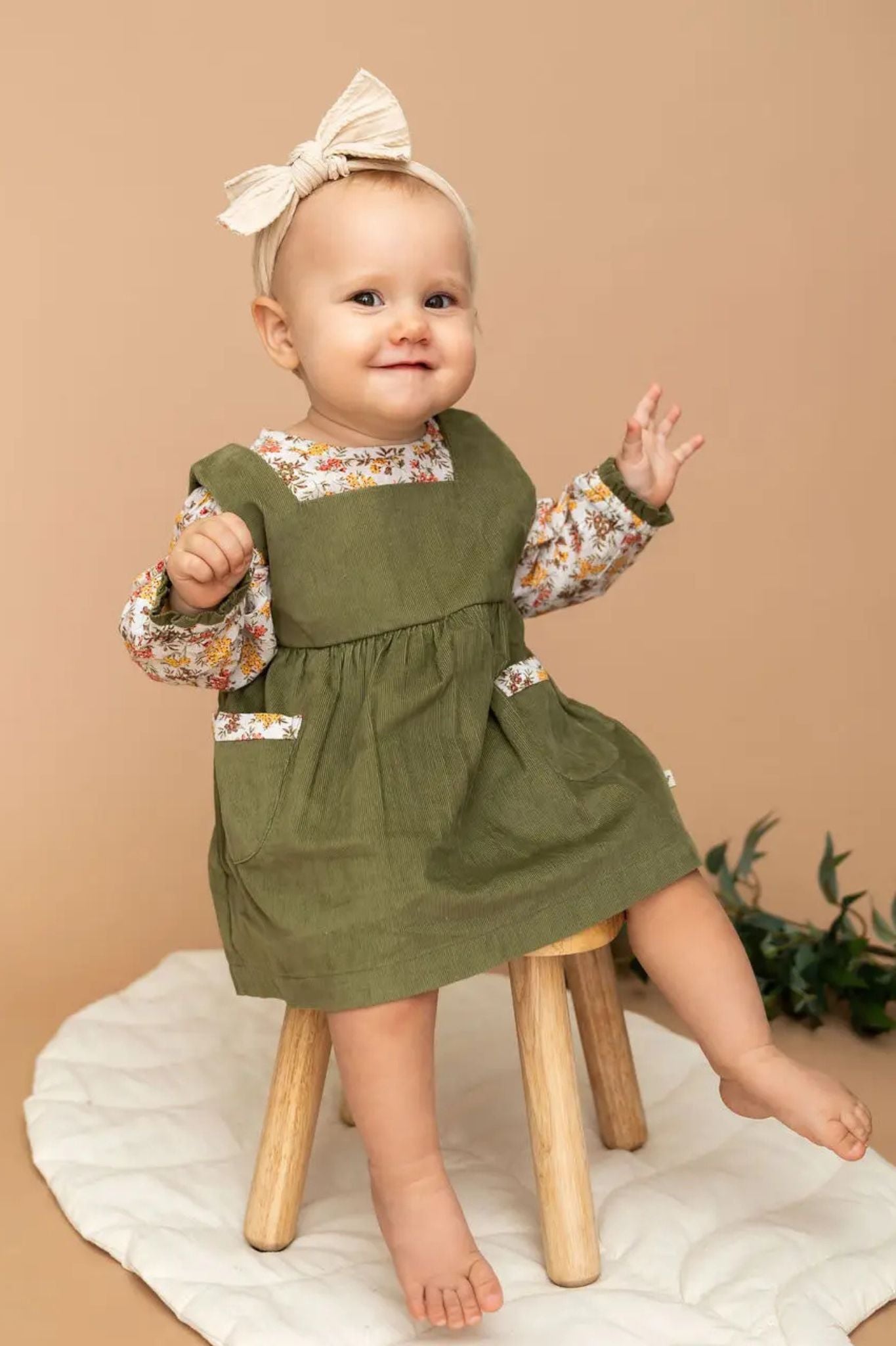 Add a touch of charm to her little wardrobe with this baby girl pinafore dress and bloomer set by Viverano. The dress sleeves and matching bloomers feature a warm-toned floral pattern, while the pinafore’s patch pockets are topped with a sweet coordinating floral detail, perfect for playful days, cozy naps, or special moments.