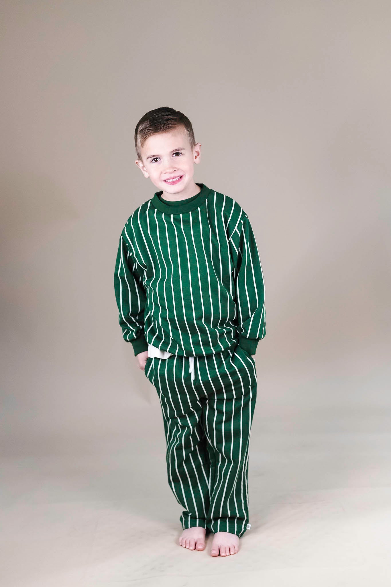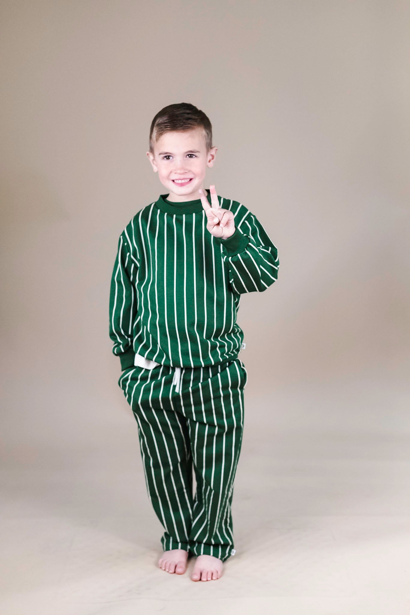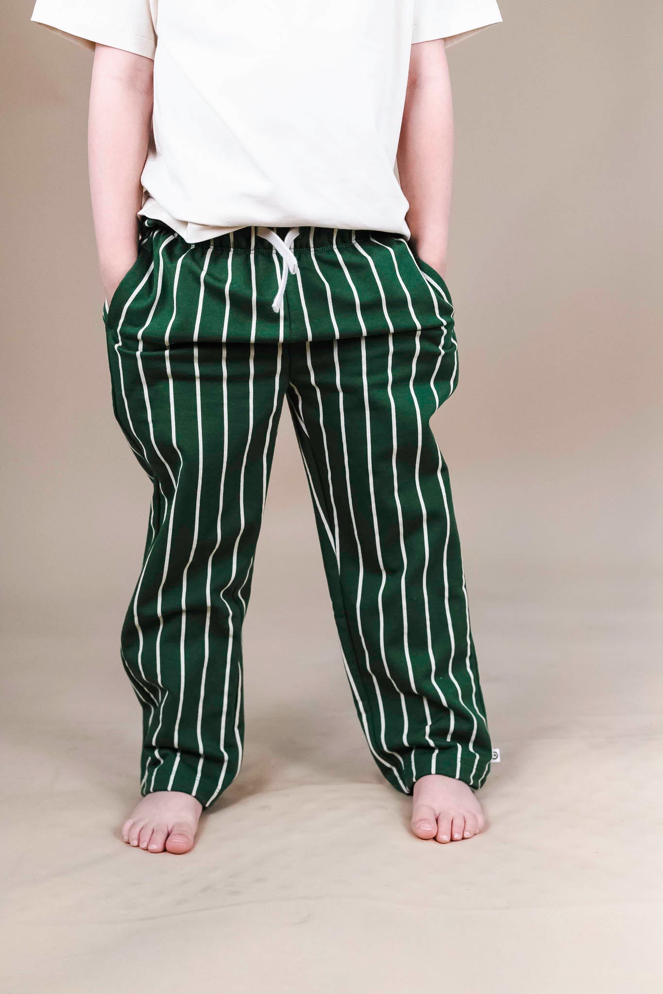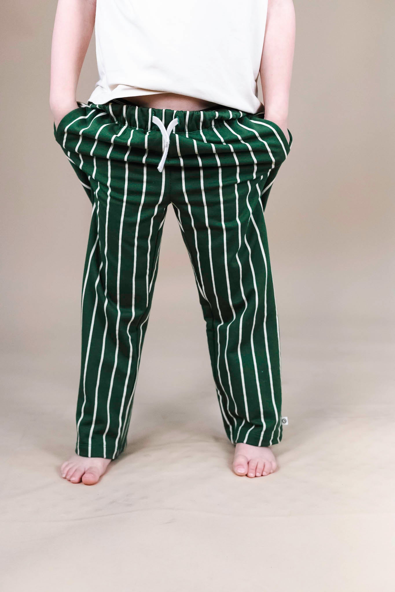 Cool, comfy, and made to move! These green sweatpants by Musli feature sporty vertical stripes, side pockets, and an adjustable elastic waistband with ties.