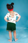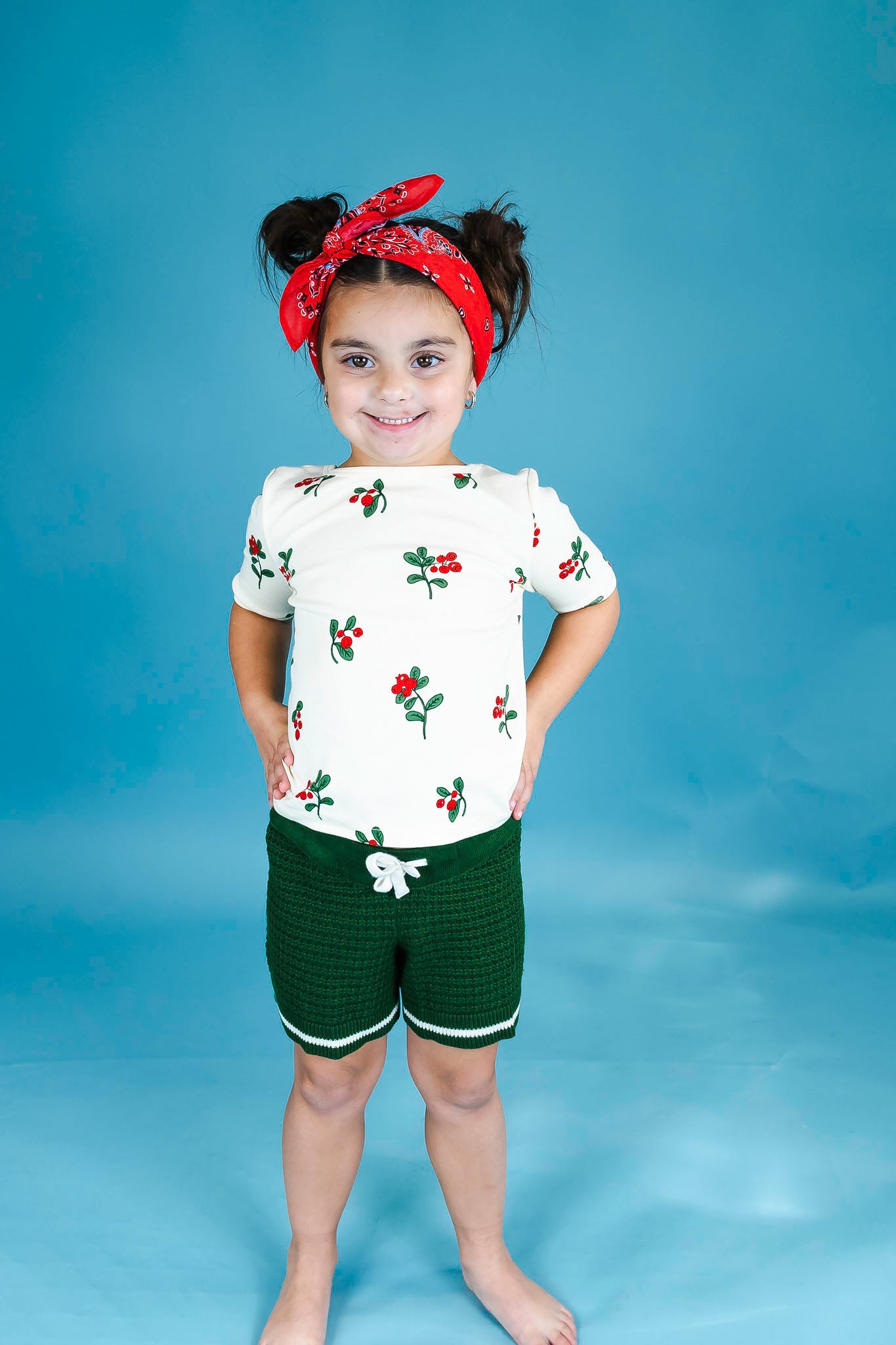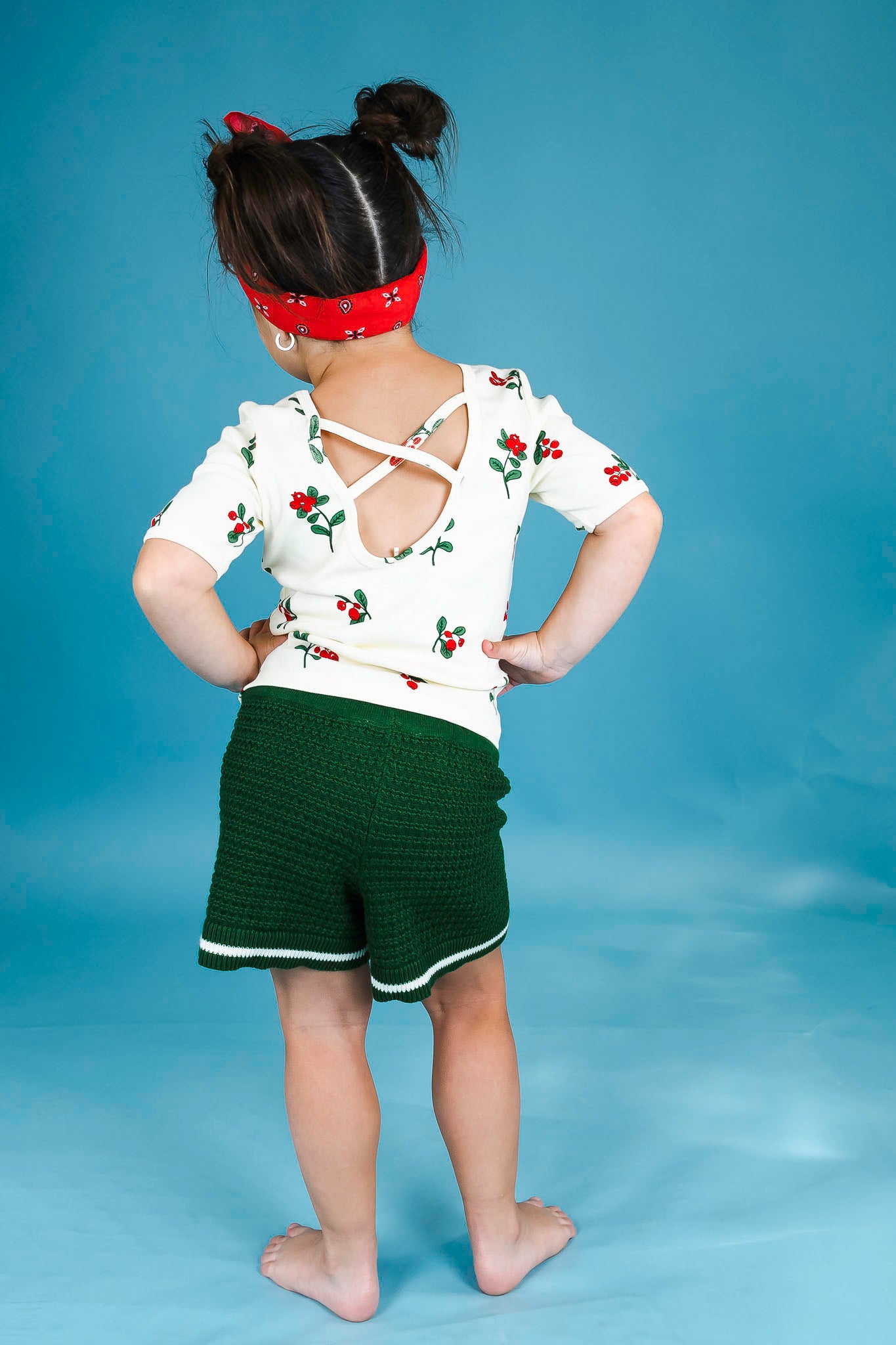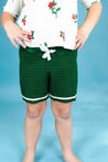 Outfit your girl in these green crochet shorts from Mini Rodini! They feature a white tie at the waist and a white stripe on the hem.