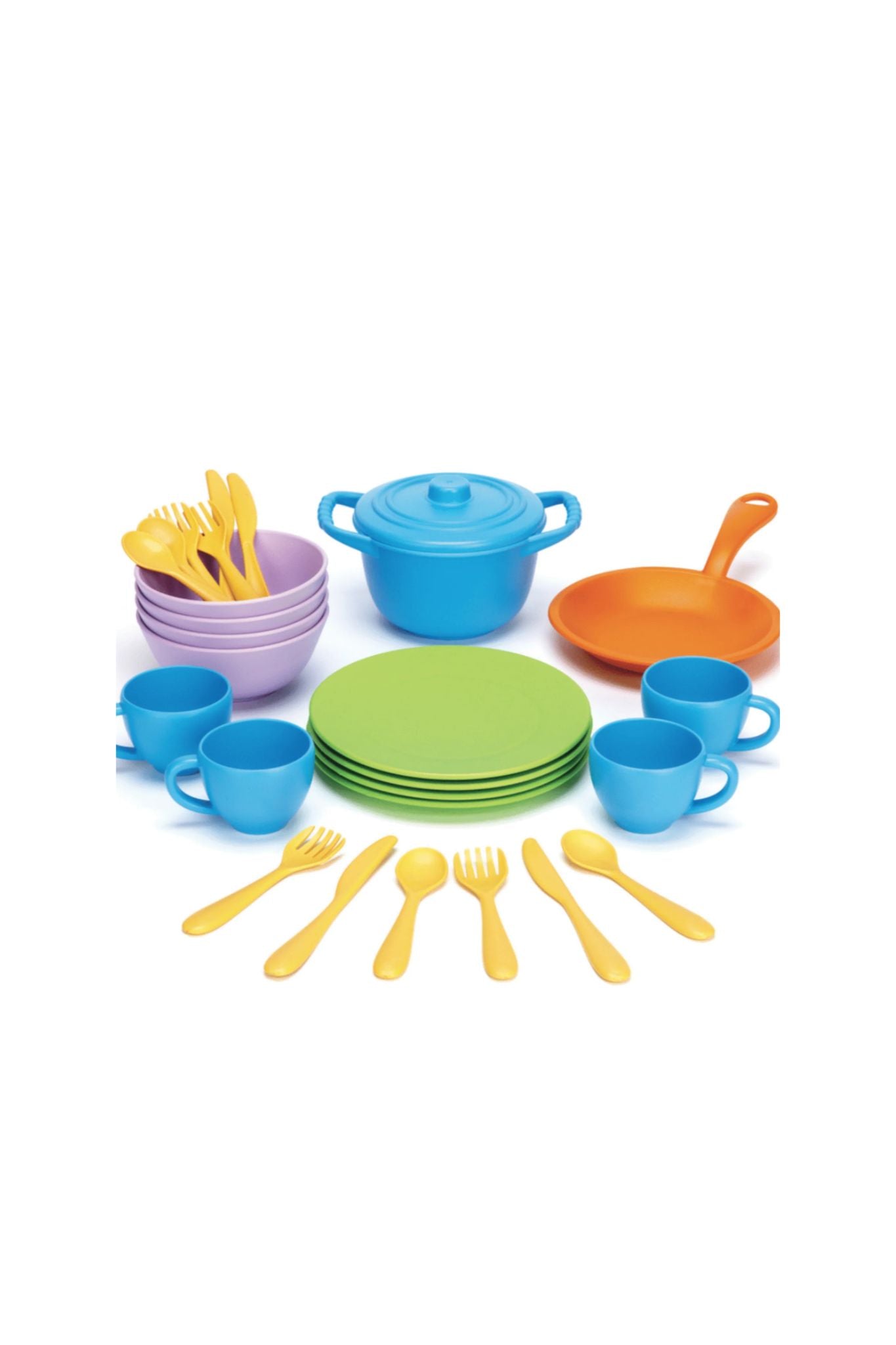 Cook up a storm! This Green Toys dining set features an array of multicolored utensils, plates, bowls, cups, and more- all made from recycled plastic.