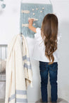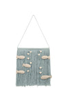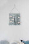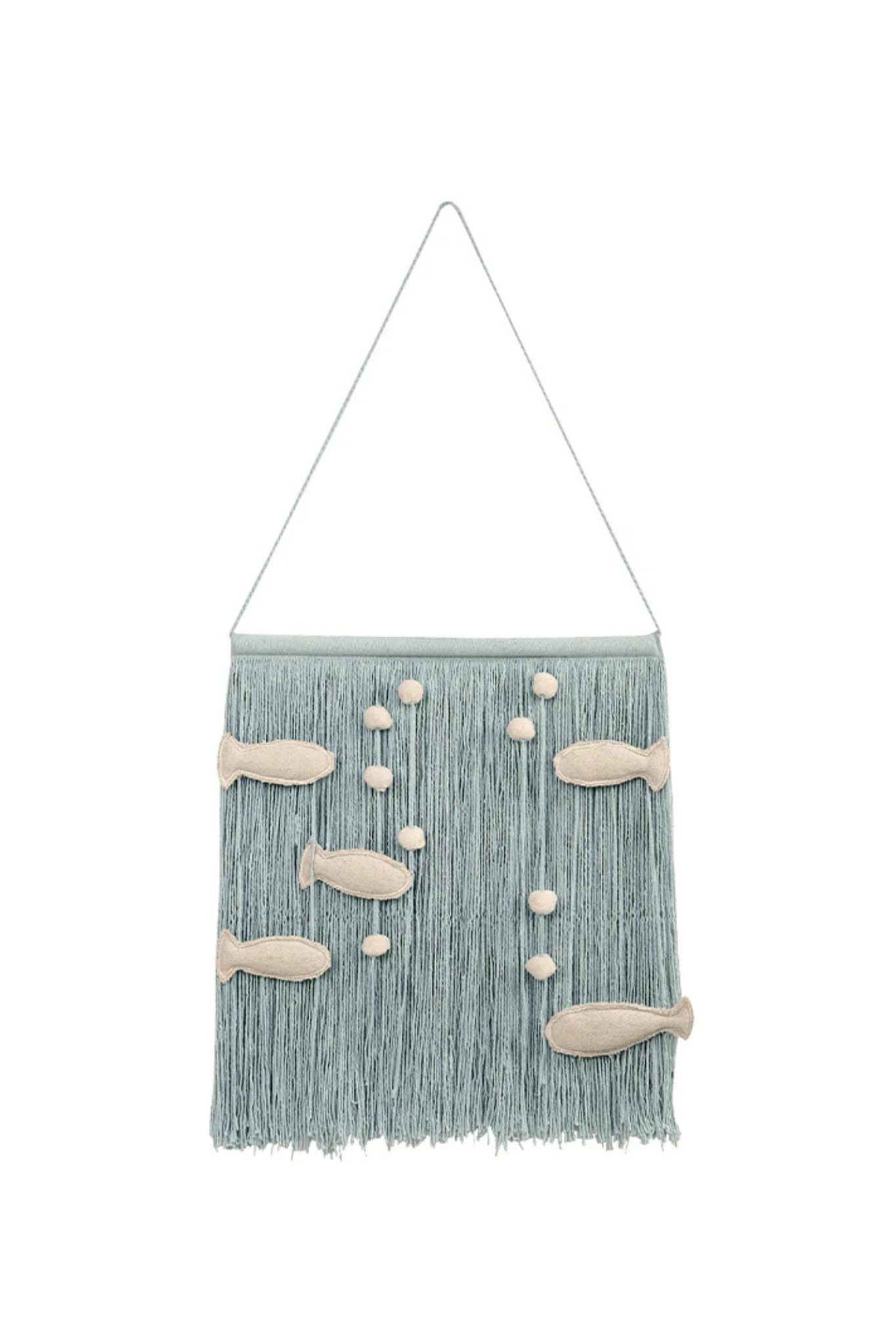 Inspired by the beauty of the sea, this wall-hanging captures the essence of a gentle waterfall or a wave's edge. The soft pale-blue cotton fringe creates a serene backdrop, while tiny stuffed fish and playful pompom bubbles add a whimsical touch.