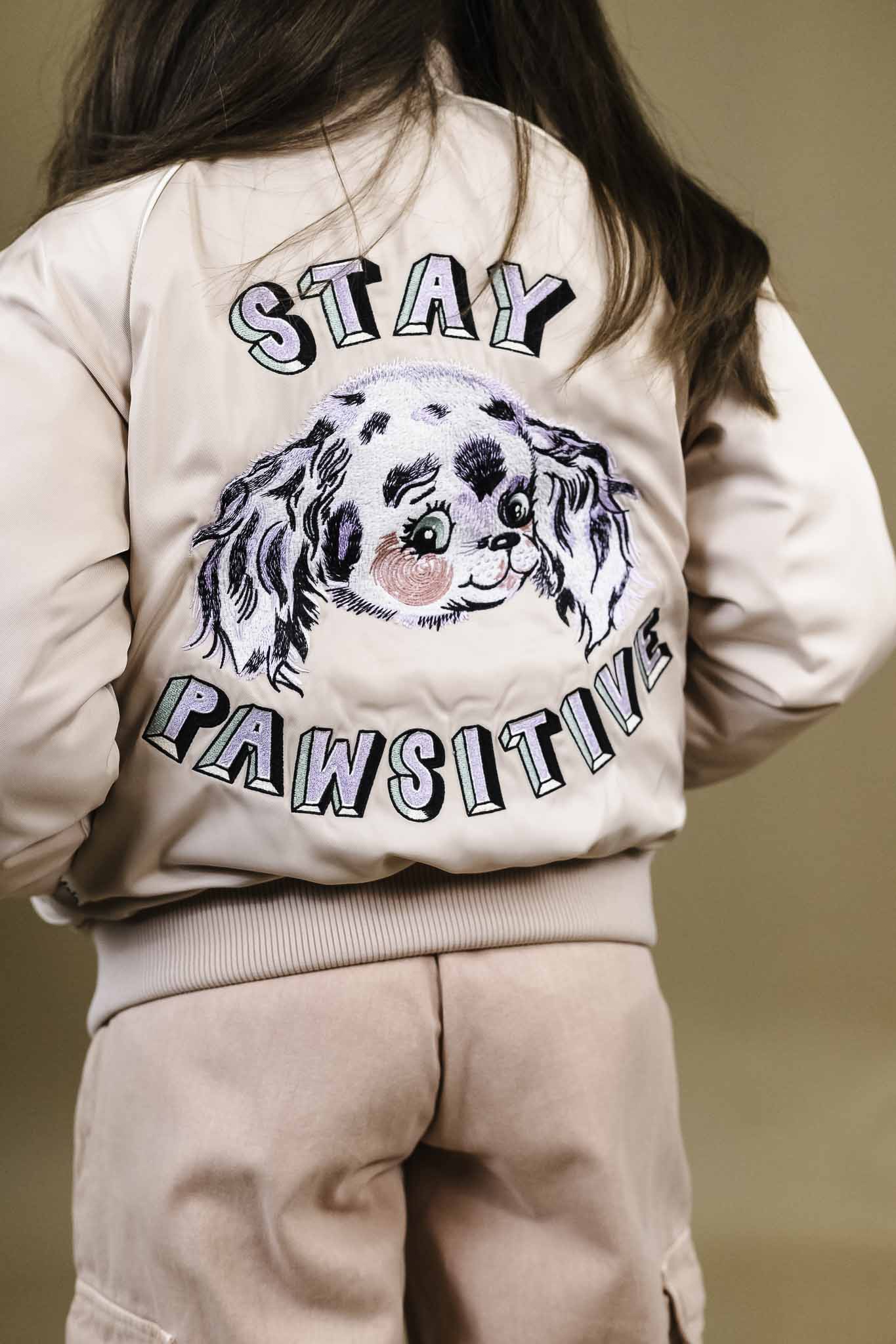The pink Hatty Stay PAWsitive Coat is all about good vibes and cuteness overload. On the back of this bomber style jacket, you'll find an adorable embroidered pup reminding everyone to "Stay Pawsitive." It's got a comfy regular fit, handy front pockets, a zip-up front for easy wear, and ribbed edges at the neck, wrists, and waist to keep things snug and stylish. Perfect for turning any sidewalk into a catwalk β err, dogwalk!