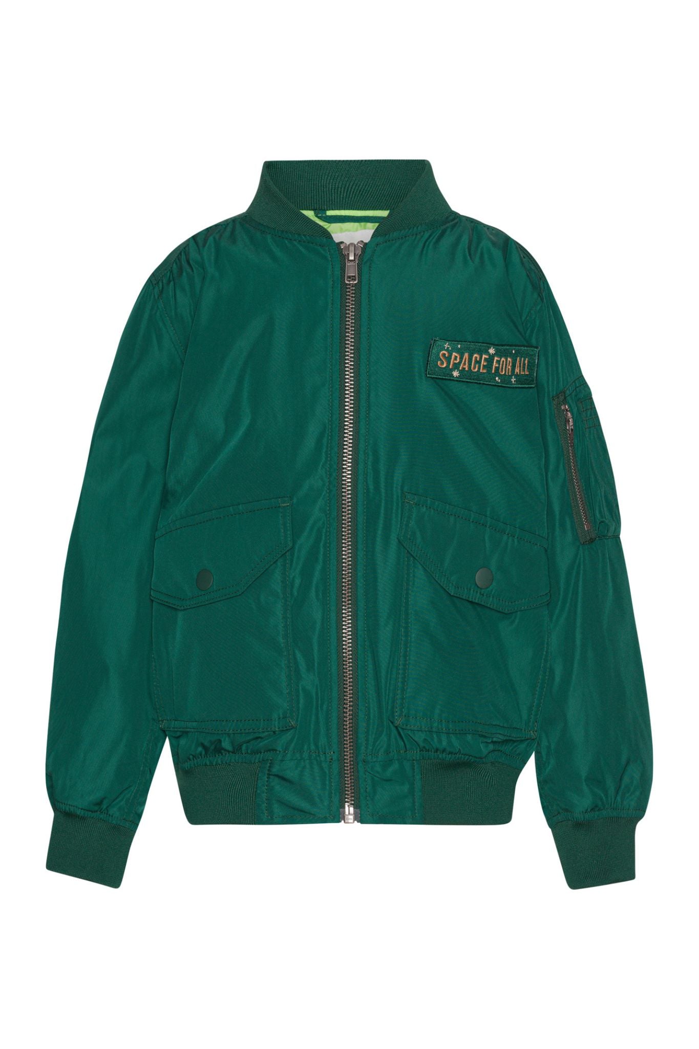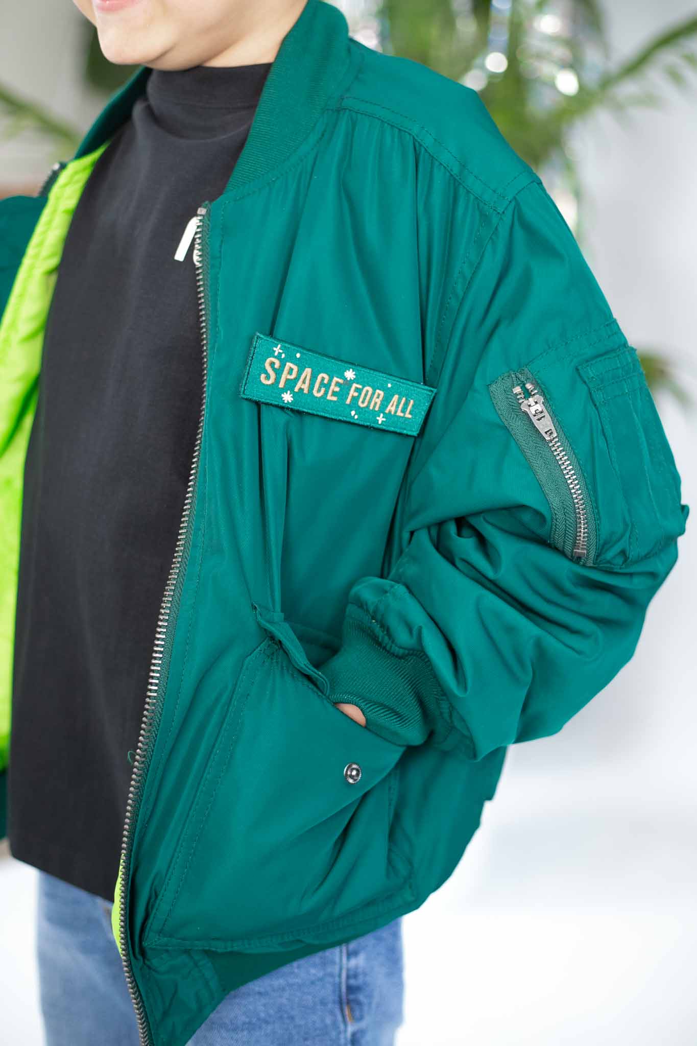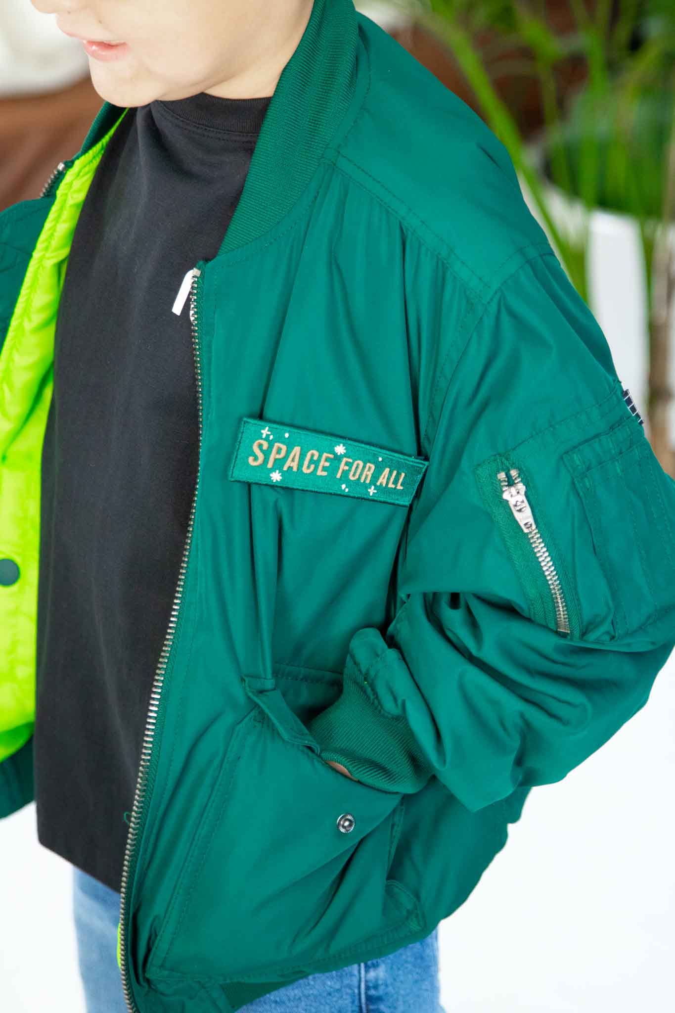 This space-themed bomber jacket is perfect for transitional weather! It comes in a forest green hue and features a 'space for all' patch at the side chest. Zippers and pockets throughout make for a utilitarian look.