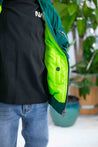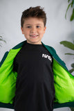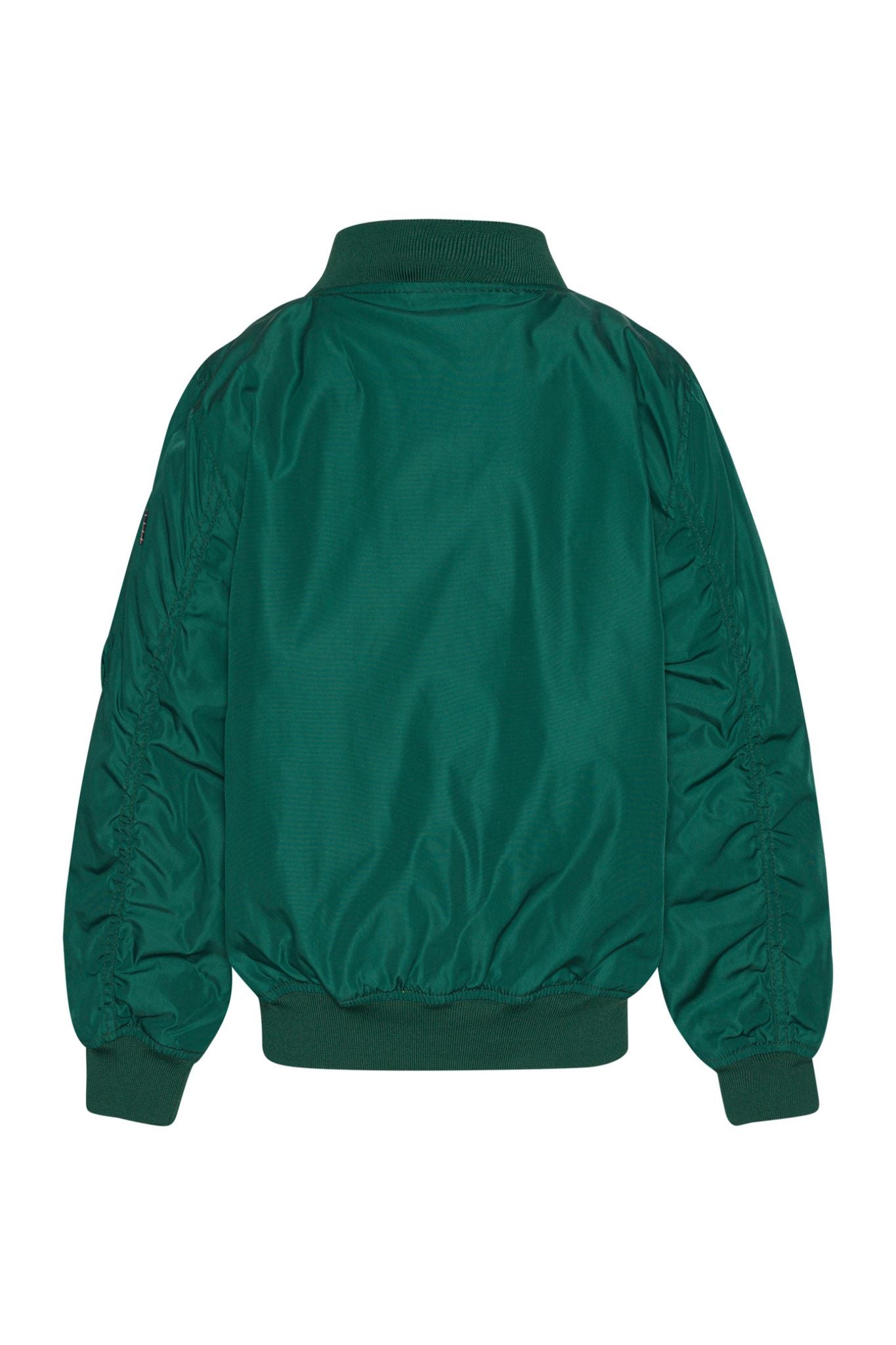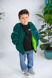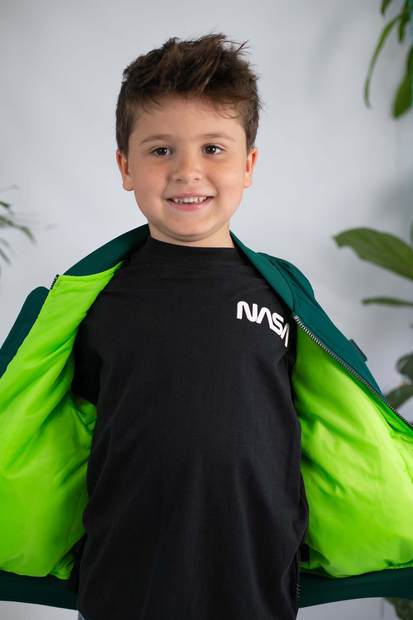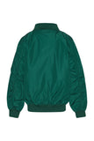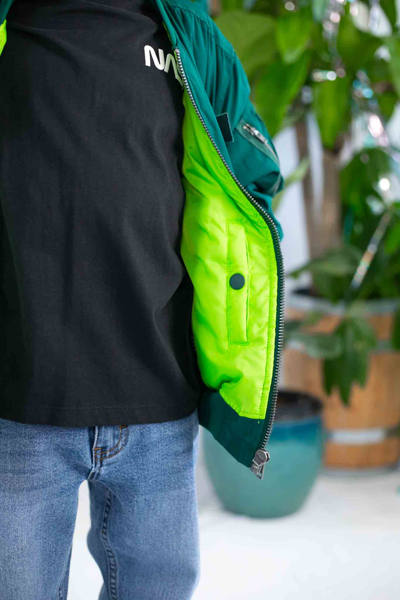 This space-themed bomber jacket is perfect for transitional weather! It comes in a forest green hue and features a 'space for all' patch at the side chest. Zippers and pockets throughout make for a utilitarian look.