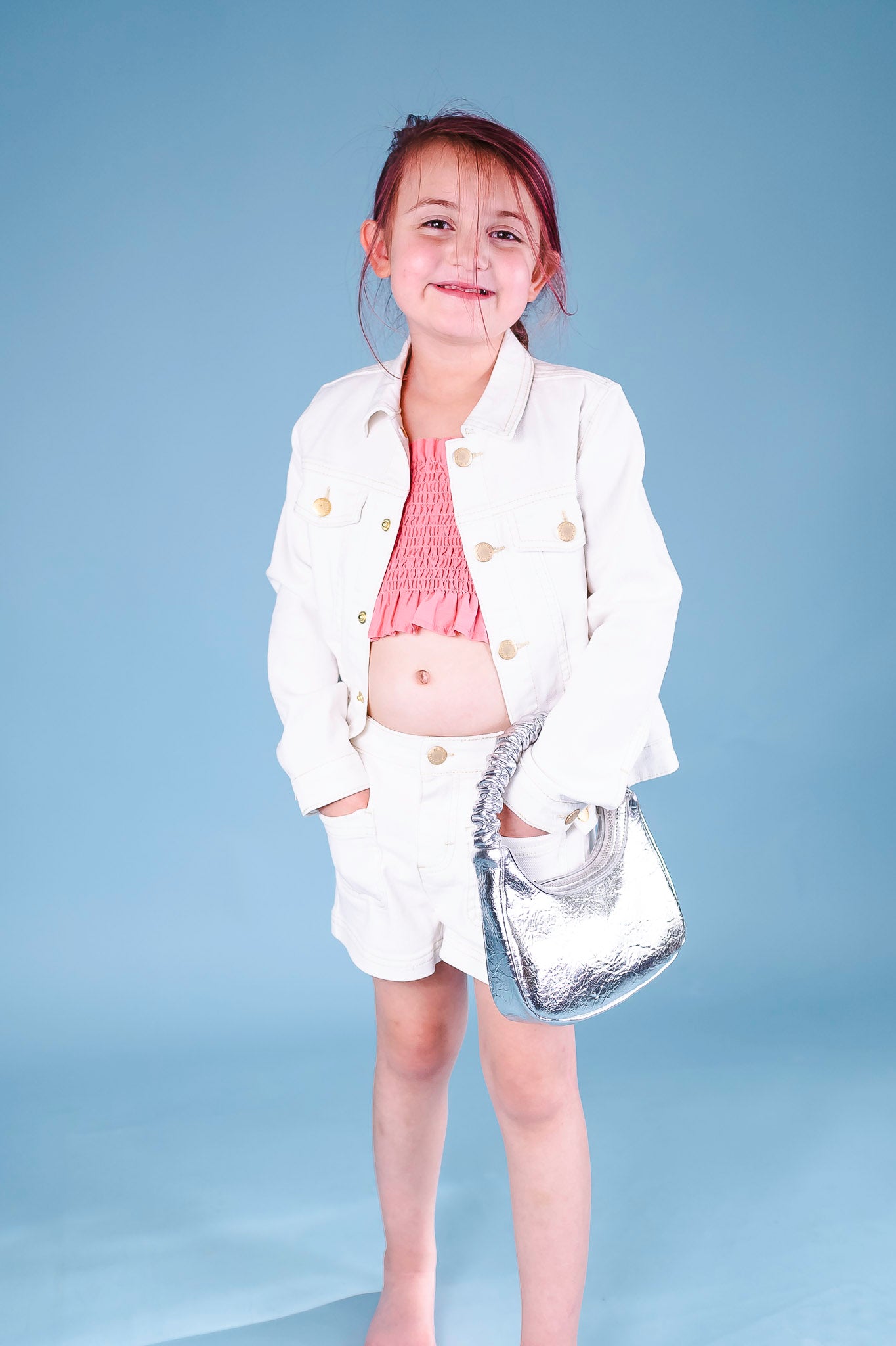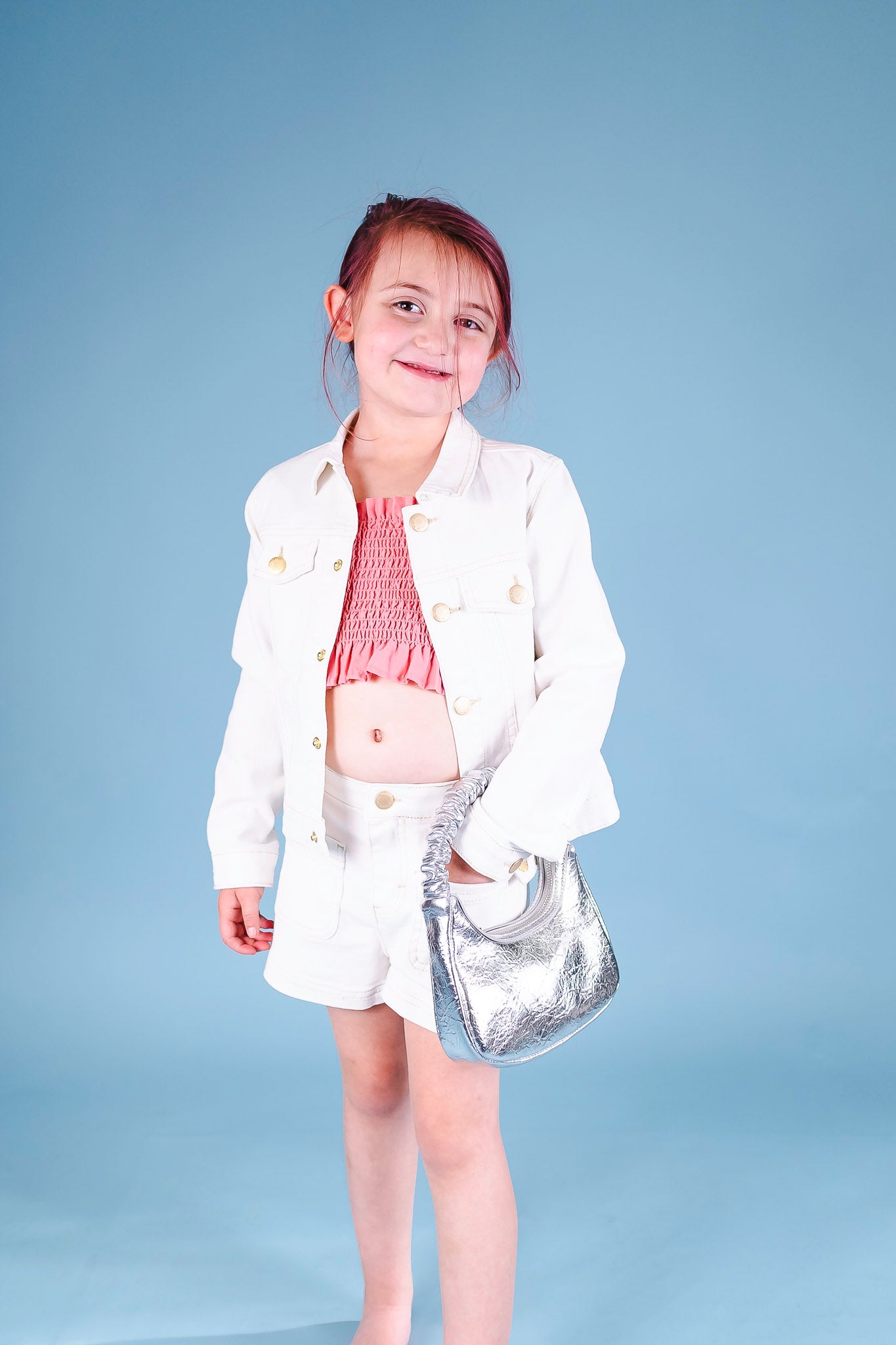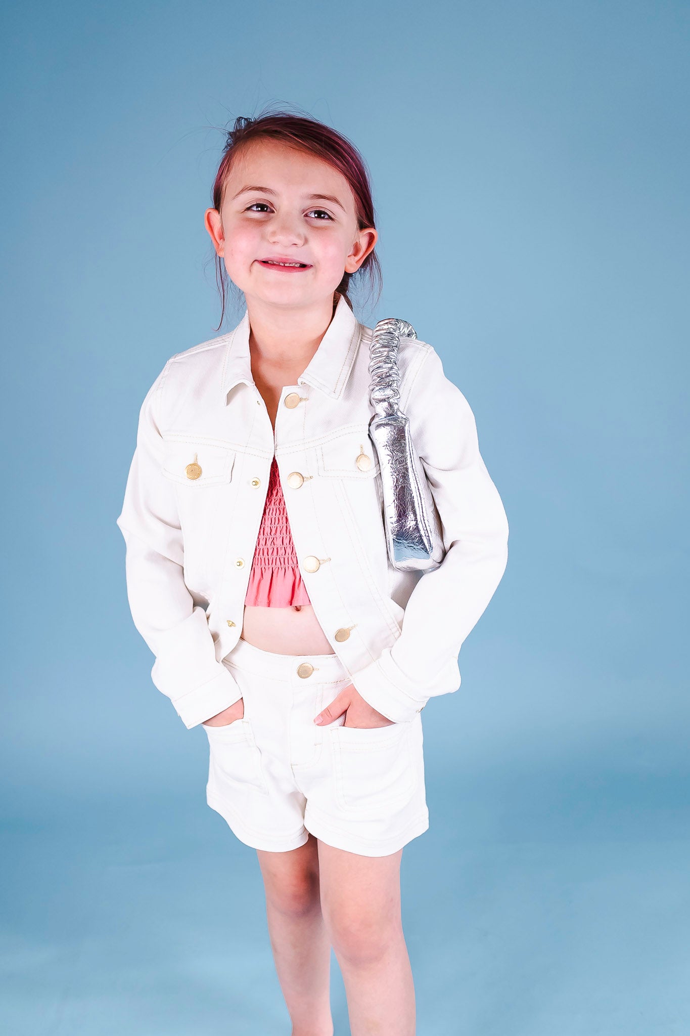 This crisp denim jacket from Molo comes in a bright white hue and features gold buttons throughout. Add a pair of shorts to complete the outfit.