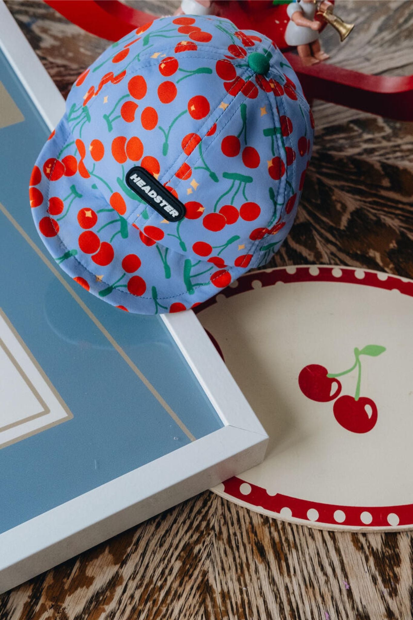 Cute as can be, this Headster cap features an allover cherry print atop a lavender ground. The short brim makes this hat super unique.