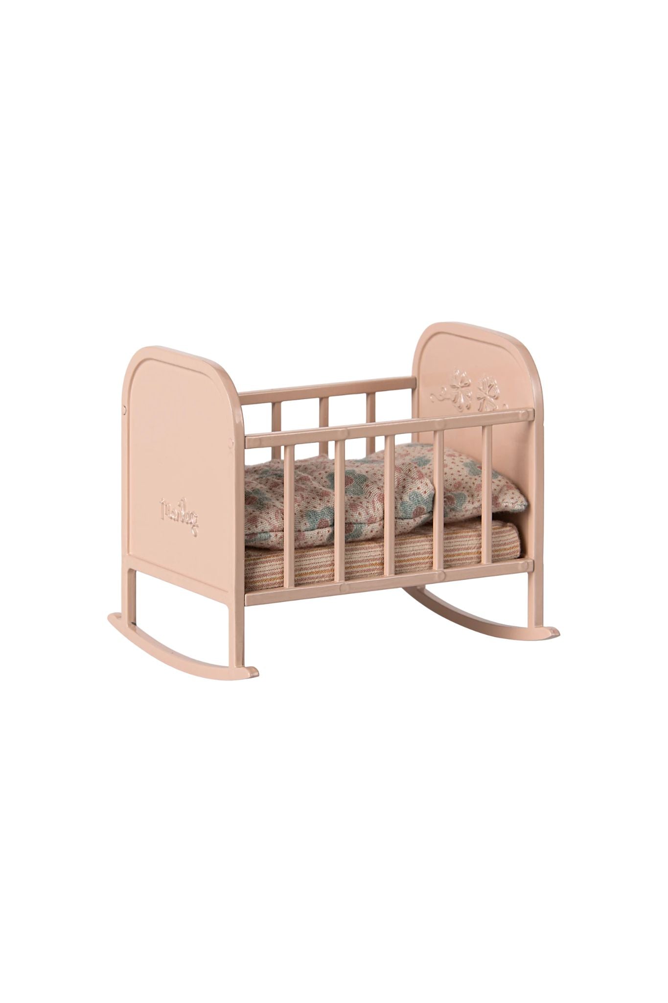 This beautifully designed metal cradle features a soft sleeping bag and mattress. With a delicate flower embossment on the headboard and rounded legs, it gently rocks your littlest toys to sleep.