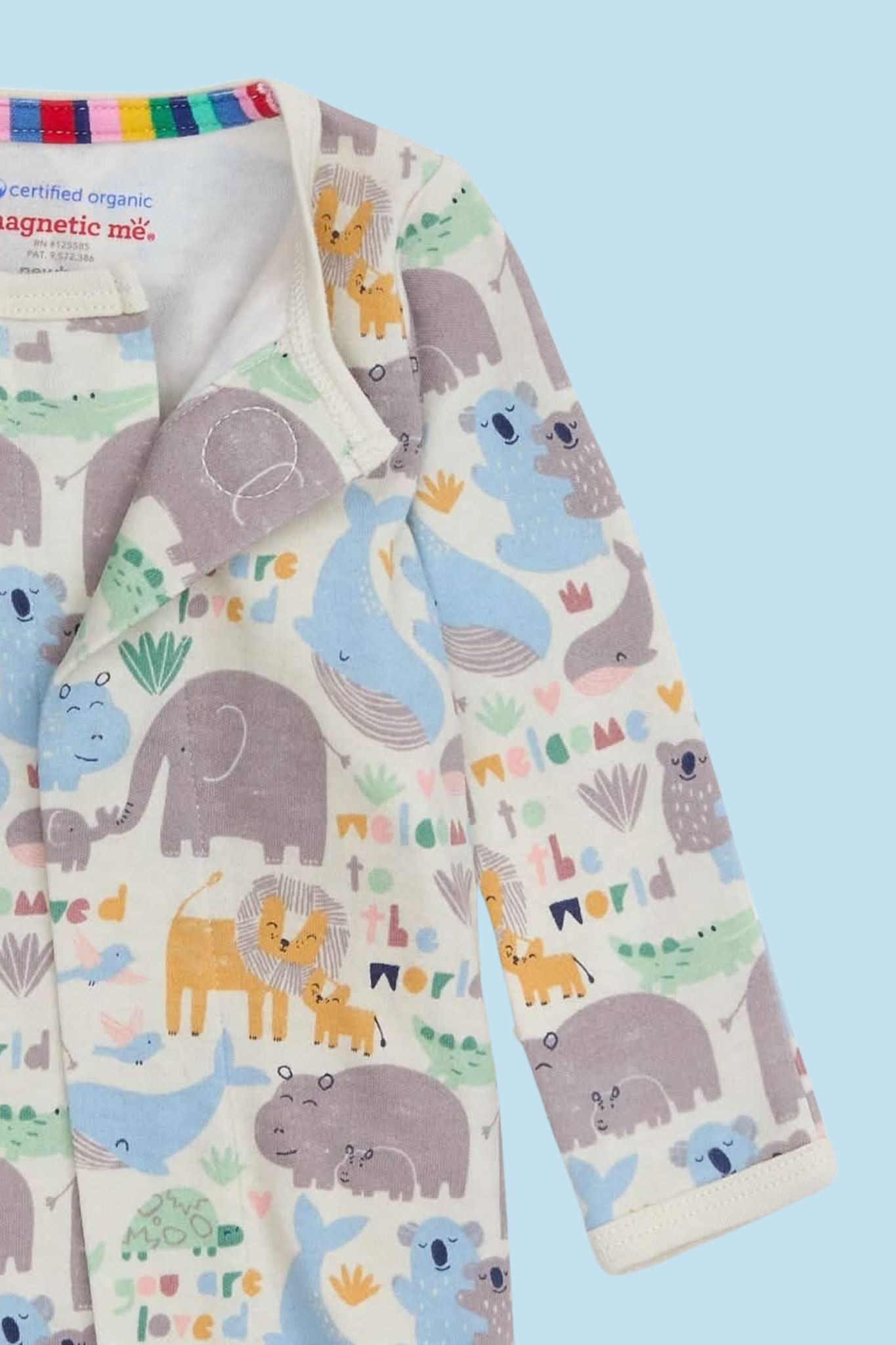 SewSafe™ magnetic closures make for easy dressing and changes. Magnets line the seam from the neck to upper thigh for sizes up to 0-3m & from neck to crotch for sizes 3-6m and up.