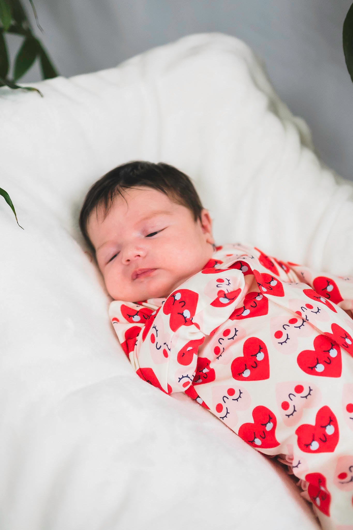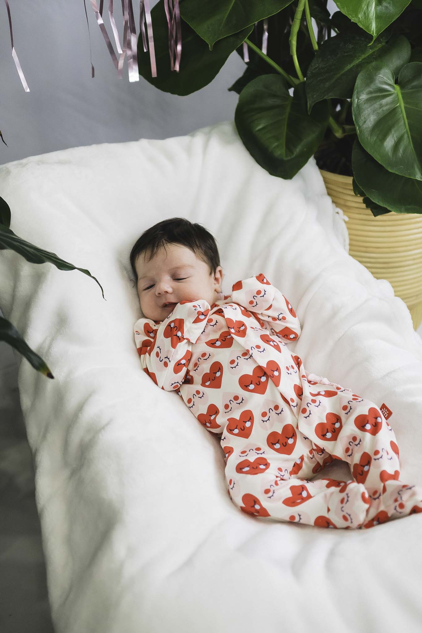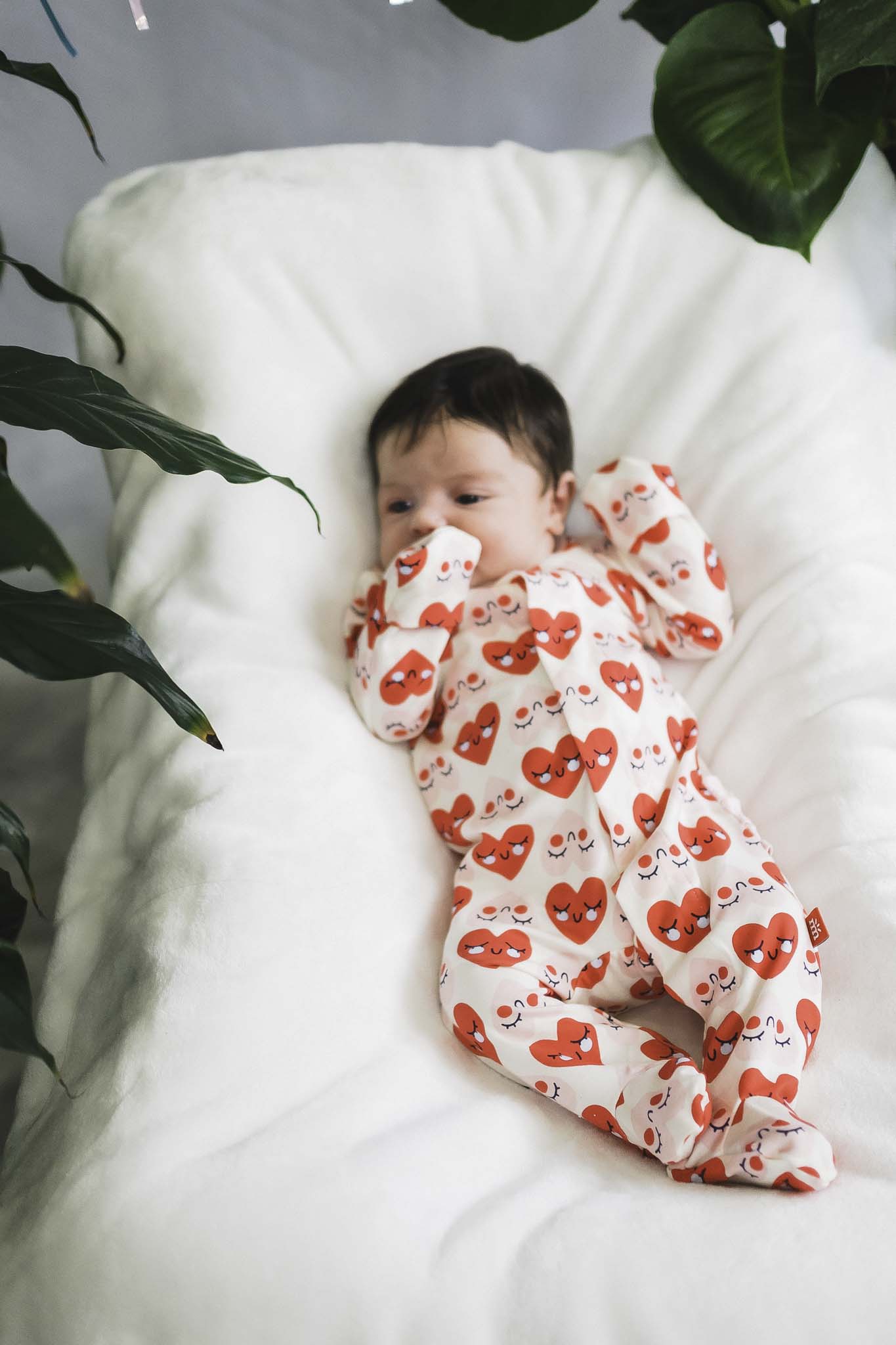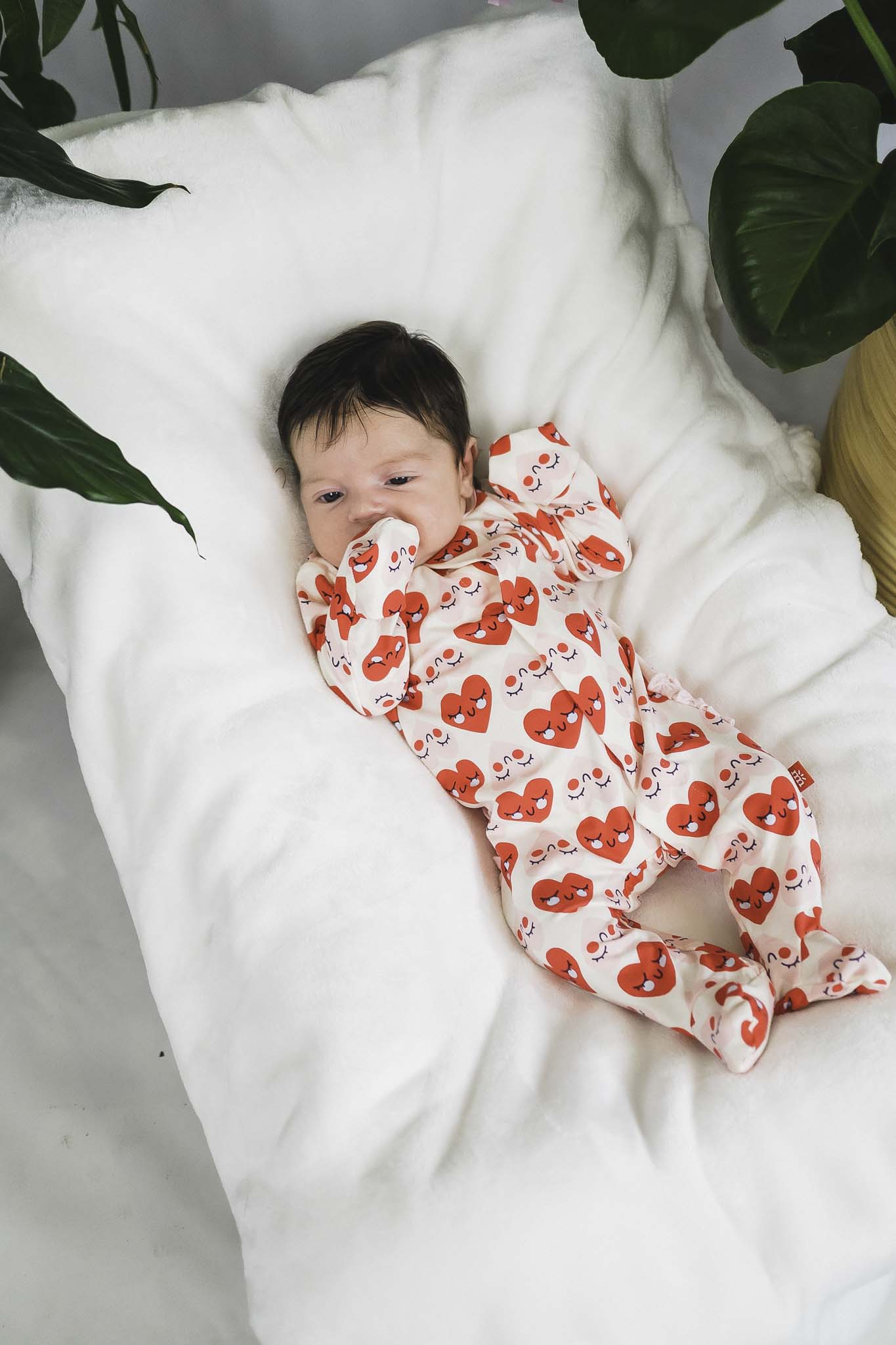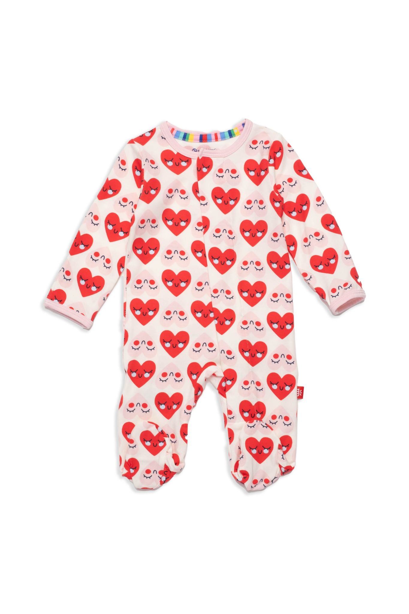 This Magnetic Me footie has hearts galore! It features long sleeves, magnetic closure, and an allover eyelash-adorned heart print.